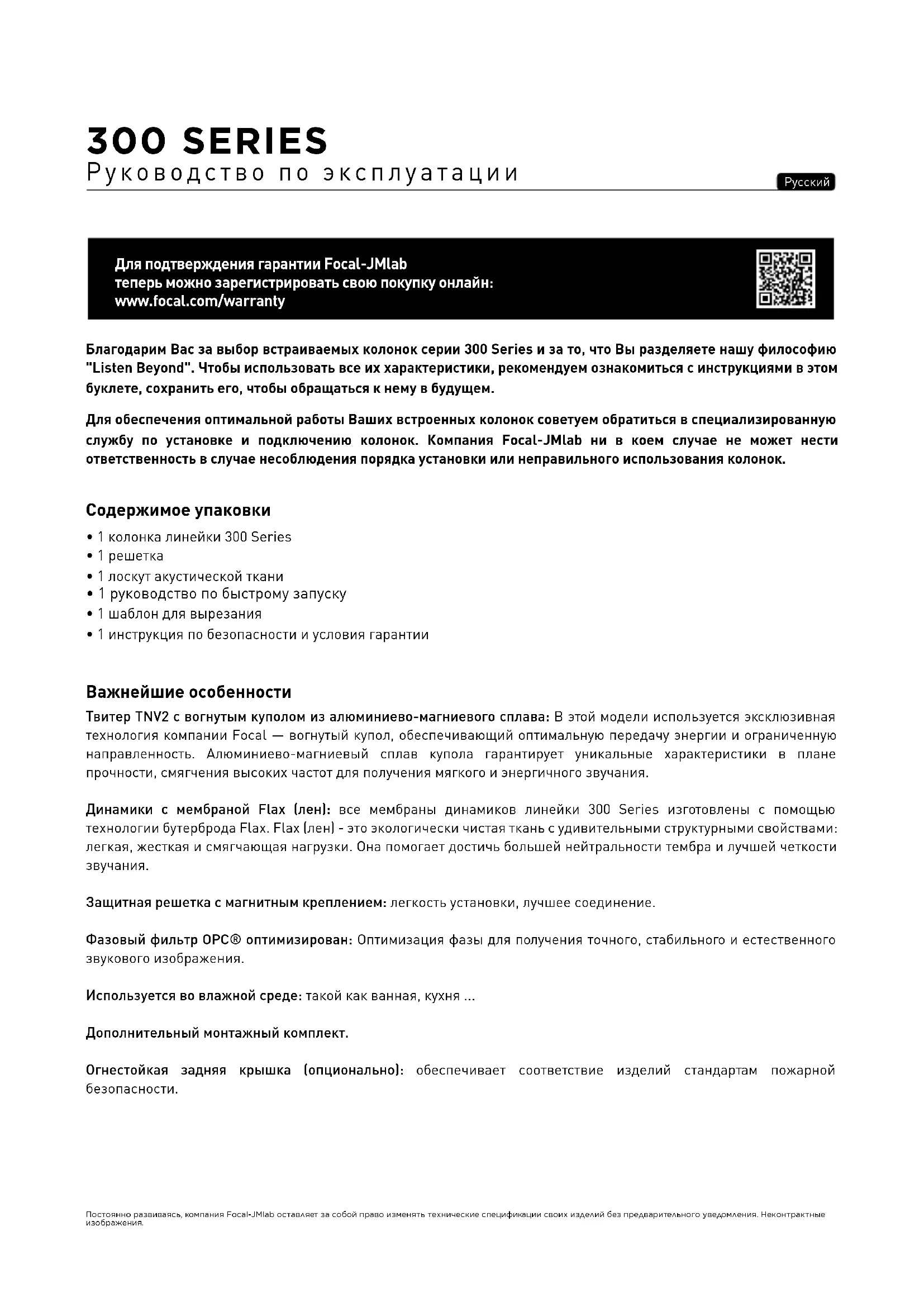 Если хотите, решетку можно покрасить, чтобы изделие гармонировало с Вашей обстановкой. Рекомендуем сначала снять решетку и покрасить ее распылителем. Использовать можно ту же краску, что и для стен (рис. E / F / G). Если Вы хотите покрасить потолок или стену, не снимая изделие, рекомендуем использовать защитный чехол, который входит в комплект. Он крепится на монтажной раме с помощью магнита (рис. E / F / G). Условия гарантии В случае возникновения проблем обращайтесь к своему дилеру компании Focal. Во Франции гарантия на любое оборудование Focal составляет 2 года со дня покупки и не подлежит передаче в случае перепродажи. В случае дефектного оборудования оно должен быть отправлено за Ваш счет в оригинальной упаковке дилеру, который проанализирует состояние оборудования и определит характер неисправности. Если оно находится на гарантии, оборудование Вам будет возвращено или заменено с оплаченной доставкой. В противном случае Вам будет предложена смета на ремонт. Гарантия не распространяется на повреждения, вызванные неправильным использованием или подключением (например, сгоревшие движущиеся катушки ...). За пределами Франции на оборудование марки Focal распространяется гарантия, условия которой устанавливаются на месте официальным дистрибьютором компании Focal каждой страны в соответствии с действующим законодательством на соответствующей территории. 300 SERIES Руководство по эксплуатации300 SERIES