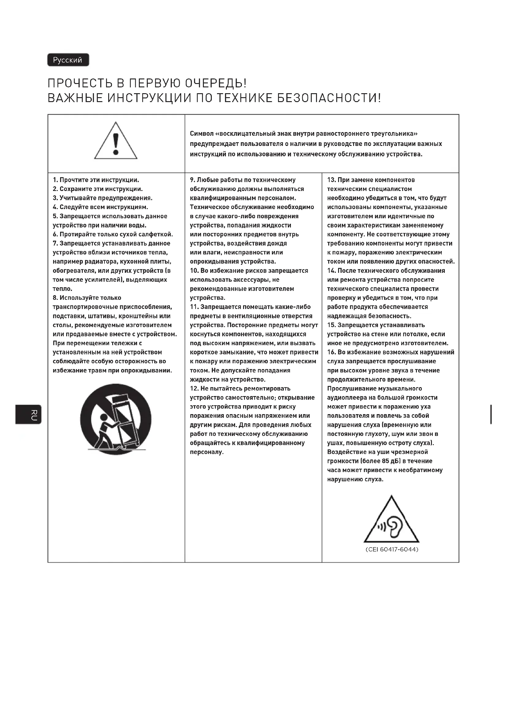 слуха запрещается прослушивание при высоком уровне звука в течение продолжительного времени. Прослушивание музыкального аудиоплеера на большой громкости может привести к поражению уха пользователя и повлечь за собой нарушения слуха (временную или постоянную глухоту, шум или звон в ушах, повышенную остроту слуха). Воздействие на уши чрезмерной громкости (более 85 дБ) в течение часа может привести к необратимому нарушению слуха. (CEI 60417-6044) ПРОЧЕСТЬ В ПЕРВУЮ ОЧЕРЕДЬ! ВАЖНЫЕ ИНСТРУКЦИИ ПО ТЕХНИКЕ БЕЗОПАСНОСТИ!