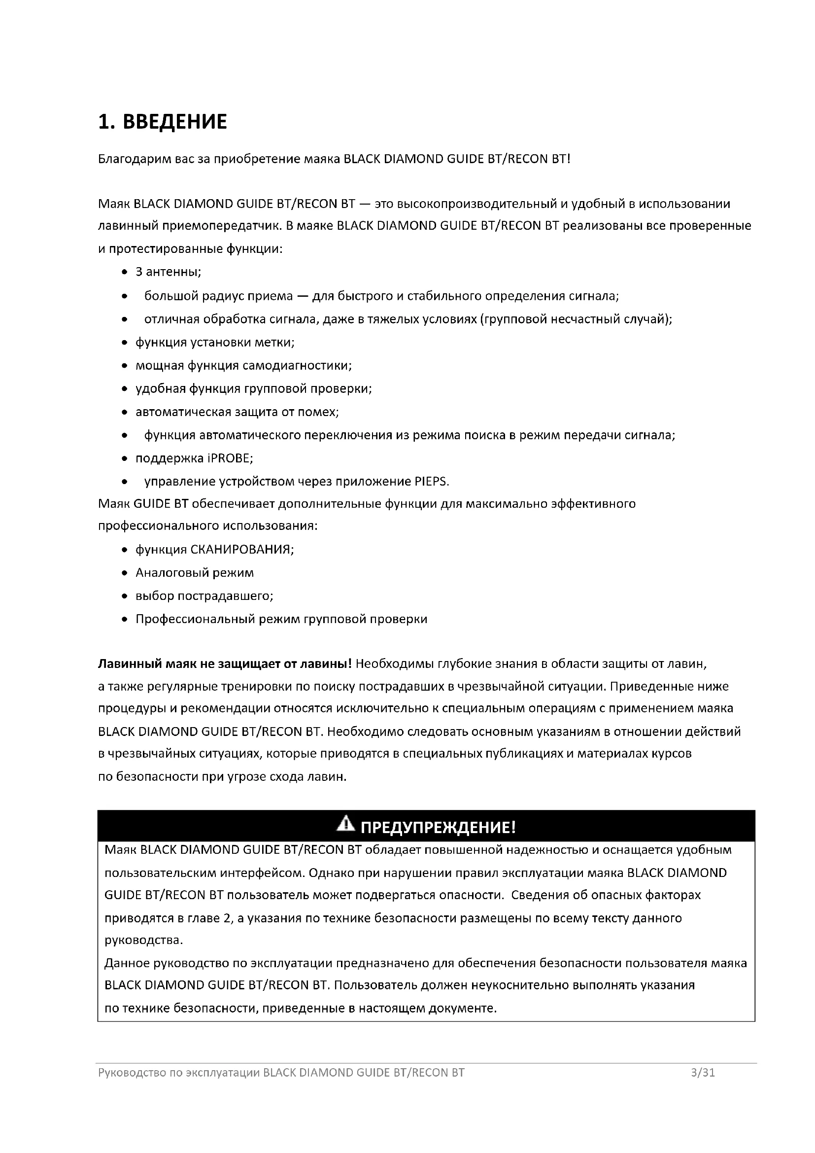 - Профессиональный режим групповой проверки Лавинный маяк не защищает от лавины! Необходимы глубокие знания в области защиты от лавин, а также регулярные тренировки по поиску пострадавших в чрезвычайной ситуации. Приведенные ниже процедуры и рекомендации относятся исключительно к специальным операциям с применением маяка BLACK DIAMOND GUIDE BT/RECON BT. Необходимо следовать основным указаниям в отношении действий в чрезвычайных ситуациях, которые приводятся в специальных публикациях и материалах курсов по безопасности при угрозе схода лавин. ПРЕДУПРЕЖДЕНИЕ! Маяк BLACK DIAMOND GUIDE BT/RECON BT обладает повышенной надежностью и оснащается удобным пользовательским интерфейсом. Однако при нарушении правил эксплуатации маяка BLACK DIAMOND GUIDE BT/RECON BT пользователь может подвергаться опасности. Сведения об опасных факторах приводятся в главе 2, а указания по технике безопасности размещены по всему тексту данного руководства. Данное руководство по эксплуатации предназначено для обеспечения безопасности пользователя маяка BLACK DIAMOND GUIDE BT/RECON BT. Пользователь должен неукоснительно выполнять указания по технике безопасности, приведенные в настоящем документе.Руководство по эксплуатации BLACK DIAMOND GUIDE BT/RECON BT 4/31 Перед началом эксплуатации маяка BLACK DIAMOND GUIDE BT/RECON BT необходимо изучить и усвоить информацию, приведенную в данном руководстве по эксплуатации. Компания Black Diamond Equipment не несет ответственности за технические неточности и опечатки, допущенные в настоящем документе, и не принимает претензий относительно прямого или косвенного ущерба, возникшего во время транспортировки или использования данного руководства, а также в результате использования сведений, приведенных в данном руководстве.