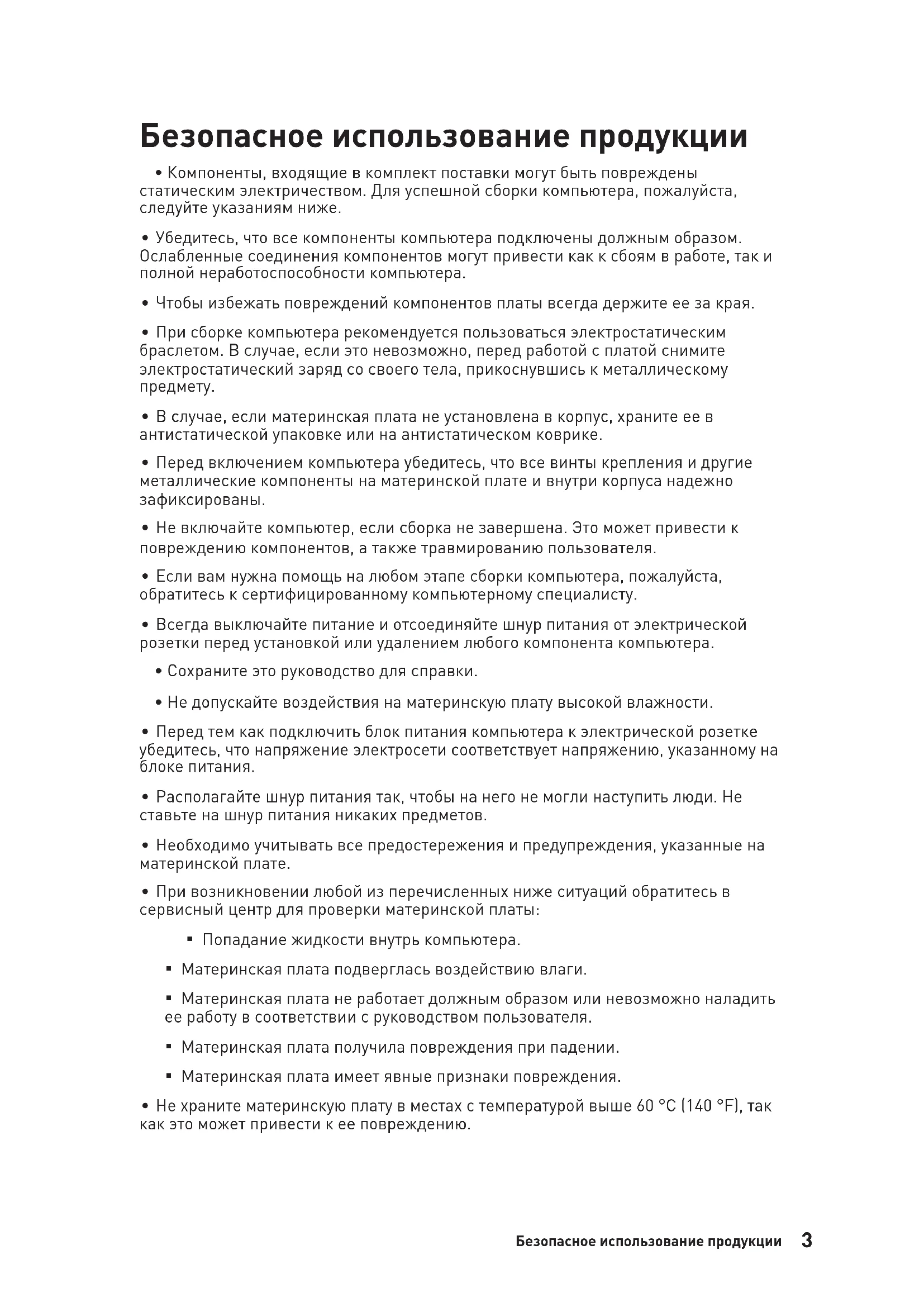 ∙ В случае, если материнская плата не установлена в корпус, храните ее в антистатической упаковке или на антистатическом коврике. ∙ Перед включением компьютера убедитесь, что все винты крепления и другие металлические компоненты на материнской плате и внутри корпуса надежно зафиксированы. ∙ Не включайте компьютер, если сборка не завершена. Это может привести к повреждению компонентов, а также травмированию пользователя. ∙ Если вам нужна помощь на любом этапе сборки компьютера, пожалуйста, обратитесь к сертифицированному компьютерному специалисту. ∙ Всегда выключайте питание и отсоединяйте шнур питания от электрической розетки перед установкой или удалением любого компонента компьютера. ∙ Сохраните это руководство для справки. ∙ Не допускайте воздействия на материнскую плату высокой влажности. ∙ Перед тем как подключить блок питания компьютера к электрической розетке убедитесь, что напряжение электросети соответствует напряжению, указанному на блоке питания. ∙ Располагайте шнур питания так, чтобы на него не могли наступить люди. Не ставьте на шнур питания никаких предметов. ∙ Необходимо учитывать все предостережения и предупреждения, указанные на материнской плате. ∙ При возникновении любой из перечисленных ниже ситуаций обратитесь в сервисный центр для проверки материнской платы: