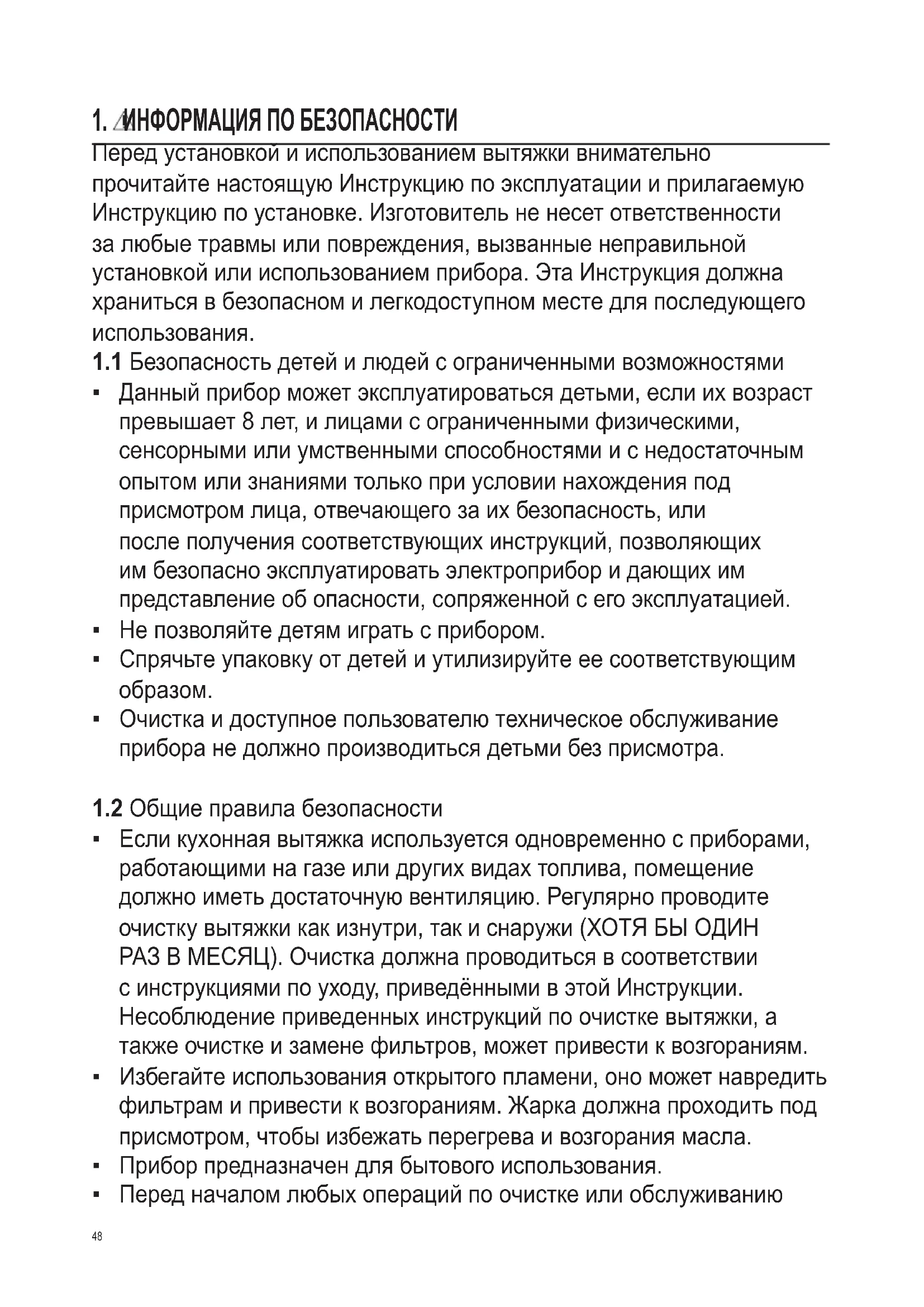 - Если кухонная вытяжка используется одновременно с приборами, работающими на газе или других видах топлива, помещение должно иметь достаточную вентиляцию. Регулярно проводите очистку вытяжки как изнутри, так и снаружи (ХОТЯ БЫ ОДИН РАЗ В МЕСЯЦ). Очистка должна проводиться в соответствии с инструкциями по уходу, приведёнными в этой Инструкции. Несоблюдение приведенных инструкций по очистке вытяжки, а также очистке и замене фильтров, может привести к возгораниям.