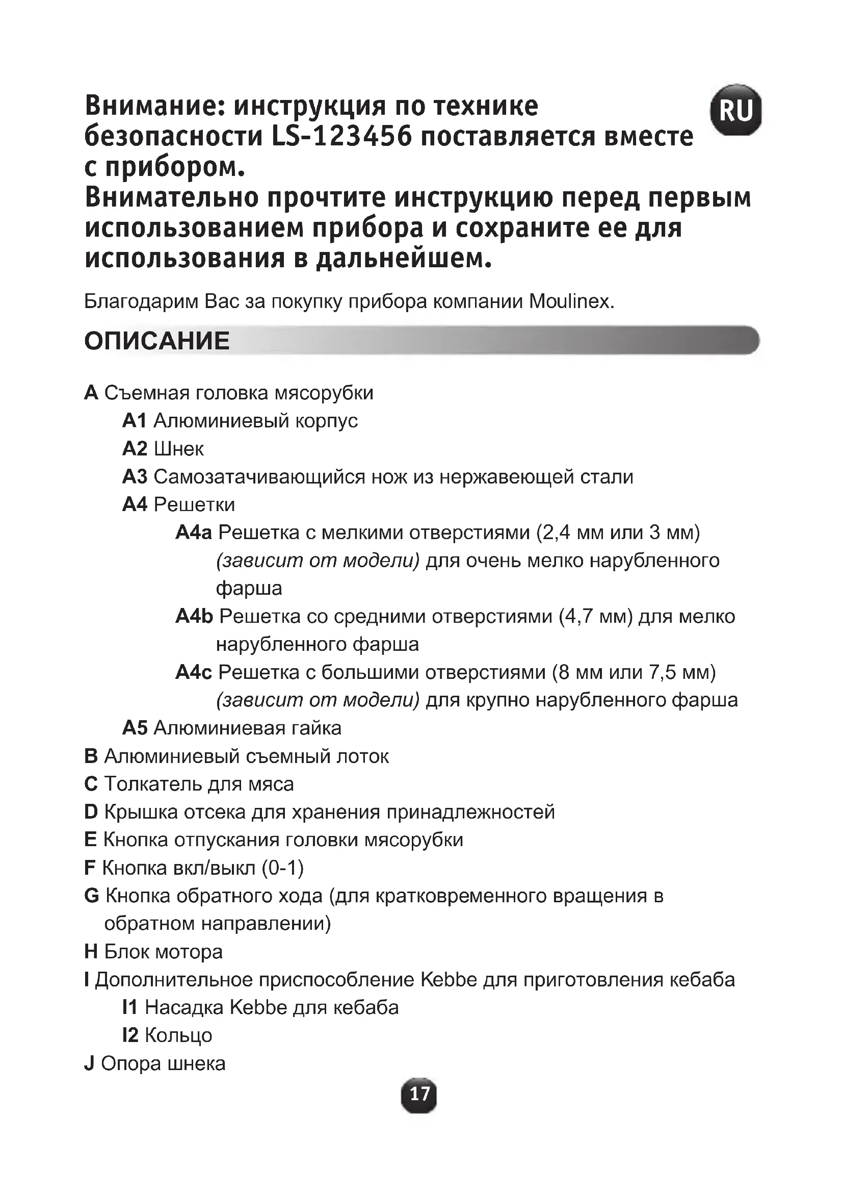 Внимание: инструкция по технике безопасности LS-123456 поставляется вместе с прибором. Внимательно прочтите инструкцию перед первым использованием прибора и сохраните ее для использования в дальнейшем. Благодарим Вас за покупку прибора компании Moulinex.