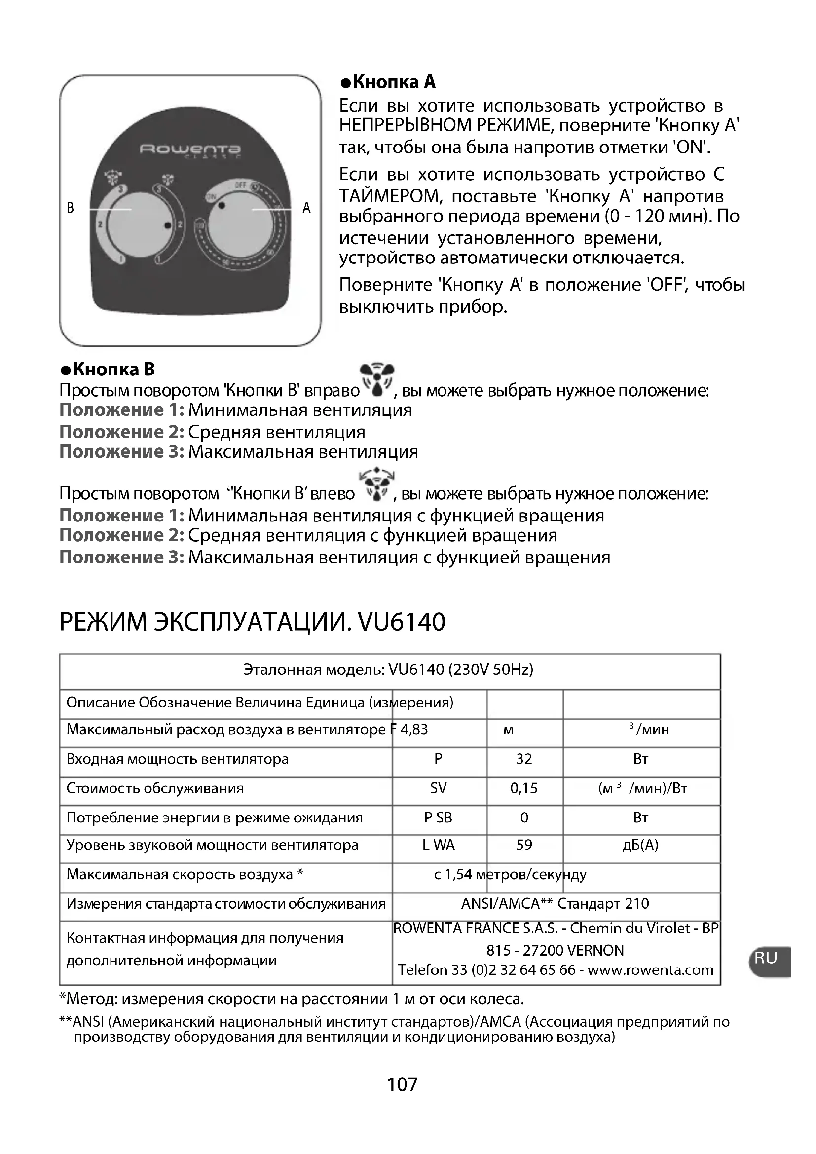 Потребление энергии в режиме ожидания P SB 0 Вт Уровень звуковой мощности вентилятора L WA 59 дБ(A) Максимальная скорость воздуха * c 1,54 метров/секунду Измерения стандарта стоимости обслуживания ANSI/AMCA** Стандарт 210 Контактная информация для получения дополнительной информации ROWENTA FRANCE S.A.S. - Chemin du Virolet - BP