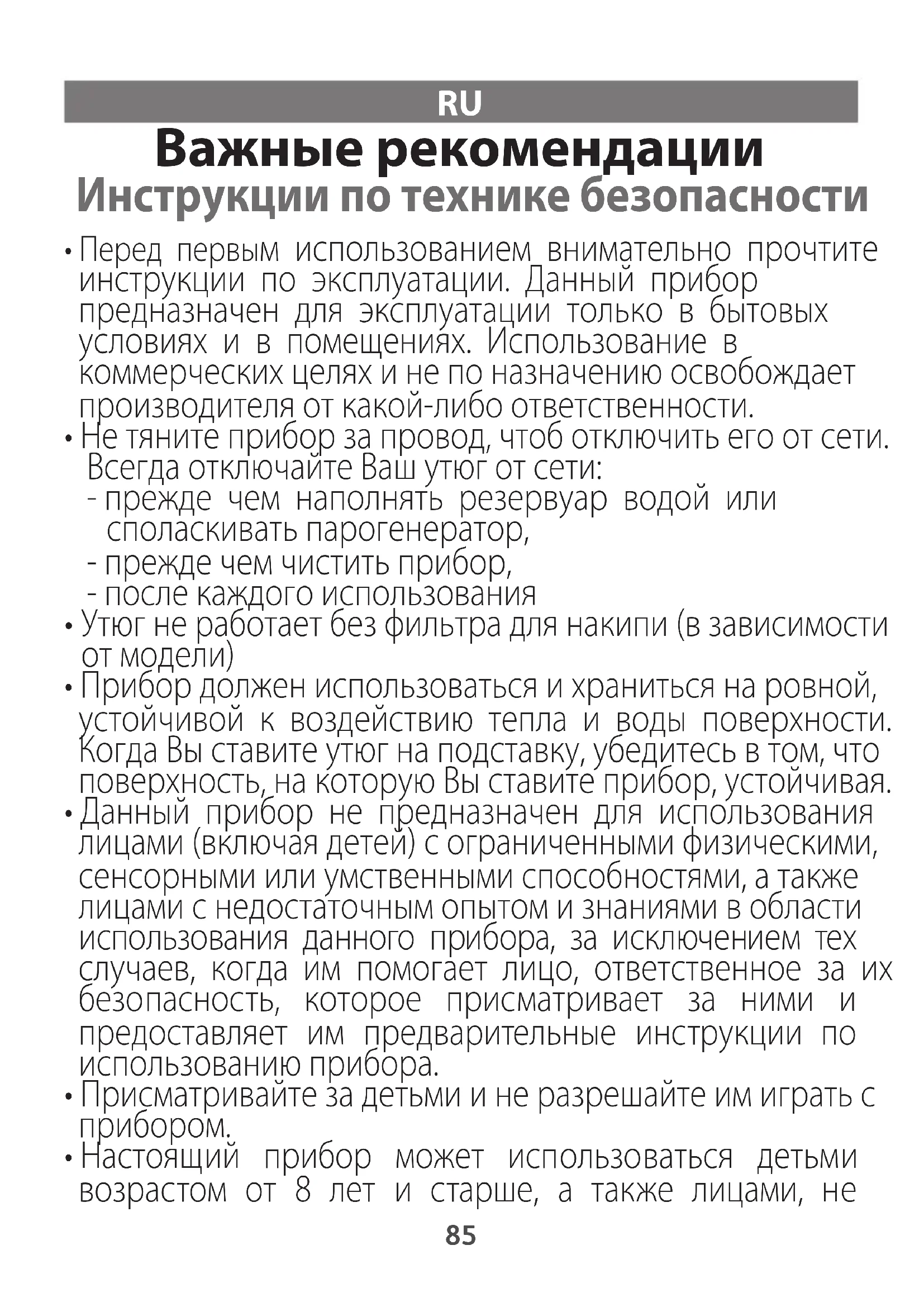 1800139811-STEAM-STATIONS-SAFETIES-V6.qxp_110x154 01/06/2016 15:21 Page85имеющими достаточно опыта в использовании данного прибора и людьми с ограниченными физическими, сенсорными и умственными способностями при условии, что они получили предварительные инструкции об использовании прибора и осознают риски, связанные с ним. Не давайте детям играть с прибором. Не разрешайте детям чистить и обслуживать прибор без присмотра. Держите горячий или включенный в сеть утюг и провод вне досягаемости для детей младше 8 лет.