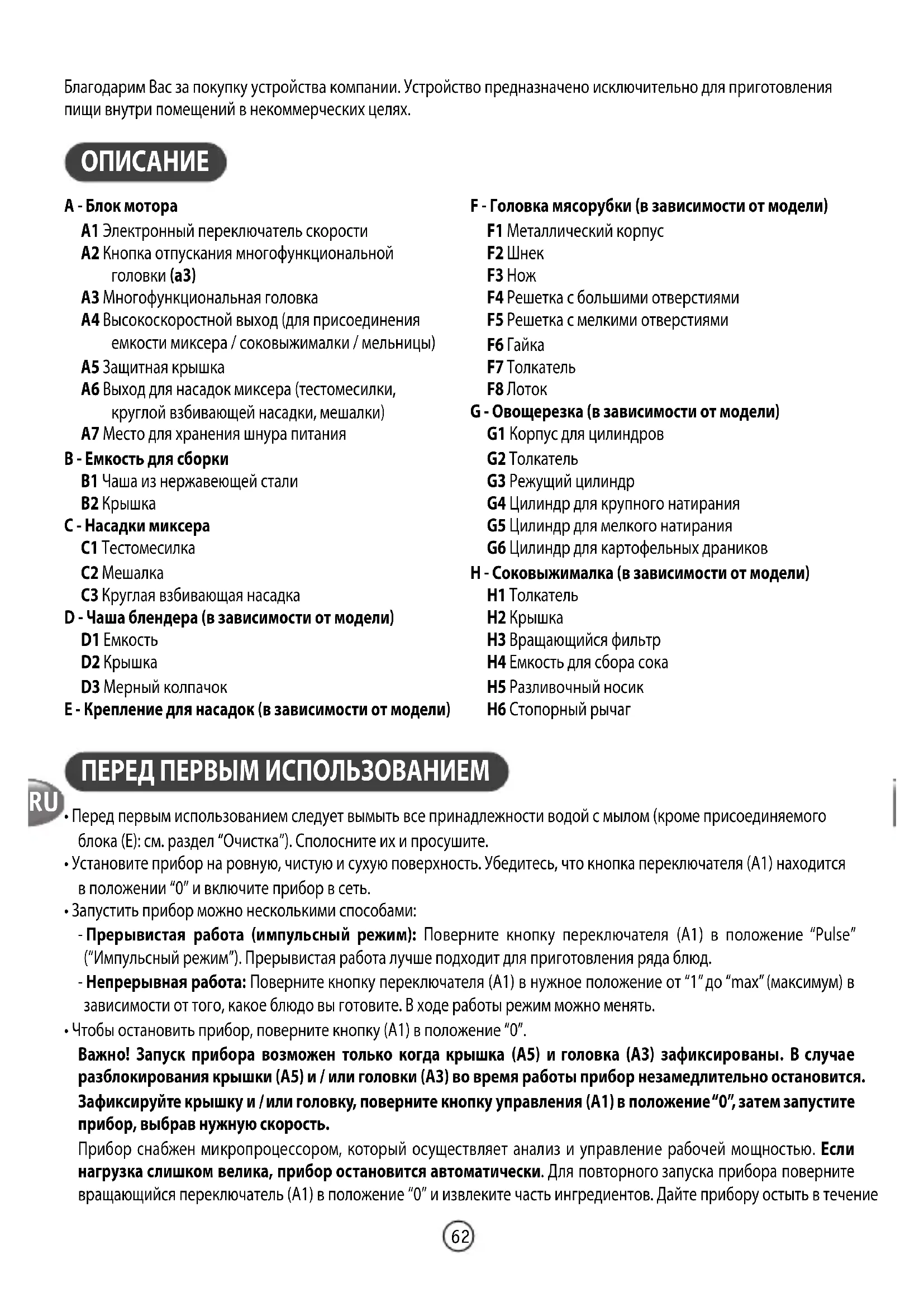 A - Блок мотора A1 Электронный переключатель скорости A2 Кнопка отпускания многофункциональной головки (a3) A3 Многофункциональная головка A4 Высокоскоростной выход (для присоединения емкости миксера / соковыжималки / мельницы) A5 Защитная крышка A6 Выход для насадок миксера (тестомесилки, круглой взбивающей насадки, мешалки) A7 Место для хранения шнура питания B - Емкость для сборки B1 Чаша из нержавеющей стали B2 Крышка C - Насадки миксера C1 Тестомесилка C2 Мешалка C3 Круглая взбивающая насадка D - Чаша блендера (в зависимости от модели) D1 Емкость D2 Крышка D3 Мерный колпачок E - Крепление для насадок (в зависимости от модели) F - Головка мясорубки (в зависимости от модели) F1 Металлический корпус F2 Шнек F3 Нож F4 Решетка с большими отверстиями F5 Решетка с мелкими отверстиями F6 Гайка F7 Толкатель F8 Лоток G - Овощерезка (в зависимости от модели) G1 Корпус для цилиндров G2 Толкатель G3 Режущий цилиндр G4 Цилиндр для крупного натирания G5 Цилиндр для мелкого натирания G6 Цилиндр для картофельных драников H - Соковыжималка (в зависимости от модели) H1 Толкатель H2 Крышка H3 Вращающийся фильтр H4 Емкость для сбора сока H5 Разливочный носик H6 Стопорный рычаг ПЕРЕД ПЕРВЫМ ИСПОЛЬЗОВАНИЕМ