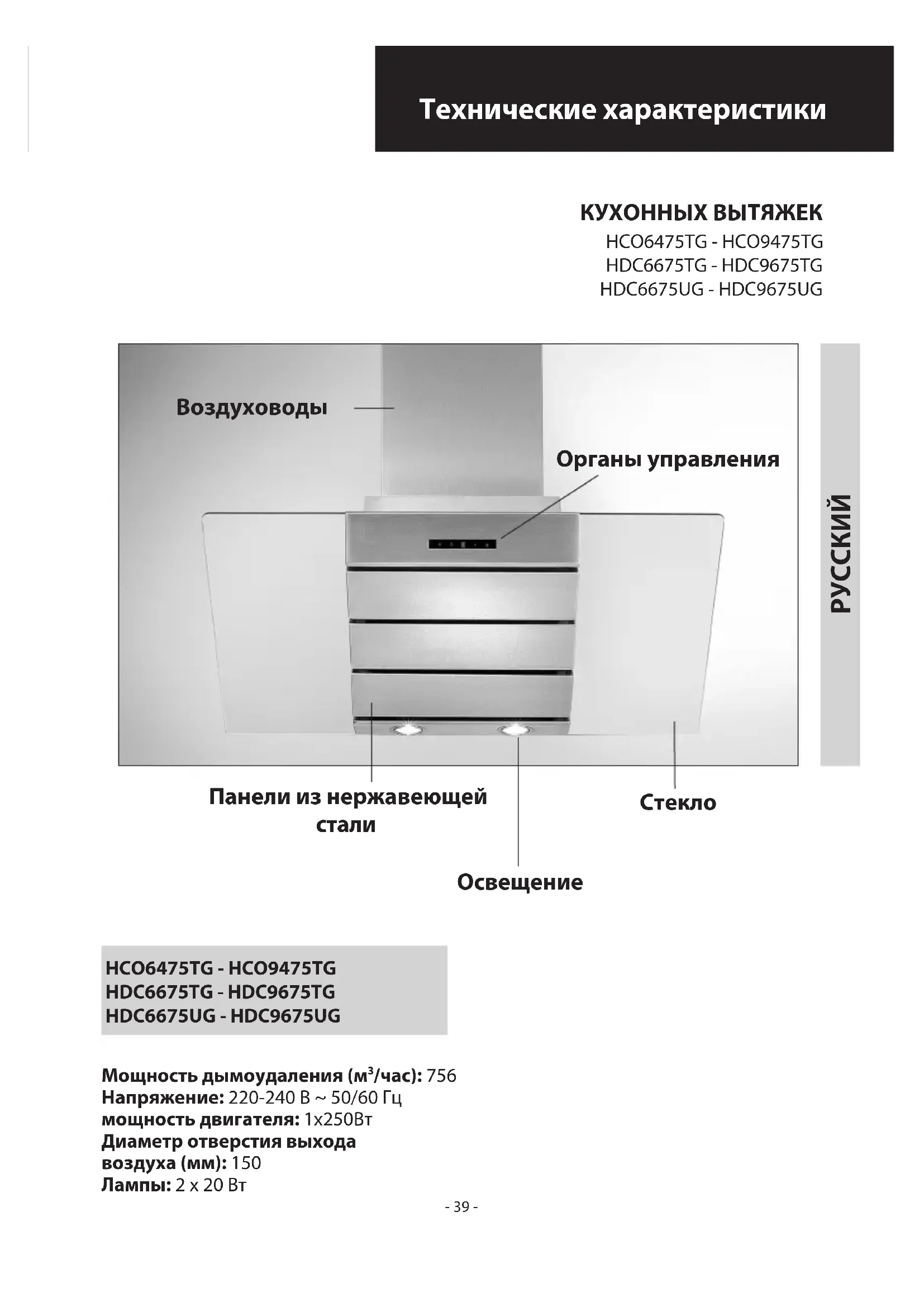 /час): 756 Напряжение: 220-240 В ~ 50/60 Гц мощность двигателя: 1x250Вт Диаметр отверстия выхода воздуха (мм): 150 Лампы: 2 х 20 Вт