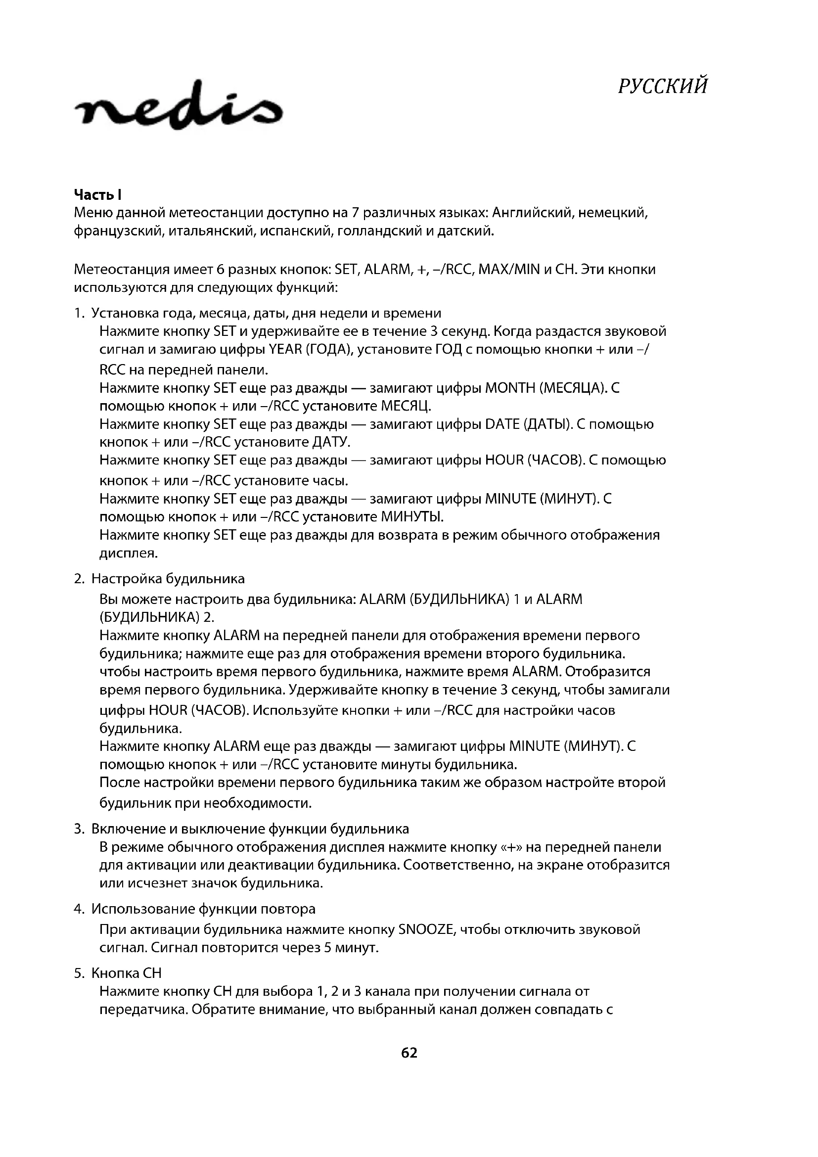 Часть I Меню данной метеостанции доступно на 7 различных языках: Английский, немецкий, французский, итальянский, испанский, голландский и датский. Метеостанция имеет 6 разных кнопок: SET, ALARM, +, –/RCC, MAX/MIN и CH. Эти кнопки используются для следующих функций: