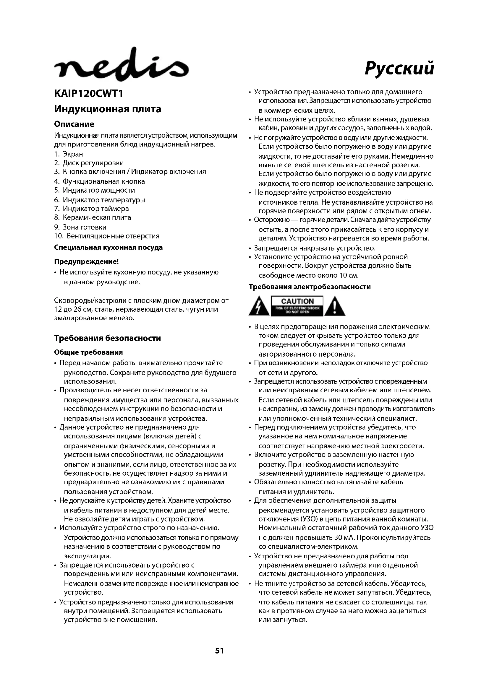 - Не используйте кухонную посуду, не указанную вданном руководстве. Сковороды/кастрюли с плоским дном диаметром от 12до 26см, сталь, нержавеющая сталь, чугун или эмалированное железо. Требования безопасности Общие требования