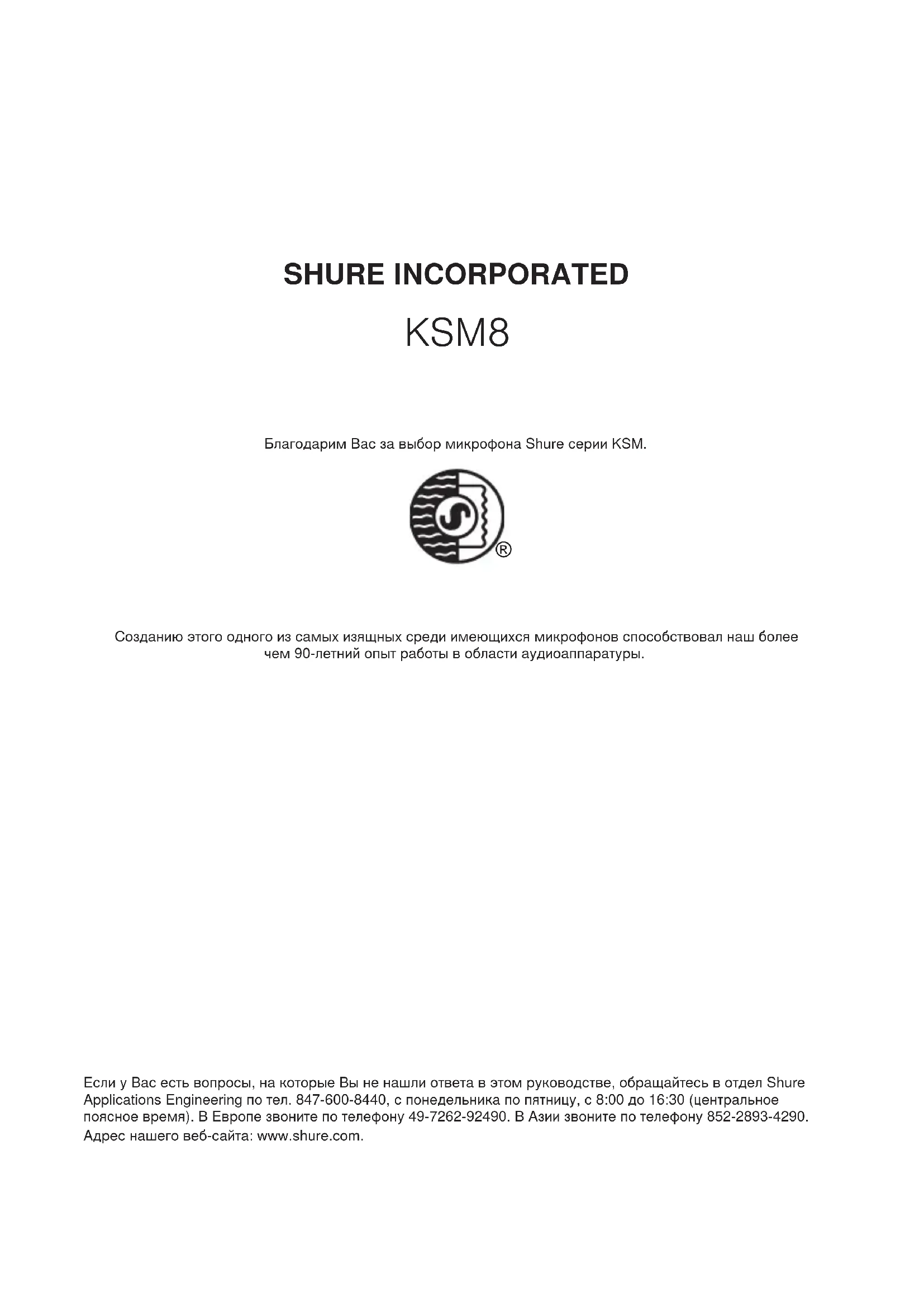 Созданию этого одного из самых изящных среди имеющихся микрофонов способствовал наш более чем 90-летний опыт работы в области аудиоаппаратуры. Если у Вас есть вопросы, на которые Вы не нашли ответа в этом руководстве, обращайтесь в отдел Shure Applications Engineering по тел. 847-600-8440, с понедельника по пятницу, с 8:00 до 16:30 (центральное поясное время). В Европе звоните по телефону 49-7262-92490. В Азии звоните по телефону 852-2893-4290. Адрес нашего веб-сайта: www.shure.com.38 Микрофон KSM8 Dualdyne™ Общее описание Микрофон Shure KSM8 Dualdyne™ — это первый в мире двухдиафрагменный ручной динамический микрофон, предназначенный для профессионального применения при записи вокальных исполнений в ходе живых выступлений и при записи в студии. Компания Shure вывела технологии и характеристики динамических микрофонов на качественно новый уровень с созданием первоклассного микрофона KSM8 Dualdyne. Достижение повышенного уровня выходного сигнала и беспрецедентное сведение к минимуму эффекта близости, позволяет микрофону выводить чистый, детализированный сигнал с минимальной обратной связью. Благодаря современному производству из компонентов высокого качества каждый микрофон KSM8 Dualdyne успешно проходит тщательную проверку на соответствие высоким стандартам качества конструкции Shure мирового класса даже в самых сложных концертных условиях. Варианты модели Микрофон KSM8 доступен с черной или обработанной никелевой отделкой. Микрофон можно также приобрести в составе беспроводной системы Shure или как обновление имеющегося беспроводного ручного передатчика. KSM8/B: высококачественный двухдиафрагменный динамический микрофон с черной отделкой. KSM8/N: высококачественный двухдиафрагменный динамический микрофон с обработанной никелевой