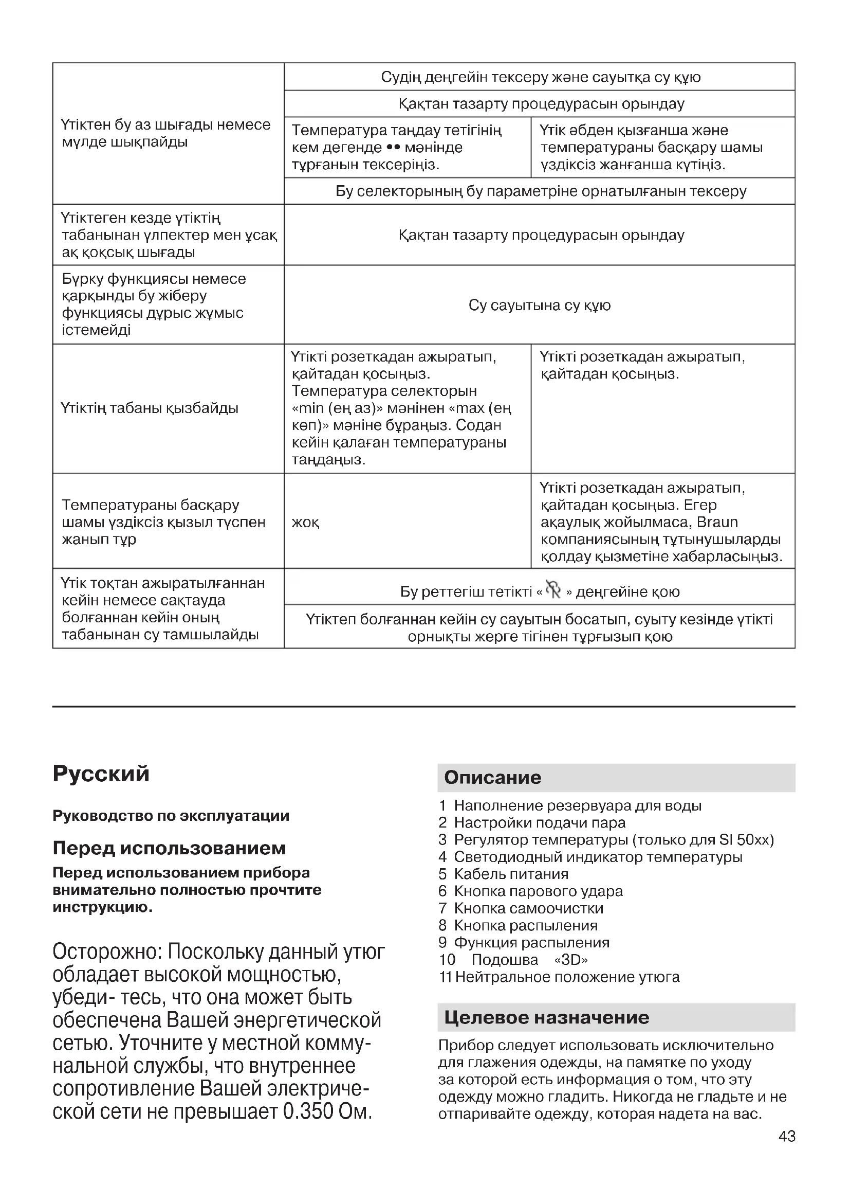 Руководство по эксплуатации Перед использованием Перед использованием прибора внимательно полностью прочтите инструкцию. Осторожно: Поскольку данный утюг обладает высокой мощностью, убеди- тесь, что она может быть обеспечена Вашей энергетической сетью. Уточните у местной комму- нальной службы, что внутреннее сопротивление Вашей электриче- ской сети не превышает 0.350 Ом.