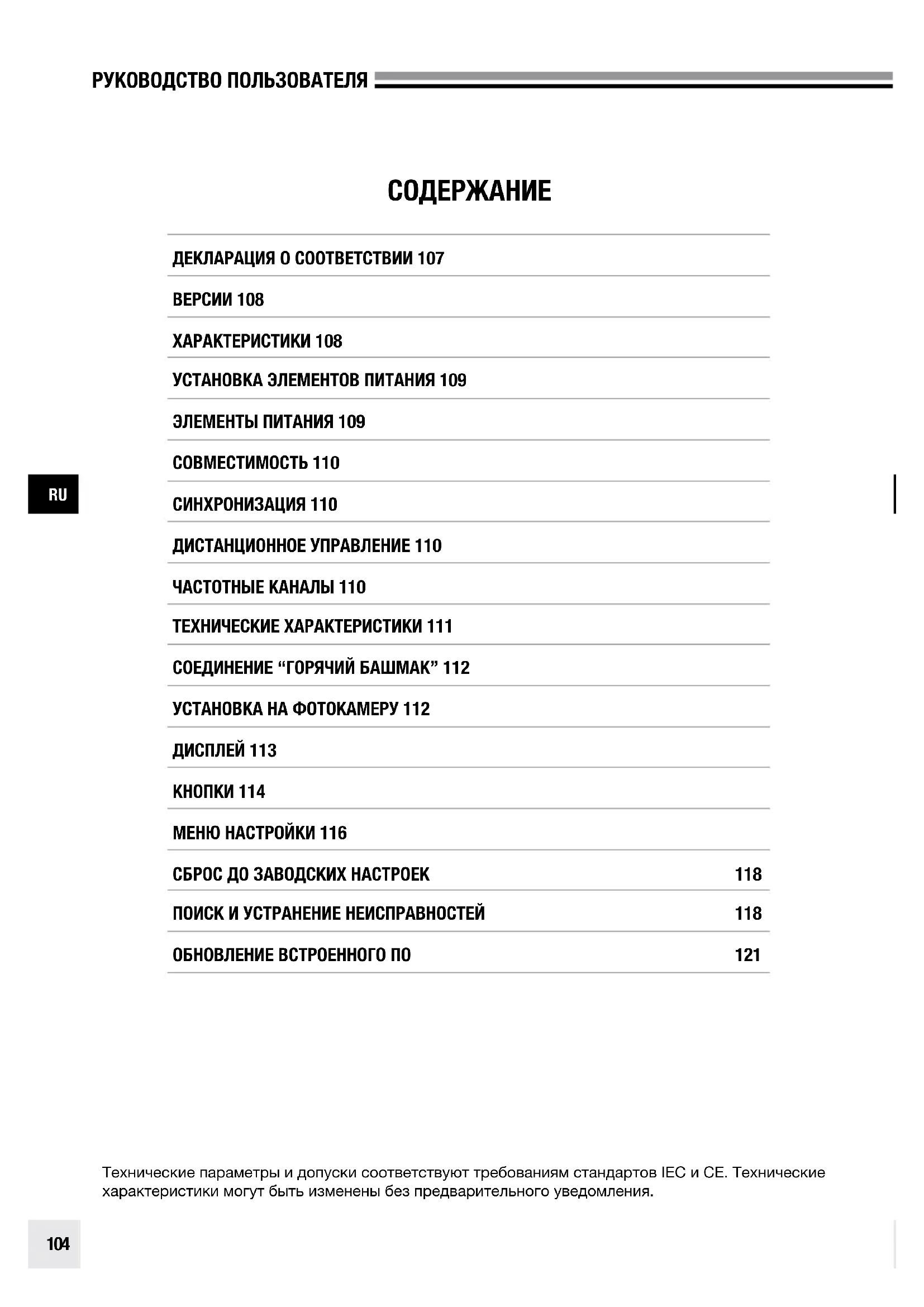 ДЕКЛАРАЦИЯ О СООТВЕТСТВИИ 107 ВЕРСИИ 108 ХАРАКТЕРИСТИКИ 108 УСТАНОВКА ЭЛЕМЕНТОВ ПИТАНИЯ 109 ЭЛЕМЕНТЫ ПИТАНИЯ 109 СОВМЕСТИМОСТЬ 110 СИНХРОНИЗАЦИЯ 110 ДИСТАНЦИОННОЕ УПРАВЛЕНИЕ 110 ЧАСТОТНЫЕ КАНАЛЫ 110 ТЕХНИЧЕСКИЕ ХАРАКТЕРИСТИКИ 111 СОЕДИНЕНИЕ “ГОРЯЧИЙ БАШМАК” 112 УСТАНОВКА НА ФОТОКАМЕРУ 112 ДИСПЛЕЙ 113 КНОПКИ 114 МЕНЮ НАСТРОЙКИ 116 СБРОС ДО ЗАВОДСКИХ НАСТРОЕК 118 ПОИСК И УСТРАНЕНИЕ НЕИСПРАВНОСТЕЙ 118 ОБНОВЛЕНИЕ ВСТРОЕННОГО ПО 121 Технические параметры и допуски соответствуют требованиям стандартов IEC и CE. Технические характеристики могут быть изменены без предварительного уведомления.РУКОВОДСТВО ПОЛЬЗОВАТЕЛЯ