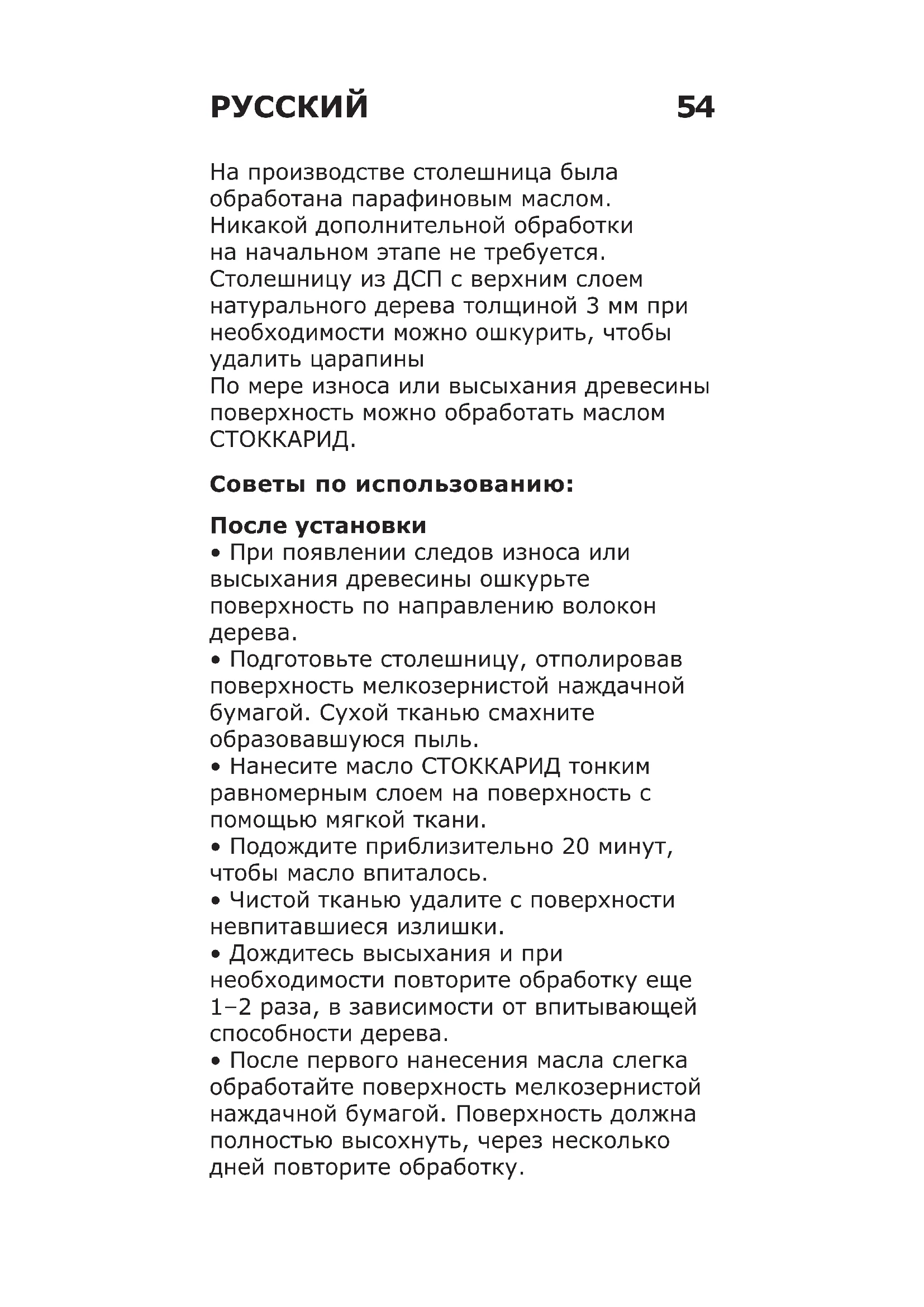 - После первого нанесения масла слегка обработайте поверхность мелкозернистой наждачной бумагой. Поверхность должна полностью высохнуть, через несколько дней повторите обработку. РУССКИЙ55 Уходиобслуживание