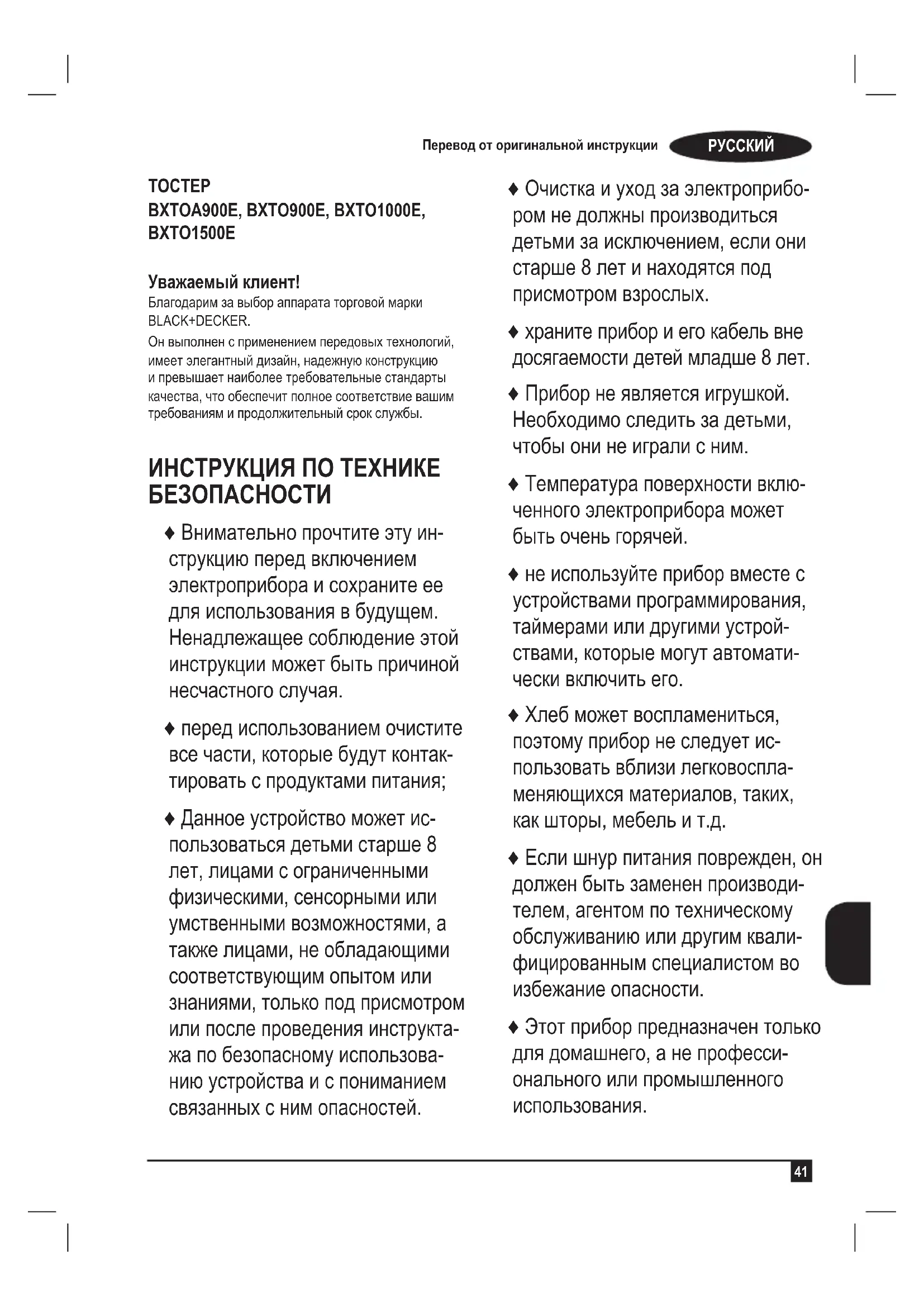 BXTOA900E, BXTO900E, BXTO1000E, BXTO1500E Уважаемый клиент! Благодарим за выбор аппарата торговой марки BLACK+DECKER. Он выполнен с применением передовых технологий, имеет элегантный дизайн, надежную конструкцию и превышает наиболее требовательные стандарты качества, что обеспечит полное соответствие вашим требованиям и продолжительный срок службы. ИНСТРУКЦИЯ ПО ТЕХНИКЕ БЕЗОПАСНОСТИ ♦ Внимательно прочтите эту ин- струкцию перед включением электроприбора и сохраните ее для использования в будущем. Ненадлежащее соблюдение этой инструкции может быть причиной несчастного случая. ♦ перед использованием очистите все части, которые будут контак- тировать с продуктами питания; ♦ Данное устройство может ис- пользоваться детьми старше 8 лет, лицами с ограниченными физическими, сенсорными или умственными возможностями, а также лицами, не обладающими соответствующим опытом или знаниями, только под присмотром или после проведения инструкта- жа по безопасному использова- нию устройства и с пониманием связанных с ним опасностей. ♦ Очистка и уход за электроприбо- ром не должны производиться детьми за исключением, если они старше 8 лет и находятся под присмотром взрослых. ♦ храните прибор и его кабель вне досягаемости детей младше 8 лет. ♦ Прибор не является игрушкой. Необходимо следить за детьми, чтобы они не играли с ним. ♦ Температура поверхности вклю- ченного электроприбора может быть очень горячей. ♦ не используйте прибор вместе с устройствами программирования, таймерами или другими устрой- ствами, которые могут автомати- чески включить его. ♦ Хлеб может воспламениться, поэтому прибор не следует ис- пользовать вблизи легковоспла- меняющихся материалов, таких, как шторы, мебель и т.д. ♦ Если шнур питания поврежден, он должен быть заменен производи- телем, агентом по техническому обслуживанию или другим квали- фицированным специалистом во избежание опасности. ♦ Этот прибор предназначен только для домашнего, а не професси- онального или промышленного использования.РУССКИЙ Перевод от оригинальной инструкции