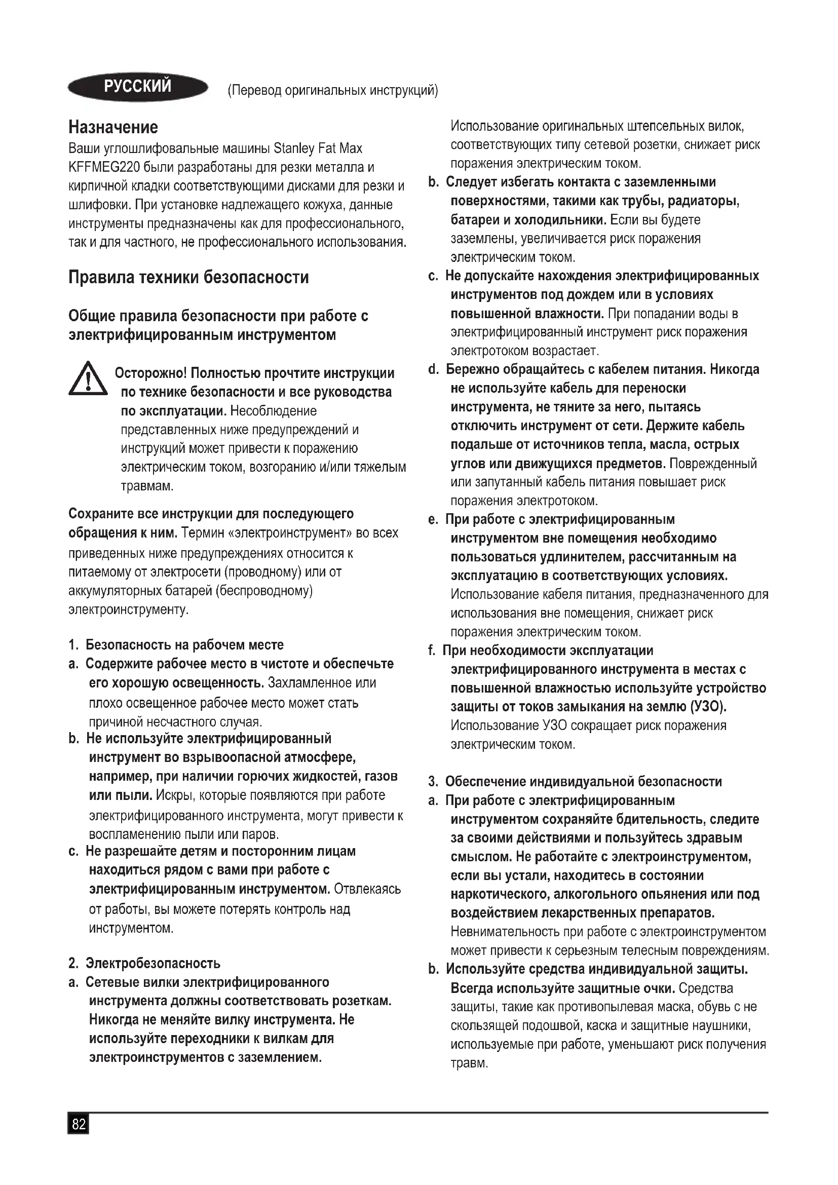 Ваши углошлифовальные машины Stanley Fat Max KFFMEG220 были разработаны для резки металла и кирпичной кладки соответствующими дисками для резки и шлифовки. При установке надлежащего кожуха, данные инструменты предназначены как для профессионального, так и для частного, не профессионального использования. Правила техники безопасности Общие правила безопасности при работе с электрифицированным инструментом
