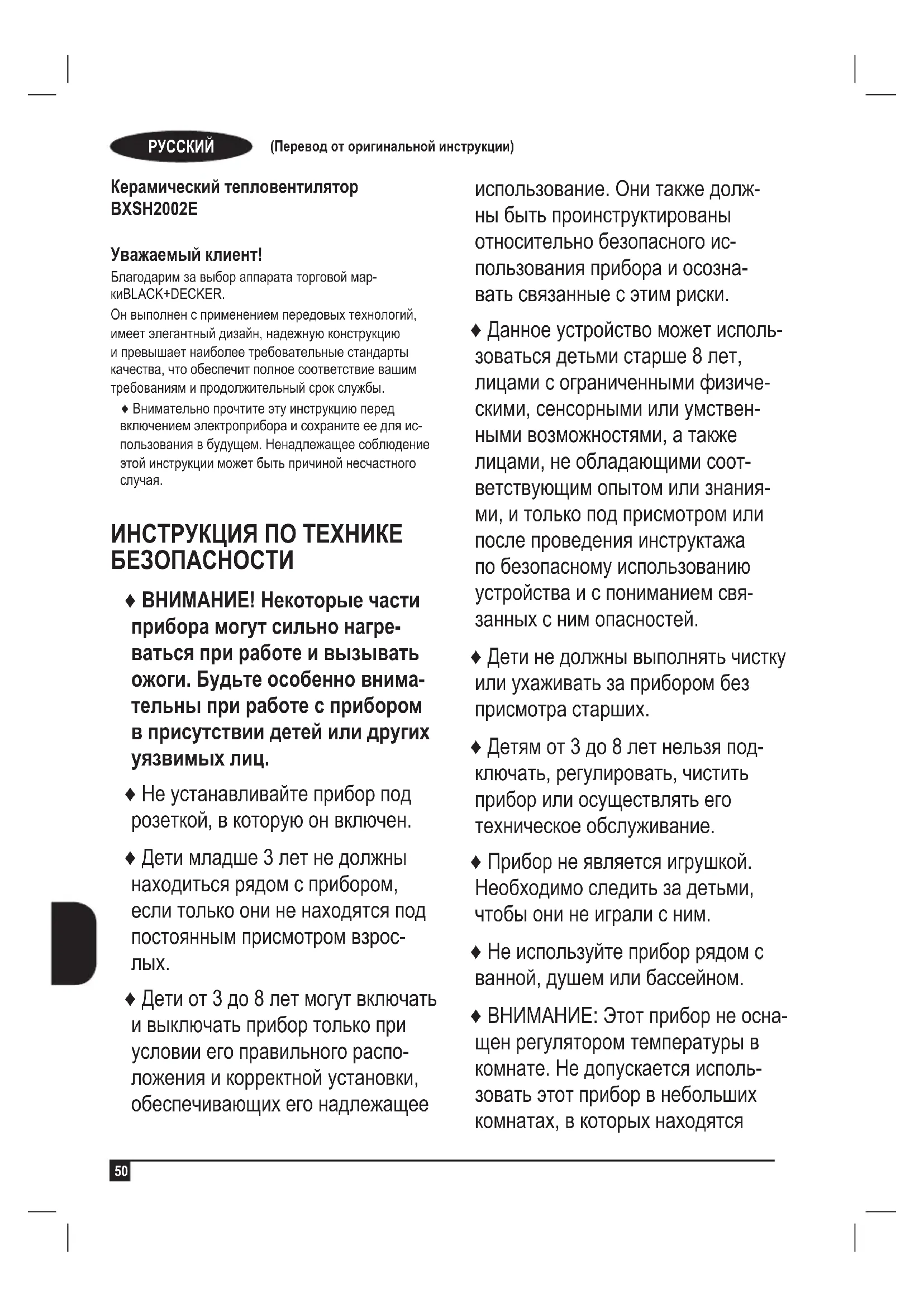 Керамический тепловентилятор BXSH2002E Уважаемый клиент! Благодарим за выбор аппарата торговой мар- киBLACK+DECKER. Он выполнен с применением передовых технологий, имеет элегантный дизайн, надежную конструкцию и превышает наиболее требовательные стандарты качества, что обеспечит полное соответствие вашим требованиям и продолжительный срок службы. ♦ Внимательно прочтите эту инструкцию перед включением электроприбора и сохраните ее для ис- пользования в будущем. Ненадлежащее соблюдение этой инструкции может быть причиной несчастного