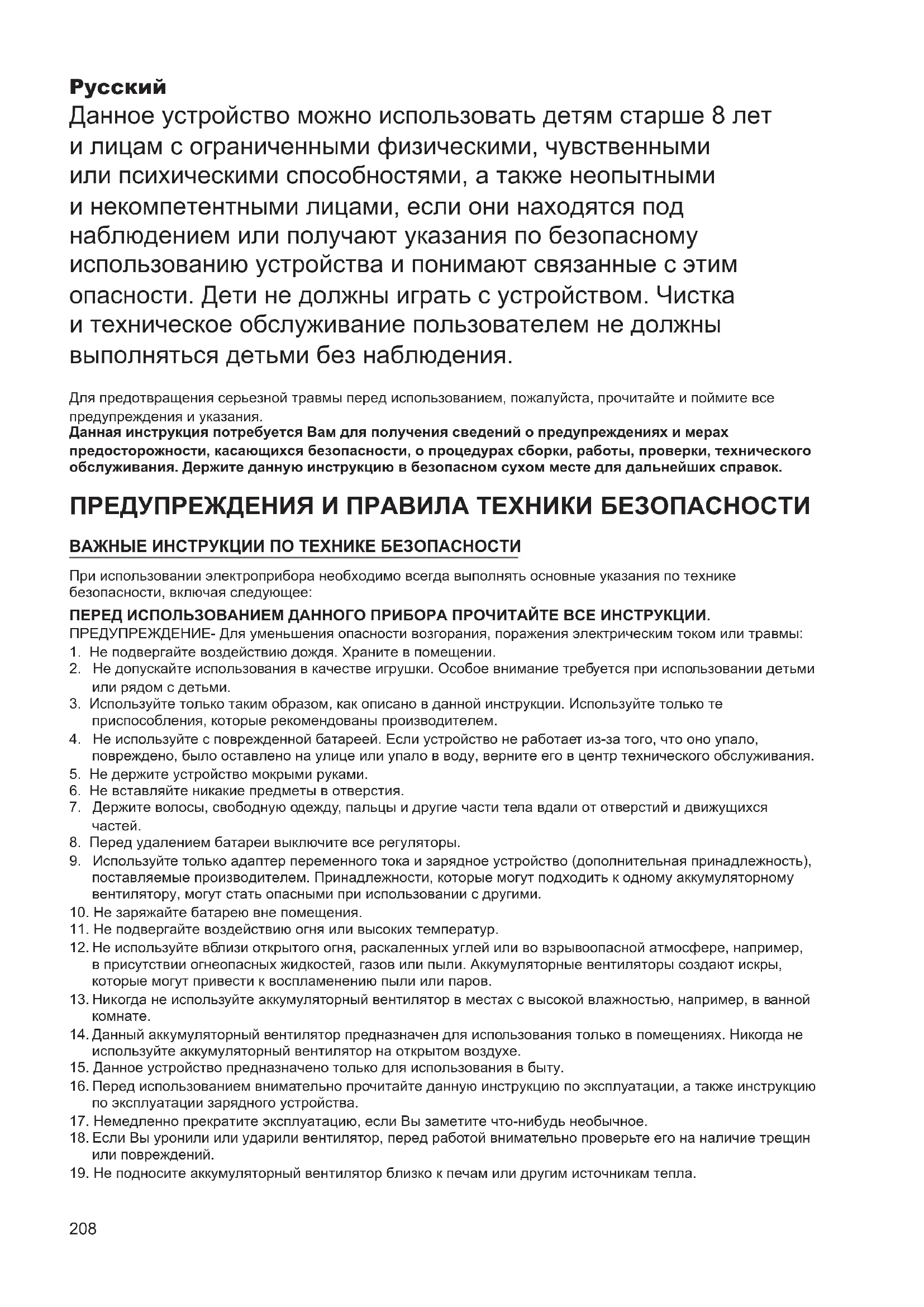 19. Не подносите аккумуляторный вентилятор близко к печам или другим источникам тепла.209
