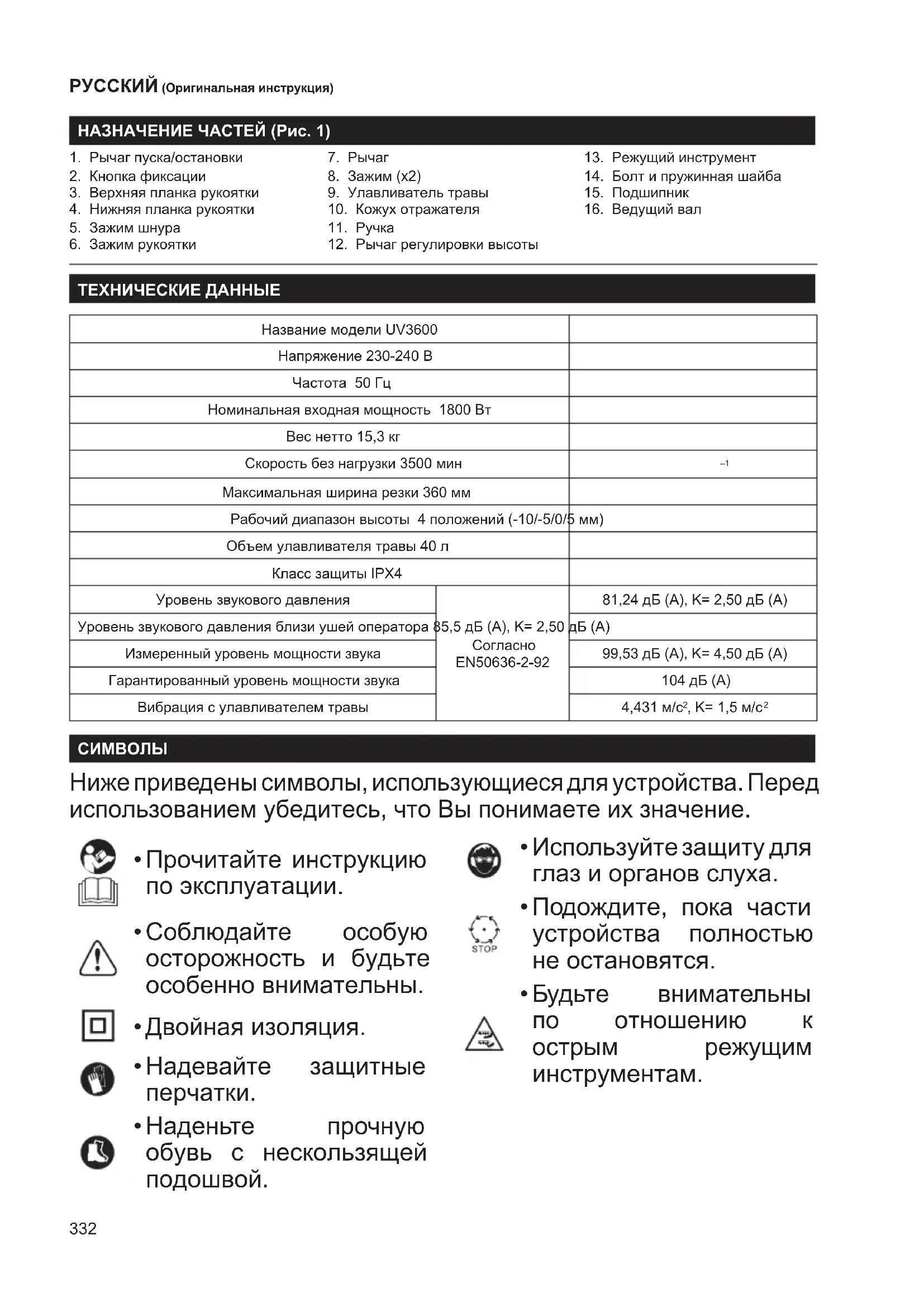 ТЕХНИЧЕСКИЕ ДАННЫЕ Название модели UV3600 Напряжение 230-240 В Частота 50 Гц Номинальная входная мощность 1800 Вт Вес нетто 15,3 кг Скорость без нагрузки 3500 мин