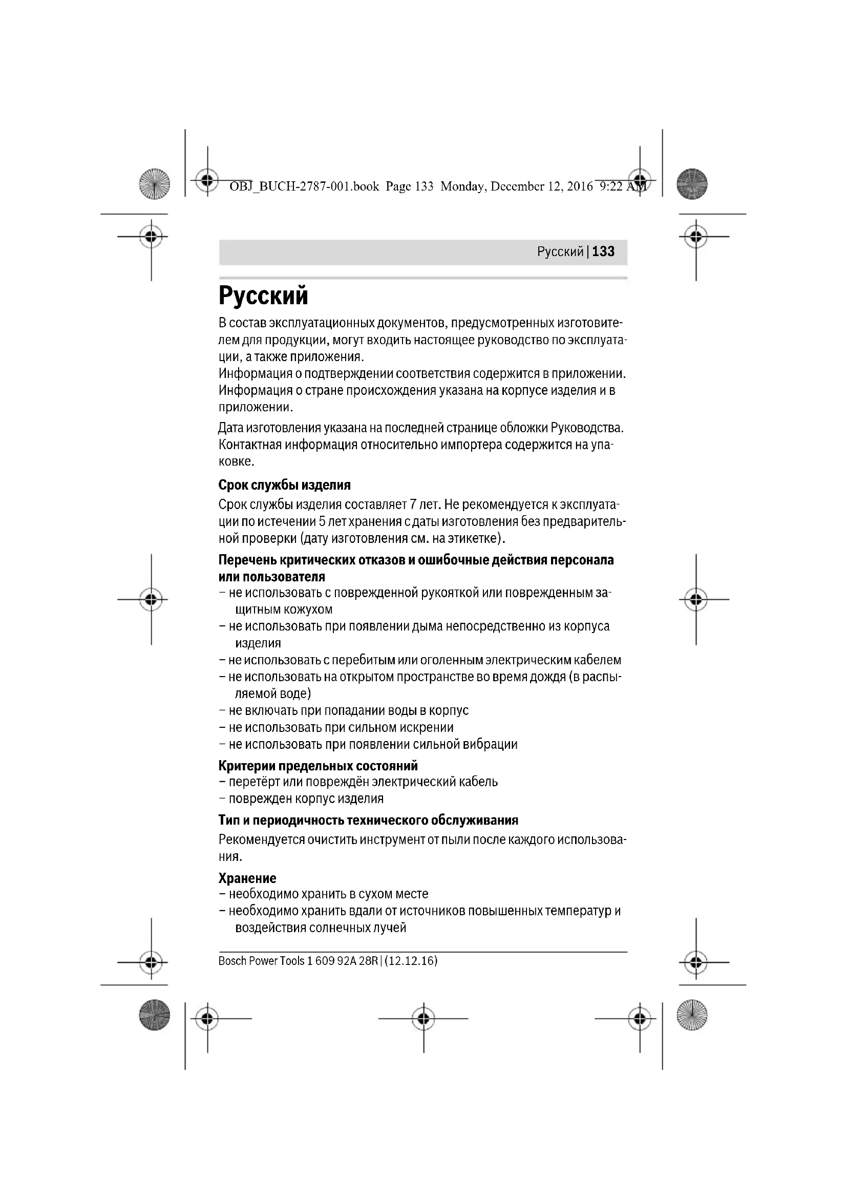 – не использовать с перебитым или оголенным электрическим кабелем – не использовать на открытом пространстве во время дождя (в распы- ляемой воде) – не включать при попадании воды в корпус – не использовать при сильном искрении – не использовать при появлении сильной вибрации Критерии предельных состояний – перетёрт или повреждён электрический кабель – поврежден корпус изделия Тип и периодичность технического обслуживания Рекомендуется очистить инструмент от пыли после каждого использова-