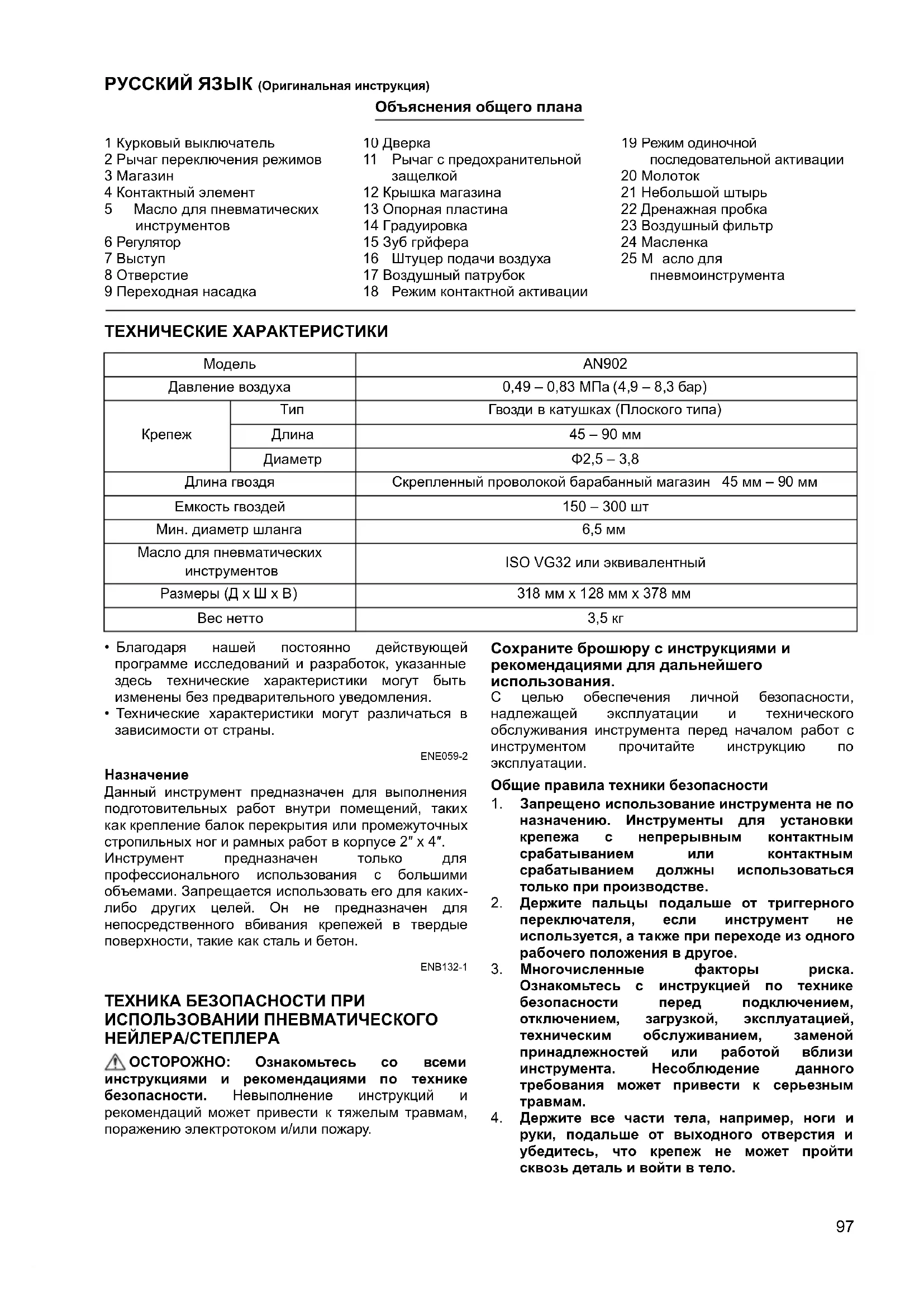 Данный инструмент предназначен для выполнения подготовительных работ внутри помещений, таких как крепление балок перекрытия или промежуточных стропильных ног и рамных работ в корпусе 2″ x 4″. Инструмент предназначен только для профессионального использования с большими объемами. Запрещается использовать его для каких- либо других целей. Он не предназначен для непосредственного вбивания крепежей в твердые поверхности, такие как ст аль и бетон. ENB132-1 ТЕХНИКА БЕЗОПАСНОСТИ ПРИ ИСПОЛЬЗОВАНИИ ПНЕВМАТИЧЕСКОГО НЕЙЛЕРА/СТЕПЛЕРА ОСТОРОЖНО: Ознакомьтесь со всеми инструкциями и рекомендациями по технике безопасности. Невыполнение инструкций и рекомендаций может привести к тяжелым травмам, поражению электротоком и/или пожару. Сохраните брошюру с инструкциями и рекомендациями для дальнейшего использования. С целью обеспечения личной безопасности, надлежащей эксплуатации и технического обслуживания инструмента перед началом работ с инструментом прочитайте инструкцию по эксплуатации. Общие правила техники безопасности