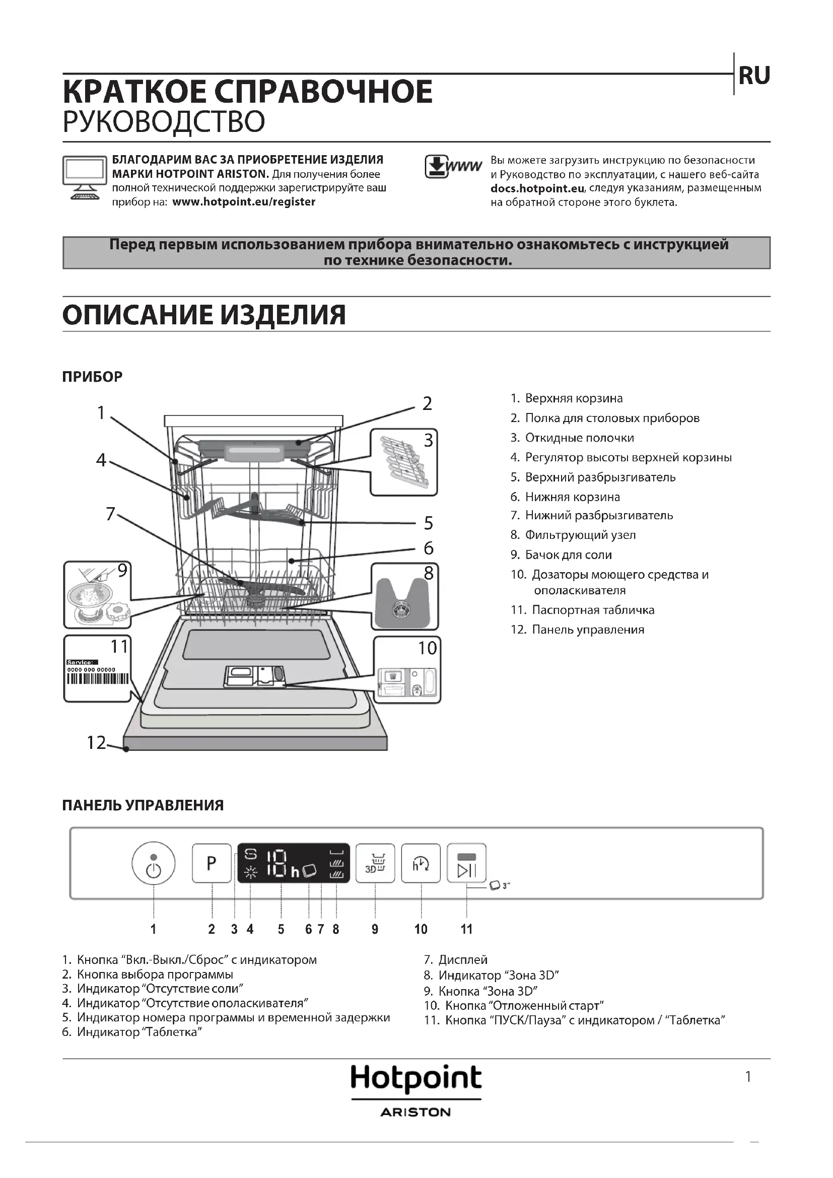 КРАТКОЕ СПРАВОЧНОЕ РУКОВОДСТВО ПРИБОРПеред первым использованием прибора внимательно ознакомьтесь с инструкцией по технике безопасности. ОПИСАНИЕ ИЗДЕЛИЯ ПАНЕЛЬ УПРАВЛЕНИЯ1. Кнопка “Вкл.-Выкл./Сброс” с индикатором2. Кнопка выбора программы3. Индикатор “Отсутствие соли”4. Индикатор “Отсутствие ополаскивателя”5. Индикатор номера программы и временной задержки6. Индикатор “Таблетка”7. Дисплей8. Индикатор “Зона 3D”9. Кнопка “Зона 3D”10. Кнопка “Отложенный старт”11. Кнопка “ПУСК/Пауза” с индикатором / “Таблетка” БЛАГОДАРИМ ВАС ЗА ПРИОБРЕТЕНИЕ ИЗДЕЛИЯ МАРКИ HOTPOINT ARISTON. Для получения более полной технической поддержки зарегистрируйте ваш прибор на: www.hotpoint.eu/registerВы можете загрузить инструкцию по безопасности и Руководство по эксплуатации, с нашего веб-сайта docs.hotpoint.eu, следуя указаниям, размещенным на обратной стороне этого буклета. 1. Верхняя корзина2. Полка для столовых приборов3. Откидные полочки4. Регулятор высоты верхней корзины5. Верхний разбрызгиватель6. Нижняя корзина7. Нижний разбрызгиватель8. Фильтрующий узел9. Бачок для соли10. Дозаторы моющего средства и ополаскивателя11. Паспортная табличка12. Панель управления0000 000 00000 Service: