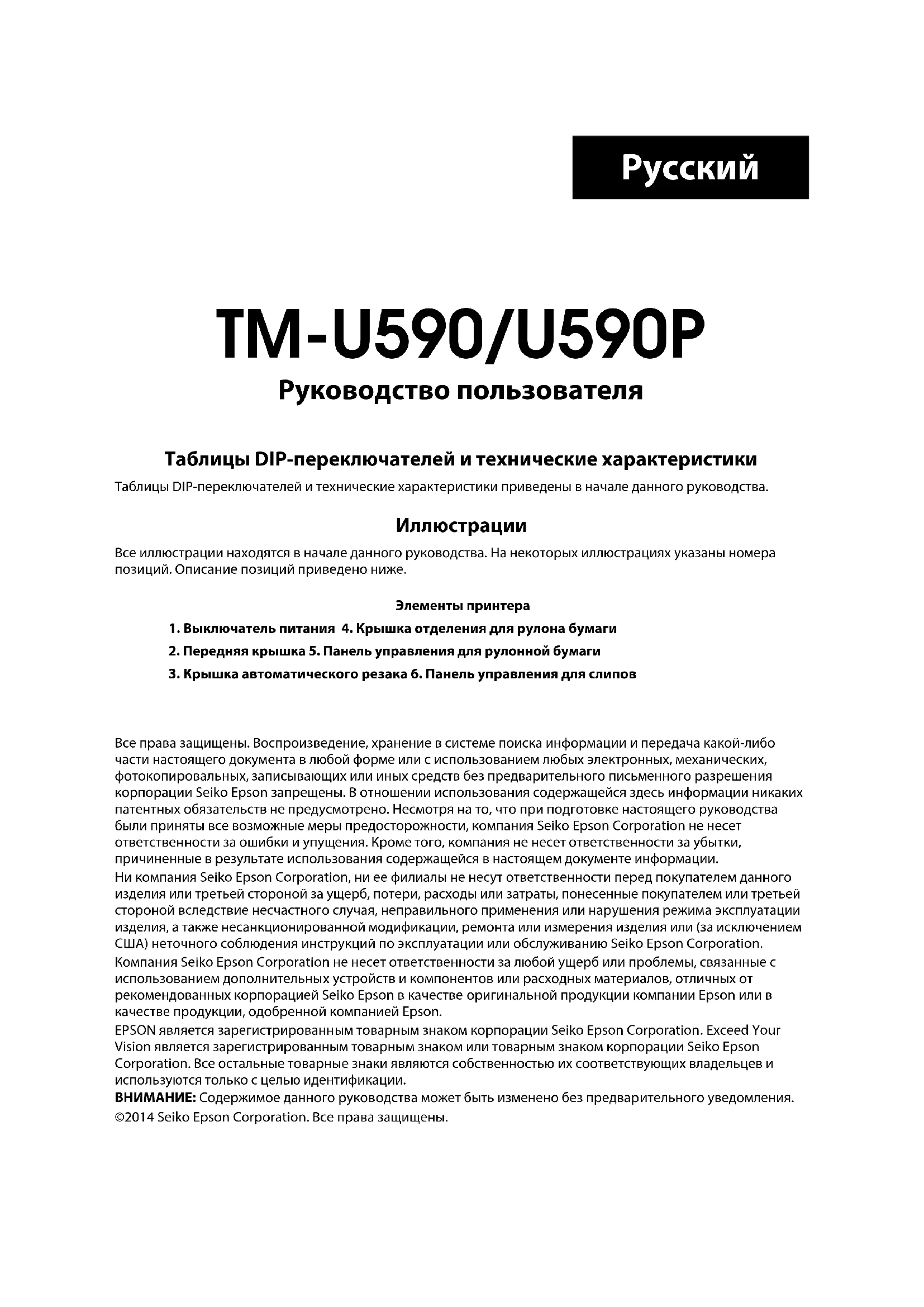 + 24 VDC ± 10% Akım tüketimi (24V düzeyinde) Çalışma: Ortalama: Yaklaşık 1,9 A Maksimum: Yaklaşık 8 A Bekleme konumu:Ortalama: Yaklaşık 0,3 A MTBF 180.000 saat MCBF 29 milyon satır Sıcaklık Çalışma: 5 ila 45°C {41 ila 113°F} Depolama: –10 ila 50°C {14 ila 122°F}, kağıt hariç Nem Çalışma: % 10 ila 90 bağıl nem Depolama: % 10 ila 90 bağıl nem, kağıt hariç Toplam boyut 185 252 266 (belge tablası dahil) mm {7,28 9,92 10,47"} (Y G D) Ağırlık (kütle) Yaklaşık 5 kg {11 lb}TM-U590/U590P Руководство пользователя Таблицы DIP-переключателей и технические характеристики Таблицы DIP-переключателей и технические характеристики приведены в начале данного руководства. Иллюстрации Все иллюстрации находятся в начале данного руководства. На некоторых иллюстрациях указаны номера позиций. Описание позиций приведено ниже. Все права защищены. Воспроизведение, хранение в системе поиска информации и передача какой-либо части настоящего документа в любой форме или с использованием любых электронных, механических, фотокопировальных, записывающих или иных средств без предварительного письменного разрешения корпорации Seiko Epson запрещены. В отношении использования содержащейся здесь информации никаких патентных обязательств не предусмотрено. Несмотря на то, что при подготовке настоящего руководства были приняты все возможные меры предосторожности, компания Seiko Epson Corporation не несет ответственности за ошибки и упущения. Кроме того, компания не несет ответственности за убытки, причиненные в результате использования содержащейся в настоящем документе информации. Ни компания Seiko Epson Corporation, ни ее филиалы не несут ответственности перед покупателем данного изделия или третьей стороной за ущерб, потери, расходы или затраты, понесенные покупателем или третьей стороной вследствие несчастного случая, неправильного применения или нарушения режима эксплуатации изделия, а также несанкционированной модификации, ремонта или измерения изделия или (за исключением США) неточного соблюдения инструкций по эксплуатации или обслуживанию Seiko Epson Corporation. Компания Seiko Epson Corporation не несет ответственности за любой ущерб или проблемы, связанные с использованием дополнительных устройств и компонентов или расходных материалов, отличных от рекомендованных корпорацией Seiko Epson в качестве оригинальной продукции компании Epson или в качестве продукции, одобренной компанией Epson. EPSON является зарегистрированным товарным знаком корпорации Seiko Epson Corporation. Exceed Your Vision является зарегистрированным товарным знаком или товарным знаком корпорации Seiko Epson Corporation. Все остальные товарные знаки являются собственностью их соответствующих владельцев и используются только с целью идентификации. ВНИМАНИЕ: Содержимое данного руководства может быть изменено без предварительного уведомления. ©2014 Seiko Epson Corporation. Все права защищены. Элементы принтера