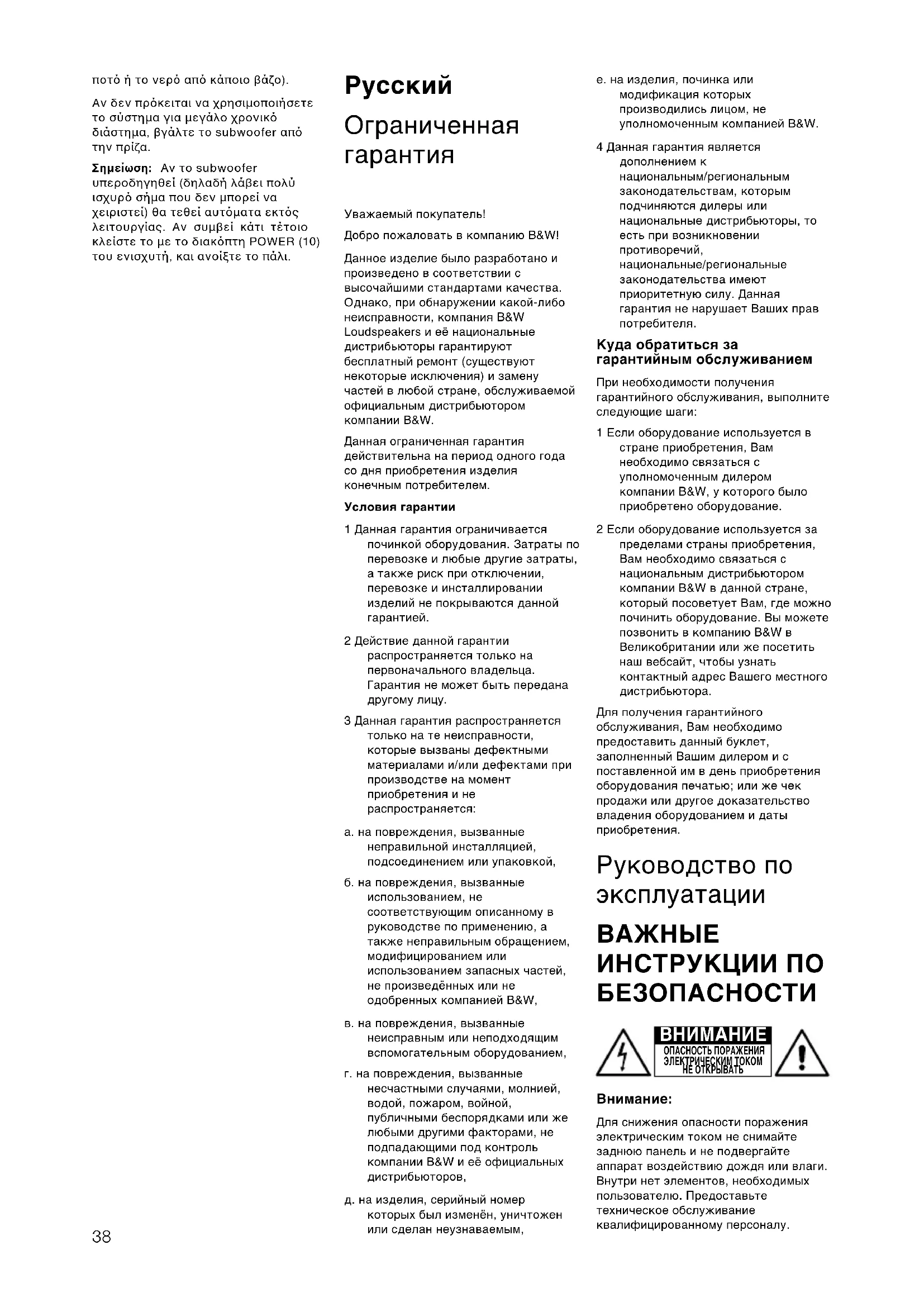 Уважаемый покупатель! Добро пожаловать в компанию B&W! Данное изделие было разработано и произведено в соответствии с высочайшими стандартами качества. Однако, при обнаружении какой-либо неисправности, компания B&W Loudspeakers и её национальные дистрибьюторы гарантируют бесплатный ремонт (существуют некоторые исключения) и замену частей в любой стране, обслуживаемой официальным дистрибьютором компании B&W. Данная ограниченная гарантия действительна на период одного года со дня приобретения изделия конечным потребителем. Условия гарантии 1 Данная гарантия ограничивается починкой оборудования. Затраты по перевозке и любые другие затраты, а также риск при отключении, перевозке и инсталлировании изделий не покрываются данной