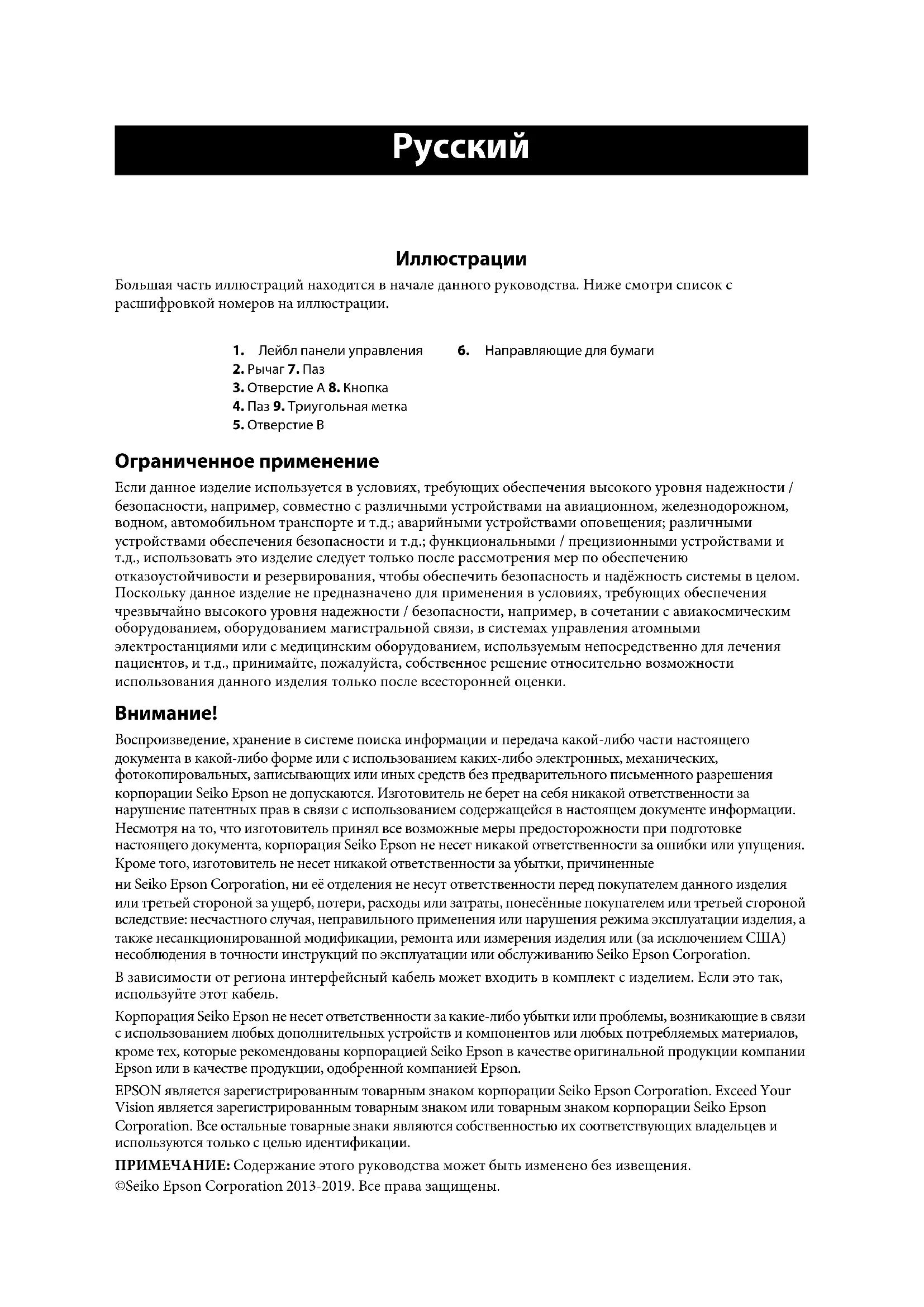 Воспроизведение, хранение в системе поиска информации и передача какой-либо части настоящего документа в какой-либо форме или с использованием каких-либо электронных, механических, фотокопировальных, записывающих или иных средств без предварительного письменного разрешения корпорации Seiko Epson не допускаются. Изготовитель не берет на себя никакой ответственности за нарушение патентных прав в связи с использованием содержащейся в настоящем документе информации. Несмотря на то, что изготовитель принял все возможные меры предосторожности при подготовке настоящего документа, корпорация Seiko Epson не несет никакой ответственности за ошибки или упущения. Кроме того, изготовитель не несет никакой ответственности за убытки, причиненные ни Seiko Epson Corporation, ни её отделения не несут ответственности перед покупателем данного изделия или третьей стороной за ущерб, потери, расходы или затраты, понесённые покупателем или третьей стороной вследствие: несчастного случая, неправильного применения или нарушения режима эксплуатации изделия, а также несанкционированной модификации, ремонта или измерения изделия или (за исключением США) несоблюдения в точности инструкций по эксплуатации или обслуживанию Seiko Epson Corporation. В зависимости от региона интерфейсный кабель может входить в комплект с изделием. Если это так, используйте этот кабель. Корпорация Seiko Epson не несет ответственности за какие-либо убытки или проблемы, возникающие в связи с использованием любых дополнительных устройств и компонентов или любых потребляемых материалов, кроме тех, которые рекомендованы корпорацией Seiko Epson в качестве оригинальной продукции компании Epson или в качестве продукции, одобренной компанией Epson. EPSON является зарегистрированным товарным знаком корпорации Seiko Epson Corporation. Exceed Your Vision является зарегистрированным товарным знаком или товарным знаком корпорации Seiko Epson Corporation. Все остальные товарные знаки являются собственностью их соответствующих владельцев и используются только с целью идентификации. ПРИМЕЧАНИЕ: Содержание этого руководства может быть изменено без извещения. ©Seiko Epson Corporation 2013-2019. Все права защищены.