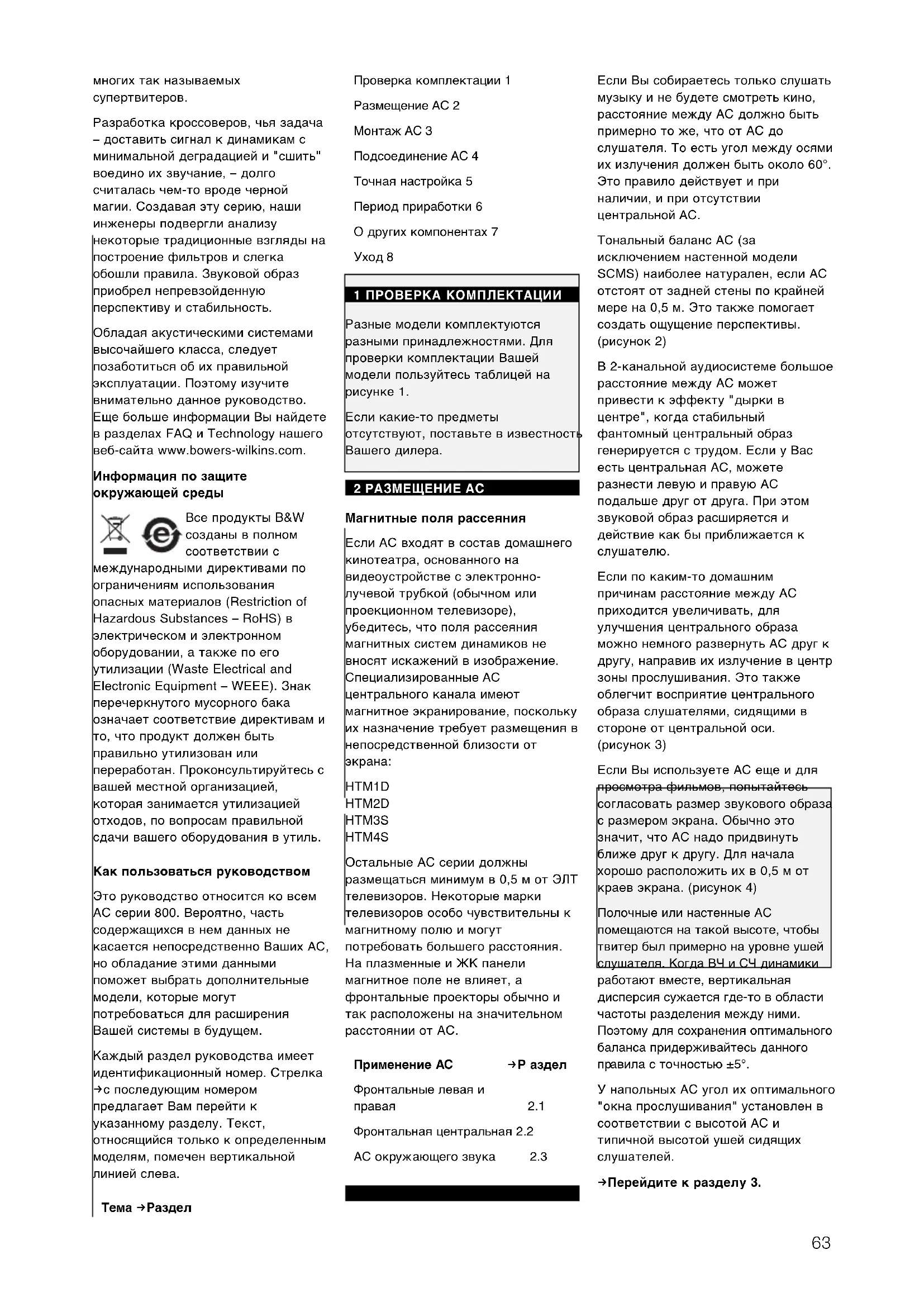жный и дорогой процесс, но в его результате гладкая частотная характеристика продлевается до 80 кГц, что превышает возможности63 многих так называемых супертвитеров. Разработка кроссоверов, чья задача – доставить сигнал к динамикам с минимальной деградацией и "сшить" воедино их звучание, – долго считалась чем-то вроде черной магии. Создавая эту серию, наши инженеры подвергли анализу некоторые традиционные взгляды на построение фильтров и слегка обошли правила. Звуковой образ приобрел непревзойденную перспективу и стабильность. Обладая акустическими системами высочайшего класса, следует позаботиться об их правильной эксплуатации. Поэтому изучите внимательно данное руководство. Еще больше информации Вы найдете в разделах FAQ и Technology нашего веб-сайта www.bowers-wilkins.com. Информация по защите окружающей среды Все продукты B&W созданы в полном соответствии с международными директивами по ограничениям использования опасных материалов (Restriction of Hazardous Substances – RoHS) в электрическом и электронном оборудовании, а также по его утилизации (Waste Electrical and Electronic Equipment – WEEE). Знак перечеркнутого мусорного бака означает соответствие директивам и то, что продукт должен быть правильно утилизован или переработан. Проконсультируйтесь с вашей местной организацией, которая занимается утилизацией отходов, по вопросам правильной сдачи вашего оборудования в утиль. Как пользоваться руководством Это руководство относится ко всем АС серии 800. Вероятно, часть содержащихся в нем данных не касается непосредственно Ваших АС, но обладание этими данными поможет выбрать дополнительные модели, которые могут потребоваться для расширения Вашей системы в будущем. Каждый раздел руководства имеет идентификационный номер. Стрелка f с последующим номером предлагает Вам перейти к указанному разделу. Текст, относящийся только к определенным