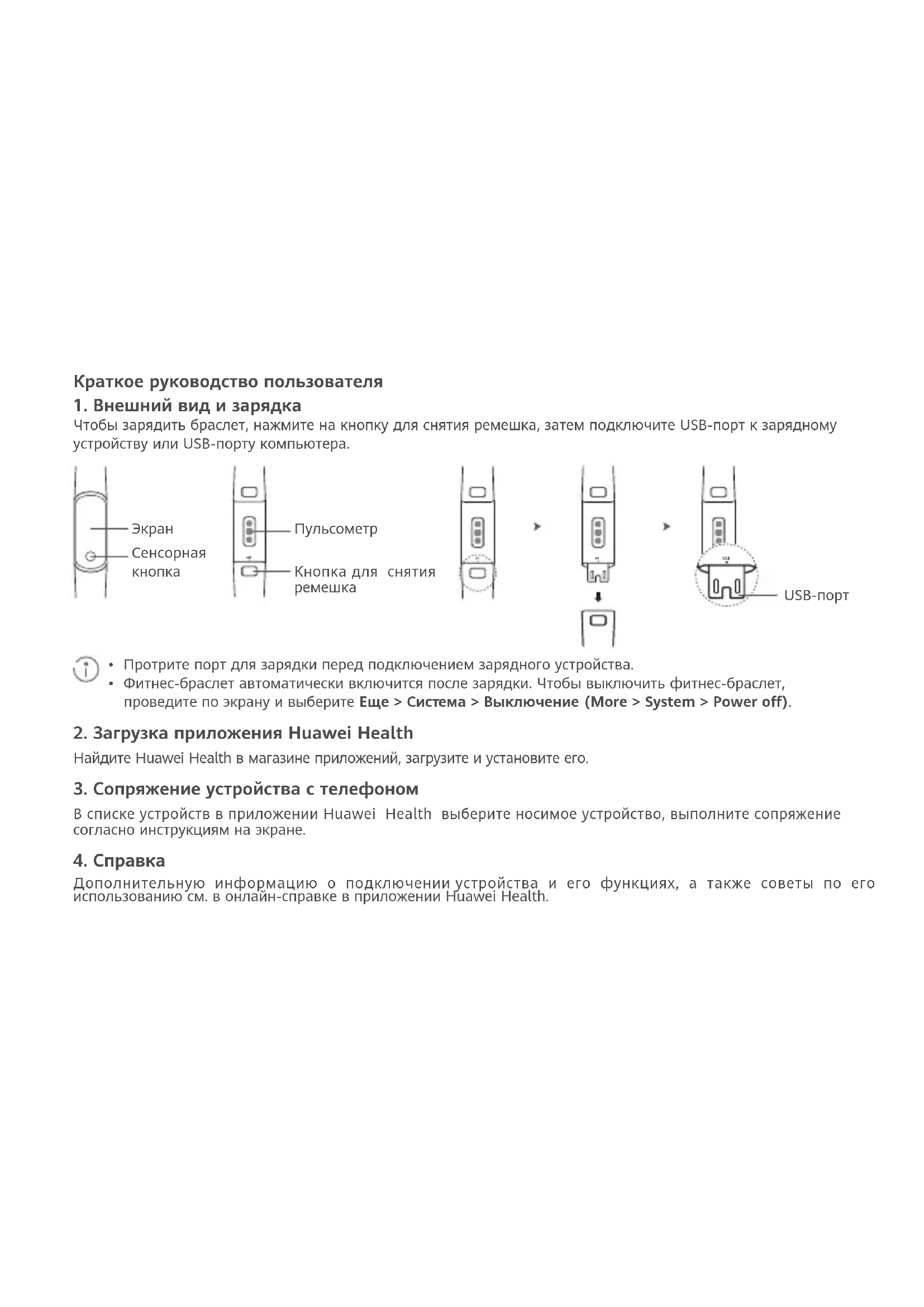 - Фитнес-браслет автоматически включится после зарядки. Чтобы выключить фитнес-браслет, проведите по экрану и выберите Еще > Система > Выключение (More > System > Power o).