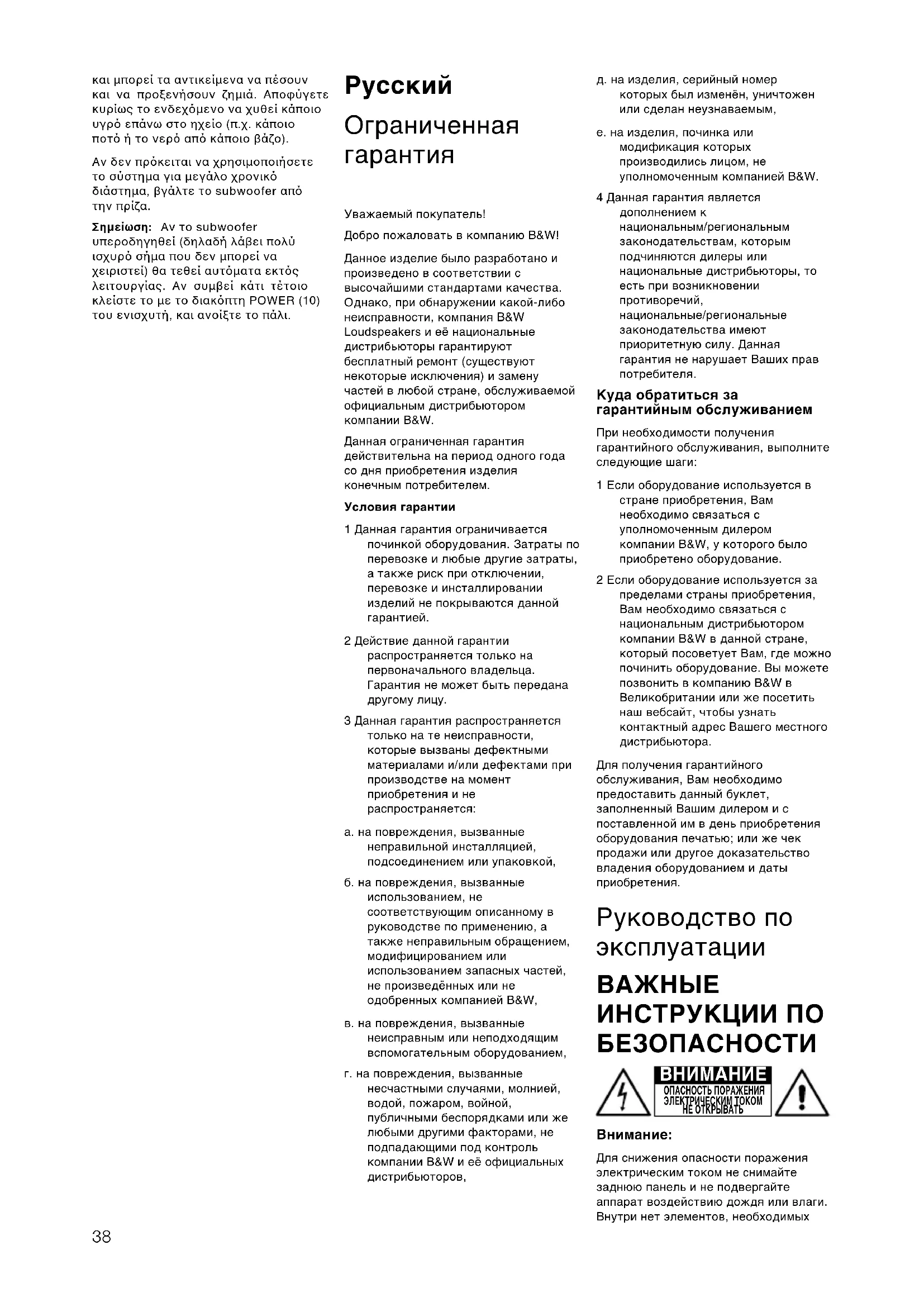 Уважаемый покупатель! Добро пожаловать в компанию B&W! Данное изделие было разработано и произведено в соответствии с высочайшими стандартами качества. Однако, при обнаружении какой-либо неисправности, компания B&W Loudspeakers и её национальные дистрибьюторы гарантируют бесплатный ремонт (существуют некоторые исключения) и замену частей в любой стране, обслуживаемой официальным дистрибьютором компании B&W. Данная ограниченная гарантия действительна на период одного года со дня приобретения изделия конечным потребителем. Условия гарантии 1 Данная гарантия ограничивается починкой оборудования. Затраты по перевозке и любые другие затраты, а также риск при отключении, перевозке и инсталлировании изделий не покрываются данной