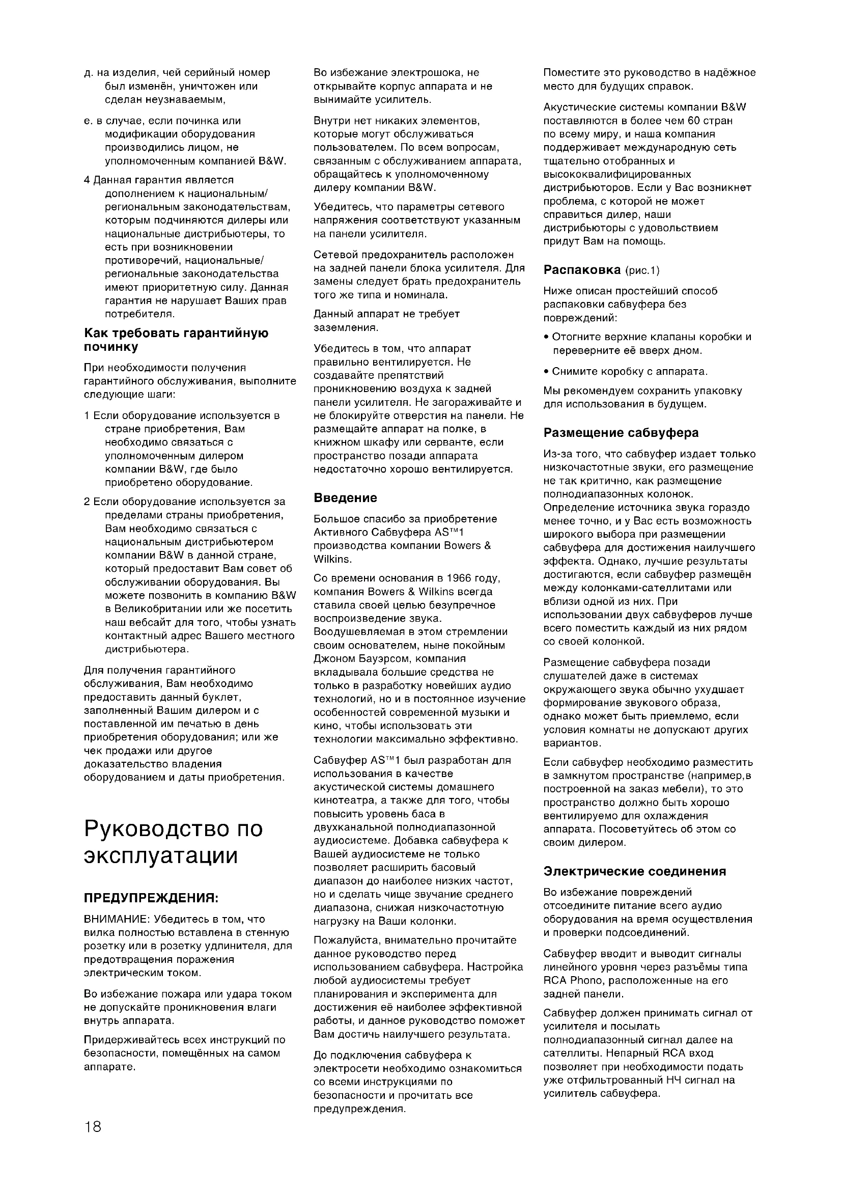 Большое спасибо за приобретение Активного Сабвуфера AS™1 производства компании Bowers & Wilkins. Со времени основания в 1966 году, компания Bowers & Wilkins всегда ставила своей целью безупречное воспроизведение звука. Воодушевляемая в этом стремлении своим основателем, ныне покойным Джоном Бауэрсом, компания вкладывала большие средства не только в разработку новейших аудио технологий, но и в постоянное изучение особенностей современной музыки и кино, чтобы использовать эти технологии максимально эффективно. Сабвуфер AS™1 был разработан для использования в качестве акустической системы домашнего кинотеатра, а также для того, чтобы повысить уровень баса в двухканальной полнодиапазонной аудиосистеме. Добавка сабвуфера к Вашей аудиосистеме не только позволяет расширить басовый диапазон до наиболее низких частот, но и сделать чище звучание среднего диапазона, снижая низкочастотную нагрузку на Ваши колонки. Пожалуйста, внимательно прочитайте данное руководство перед использованием сабвуфера. Настройка любой аудиосистемы требует планирования и эксперимента для достижения её наиболее эффективной работы, и данное руководство поможет Вам достичь наилучшего результата. До подключения сабвуфера к электросети необходимо ознакомиться со всеми инструкциями по безопасности и прочитать все предупреждения. Поместите это руководство в надёжное место для будущих справок. Акустические системы компании B&W поставляются в более чем 60 стран по всему миру, и наша компания поддерживает международную сеть тщательно отобранных и высококвалифицированных дистрибьюторов. Если у Вас возникнет проблема, с которой не может справиться дилер, наши дистрибьюторы с удовольствием придут Вам на помощь. Распаковка (рис.1) Ниже описан простейший способ распаковки сабвуфера без повреждений: