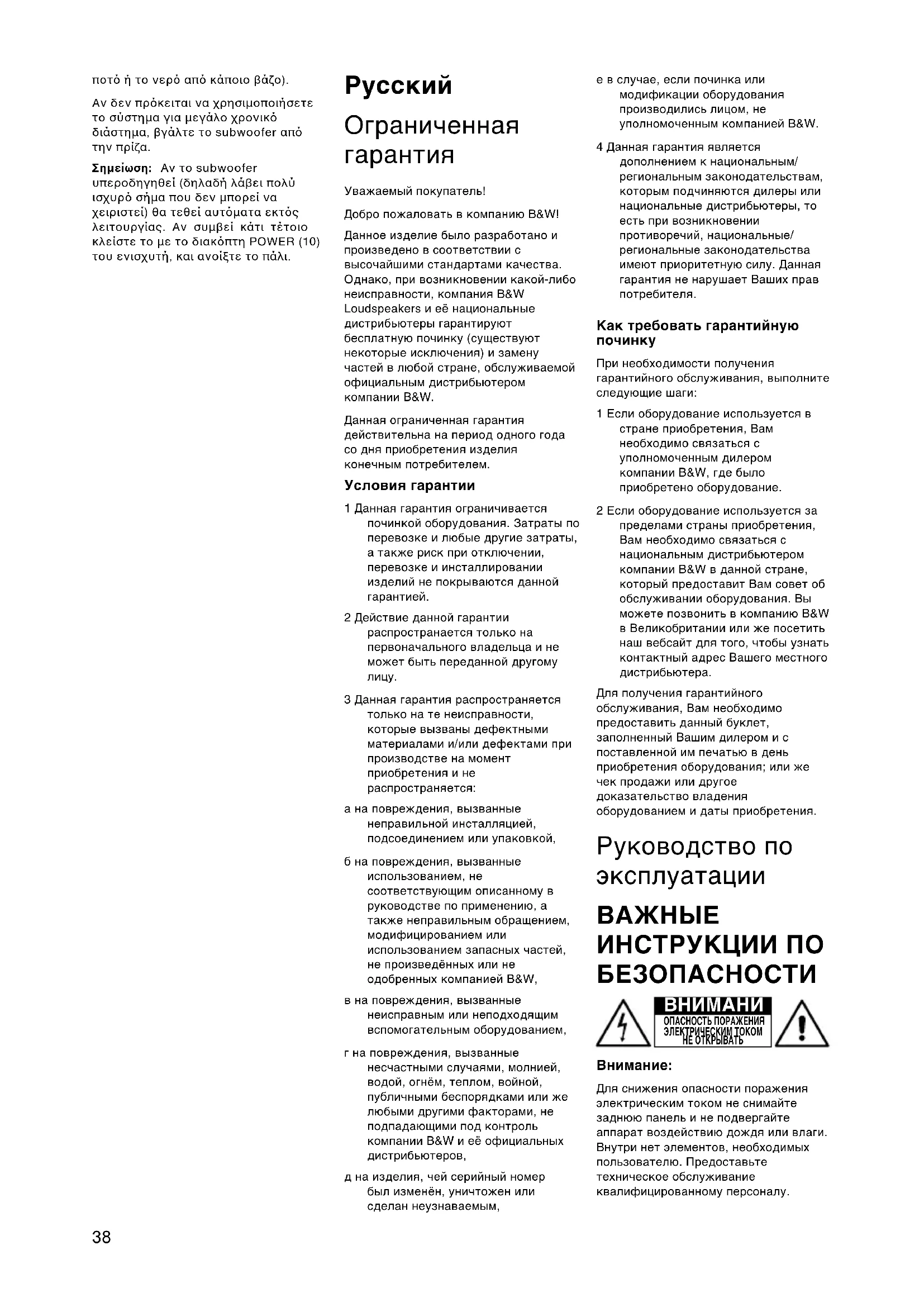 Уважаемый покупатель! Добро пожаловать в компанию B&W! Данное изделие было разработано и произведено в соответствии с высочайшими стандартами качества. Однако, при возникновении какой-либо неисправности, компания B&W Loudspeakers и её национальные дистрибьютеры гарантируют бесплатную починку (существуют некоторые исключения) и замену частей в любой стране, обслуживаемой официальным дистрибьютером компании B&W. Данная ограниченная гарантия действительна на период одного года со дня приобретения изделия конечным потребителем. Условия гарантии 1 Данная гарантия ограничивается починкой оборудования. Затраты по перевозке и любые другие затраты, а также риск при отключении, перевозке и инсталлировании изделий не покрываются данной