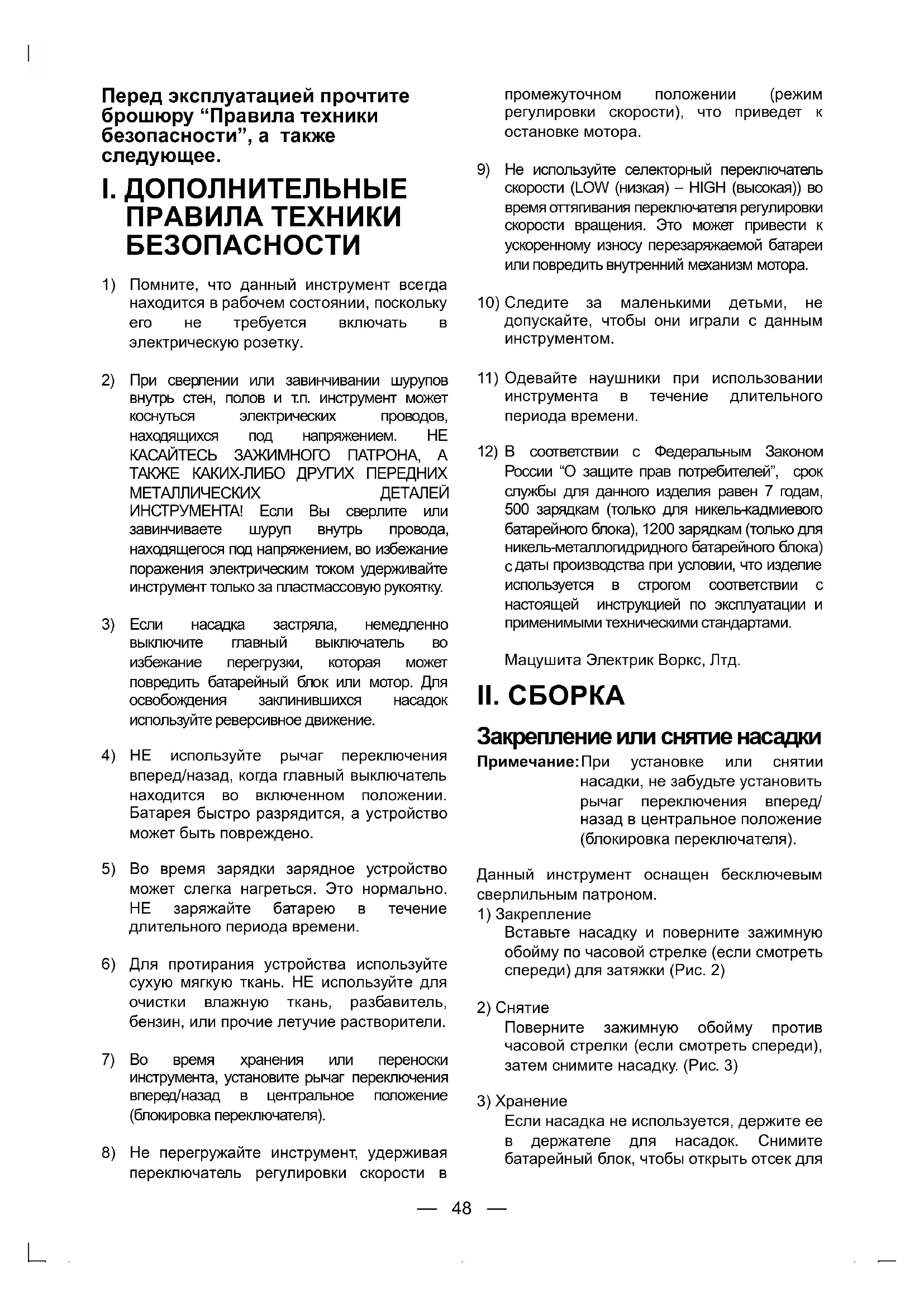 ~ 10 (1/32" ~ 3/8")1,0 мм ~ 13 мм (1/16" ~ 1/2")Макс. Крутящий момент НИЗКАЯ 22,5 Нм, (230 кгс-см, 199 дюйм-фунт)31,9 Нм, (325 кгс-см, 282 дюйм-фунт) ВЫСОКАЯ 6,3 Нм, (65 кгс-см, 56 дюйм-фунт)8,8 Нм, (90 кгс-см, 78 дюйм-фунт) Крутящий момент муфты Приблиз. 1,0 Нм, (10 кгс-см, 8,7 дюйм-фунт) ~5,4 Нм, (55 кгс-см, 47,7 дюйм-фунт) Приблиз. 1,0 Нм, (10 кгс-см, 8,7 дюйм-фунт) ~6,9 Нм, (70 кгс-см, 61 дюйм-фунт)Общая длина202 мм (7-61/64")208 мм (8-3/16") (с батарейным блоком)1,7 кг (3,75 фунтов) с EY91061,8 кг (3,97 фунтов) with EY92001,9 кг (4,19 фунтов) with EY92012,0 кг (4,41 фунтов) with EY92302,2 кг (4,85 фунтов) with EY92312,0 кг (4,41 фунтов) with EY9136 Модел EY9106 EY9200 EY9201 EY9230 EY9231 EY9136 Используемая батареяНикель-кадмиевый батарейный блокНикель-металллогидриднаябатареяНикель-кадмиевый батарейный блокНапряжение батареи 12 В постоянного тока (1,2 В Ч 10 элементов) 15,6 В постоянного тока (1,2 В Ч 13 элементов) Модел EY0110 Электрические параметры См. табличку с электрическими параметрами на нижней поверхности зарядного устройства. Вес 0,78 кг (1,72 фунта) Время зарядки 7,2 В 9,6 В 12 В 15,6 В 18 В 24 В 1,2 Ампер-часEY9065, EY9066EY9080, EY9086 EY9001, EY90061,7AhEY9180, EY9182EY9101 2,0 Ампер-часEY9168 EY9106EY9136EY9117 3,0 Ампер-часEY9200EY9230EY9210 3,5 Ампер-часEY9201EY9231EY925120мин25мин 30мин 30мин 60мин 45мин 90мин55мин 65мин EY6405(EU).book Page 52 Wednesday, June 15, 2005 7:14 PM— 53 — EY6405(EU).book Page 53 Wednesday, June 15, 2005 7:14 PM— 53 — Перед експлуатацією прочитайте брошюру “Правила техніки безпеки”, а також зазначене нижче.
