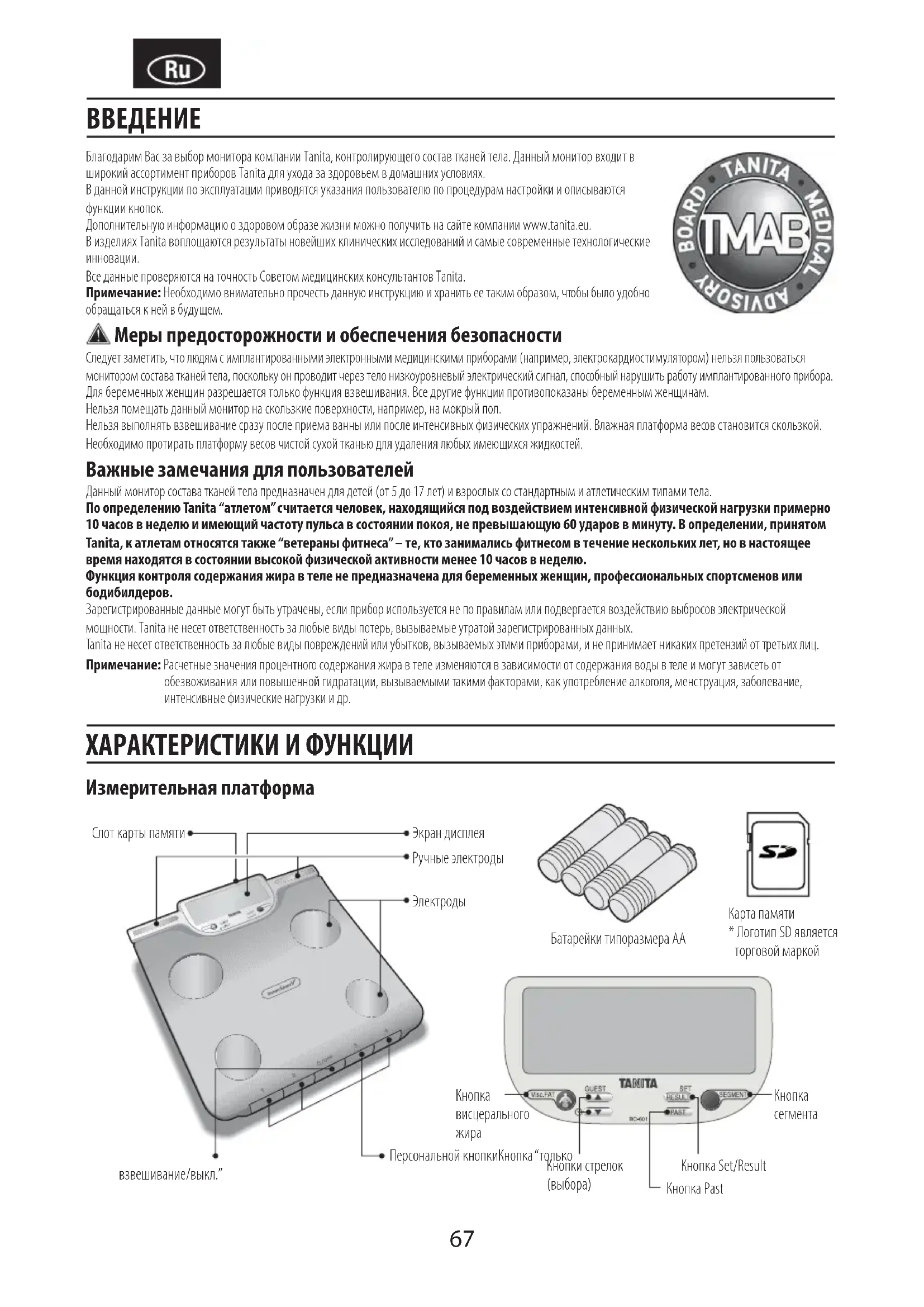 Все данные проверяются на точность Советом медицинских консультантов Tanita. Примечание: Необходимо внимательно прочесть данную инструкцию и хранить ее таким образом, чтобы было удобно обращаться к ней в будущем. Меры предосторожности и обеспечения безопасности Следует заметить, что людям с имплантированными электронными медицинскими приборами (например, электрокардиостимулятором) нельзя пользоваться монитором состава тканей тела, поскольку он проводит через тело низкоуровневый электрический сигнал, способный нарушить работу имплантированного прибора. Для беременных женщин разрешается только функция взвешивания. Все другие функции противопоказаны беременным женщинам. Нельзя помещать данный монитор на скользкие поверхности, например, на мокрый пол. Нельзя выполнять взвешивание сразу после приема ванны или после интенсивных физических упражнений. Влажная платформа весов становится скользкой. Необходимо протирать платформу весов чистой сухой тканью для удаления любых имеющихся жидкостей. Важные замечания для пользователей Данный монитор состава тканей тела предназначен для детей (от 5 до 17 лет) и взрослых со стандартным и атлетическим типами тела. По определению Tanita “атлетом” считается человек, находящийся под воздействием интенсивной физической нагрузки примерно 10 часов в неделю и имеющий частоту пульса в состоянии покоя, не превышающую 60 ударов в минуту. В определении, принятом Tanita, к атлетам относятся также “ветераны фитнеса” – те, кто занимались фитнесом в течение нескольких лет, но в настоящее время находятся в состоянии высокой физической активности менее 10 часов в неделю. Функция контроля содержания жира в теле не предназначена для беременных женщин, профессиональных спортсменов или бодибилдеров. Зарегистрированные данные могут быть утрачены, если прибор используется не по правилам или подвергается воздействию выбросов электрической мощности. Tanita не несет ответственность за любые виды потерь, вызываемые утратой зарегистрированных данных. Tanita не несет ответственность за любые виды повреждений или убытков, вызываемых этими приборами, и не принимает никаких претензий от третьих лиц. Примечание: Расчетные значения процентного содержания жира в теле изменяются в зависимости от содержания воды в теле и могут зависеть от обезвоживания или повышенной гидратации, вызываемыми такими факторами, как употребление алкоголя, менструация, заболевание, интенсивные физические нагрузки и др.