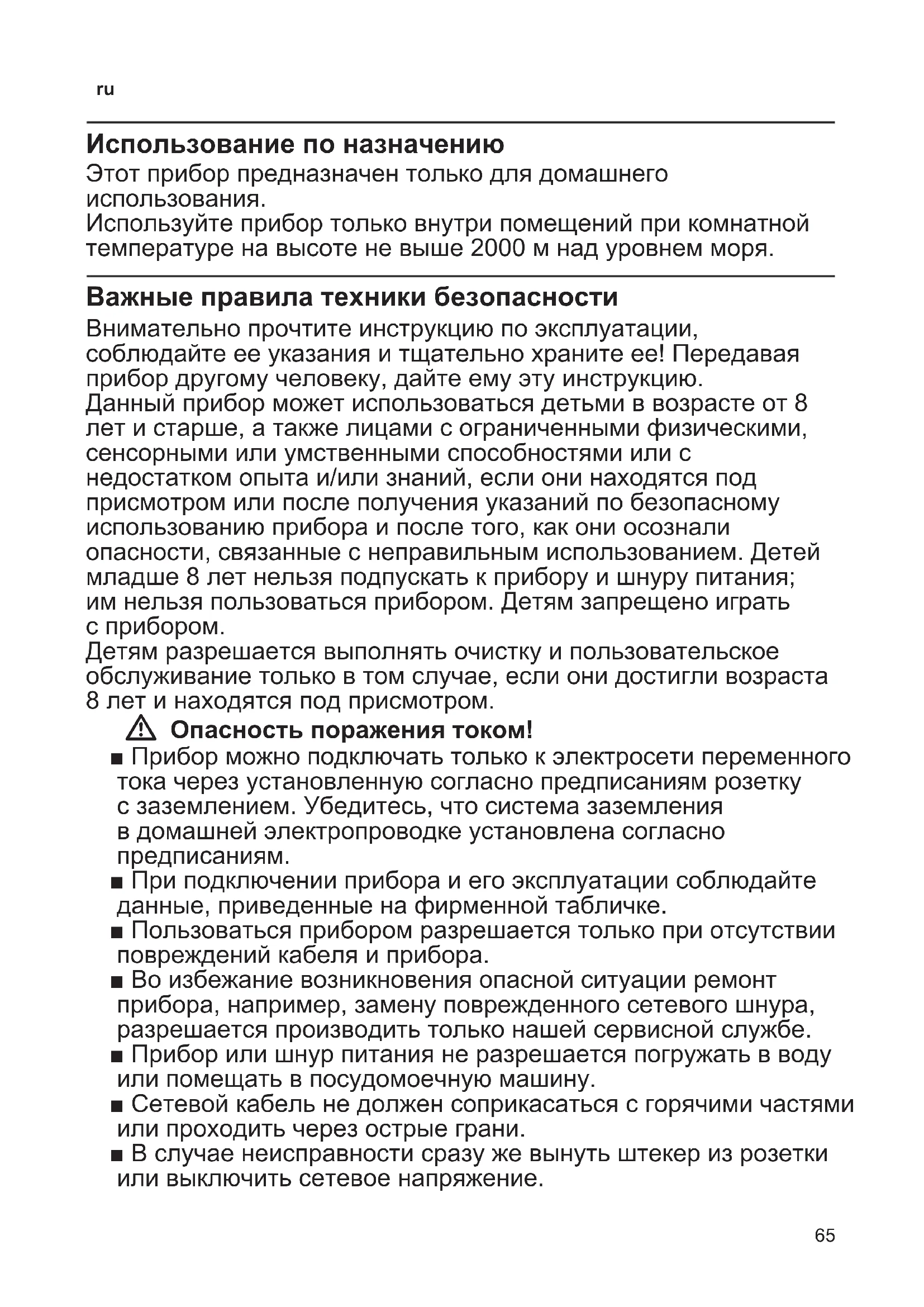 Использование по назначению Этот прибор предназначен только для домашнего использования. Используйте прибор только внутри помещений при комнатной температуре на высоте не выше 2000 м над уровнем моря. Важные правила техники безопасности Внимательно прочтите инструкцию по эксплуатации, соблюдайте ее указания и тщательно храните ее! Передавая прибор другому человеку, дайте ему эту инструкцию. Данный прибор может использоваться детьми в возрасте от 8 лет и старше, а также лицами с ограниченными физическими, сенсорными или умственными способностями или с недостатком опыта и/или знаний, если они находятся под присмотром или после получения указаний по безопасному использованию прибора и после того, как они осознали опасности, связанные с неправильным использованием. Детей младше 8 лет нельзя подпускать к прибору и шнуру питания; им нельзя пользоваться прибором. Детям запрещено играть с прибором. Детям разрешается выполнять очистку и пользовательское обслуживание только в том случае, если они достигли возраста 8 лет и находятся под присмотром. W Опасность поражения током! ■ Прибор можно подключать только к электросети переменного тока через установленную согласно предписаниям розетку с заземлением. Убедитесь, что система заземления в домашней электропроводке установлена согласно предписаниям. ■ При подключении прибора и его эксплуатации соблюдайте данные, приведенные на фирменной табличке. ■ Пользоваться прибором разрешается только при отсутствии повреждений кабеля и прибора. ■ Во избежание возникновения опасной ситуации ремонт прибора, например, замену поврежденного сетевого шнура, разрешается производить только нашей сервисной службе. ■ Прибор или шнур питания не разрешается погружать в воду или помещать в посудомоечную машину. ■ Сетевой кабель не должен соприкасаться с горячими частями или проходить через острые грани. ■ В случае неисправности сразу же вынуть штекер из розетки или выключить сетевое напряжение.66