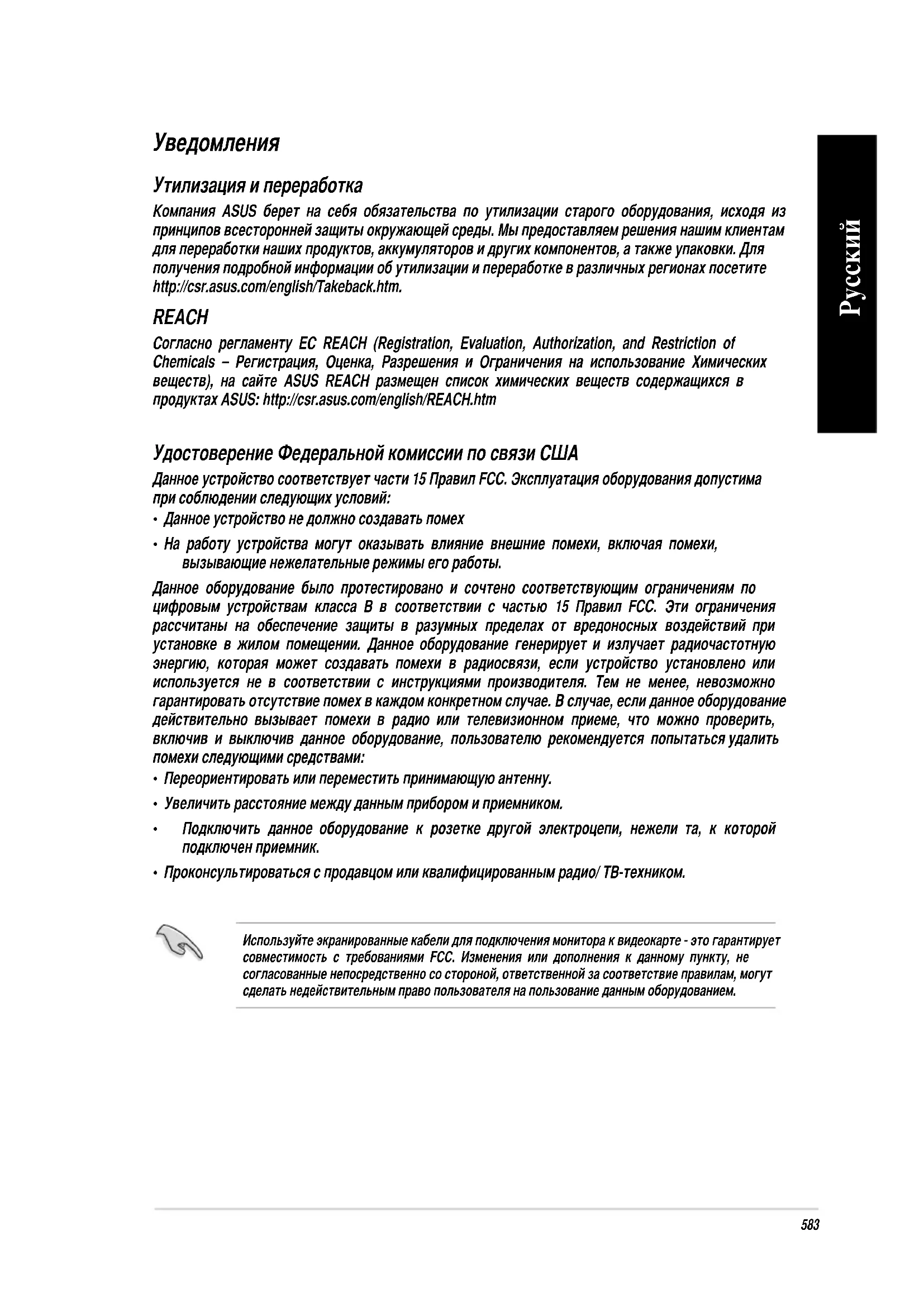 Русский583 Уведомления Утилизация и переработка Компания ASUS берет на себя обязательства по утилизации старого оборудования, исходя из принципов всесторонней защиты окружающей среды. Мы предоставляем решения нашим клиентам для переработки наших продуктов, аккумуляторов и других компонентов, а также упаковки. Для получения подробной информации об утилизации и переработке в различных регионах посетите http://csr.asus.com/english/Takeback.htm. REACH Согласно регламенту ЕС REACH (Registration, Evaluation, Authorization, and Restriction of Chemicals – Регистрация, Оценка, Разрешения и Ограничения на использование Химических веществ), на сайте ASUS REACH размещен список химических веществ содержащихся в продуктах ASUS: http://csr.asus.com/english/REACH.htm Удостоверение Федеральной комиссии по связи США Данное устройство соответствует части 15 Правил FCC. Эксплуатация оборудования допустима при соблюдении следующих условий: