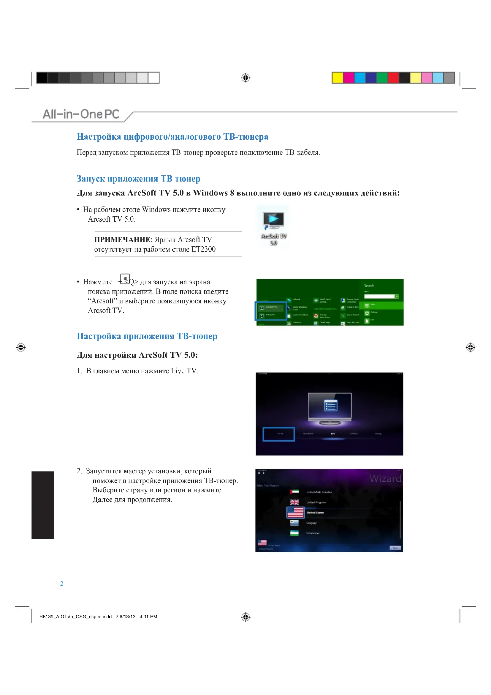 поможет в настройке приложения ТВ-тюнер. Выберите страну или регион и нажмите Далее для продолжения. R8139_AIOTVb_QSG_digital.indd 2 6/18/13 4:01 PMРусскийРусскийРусскийРусскийРусскийРусский