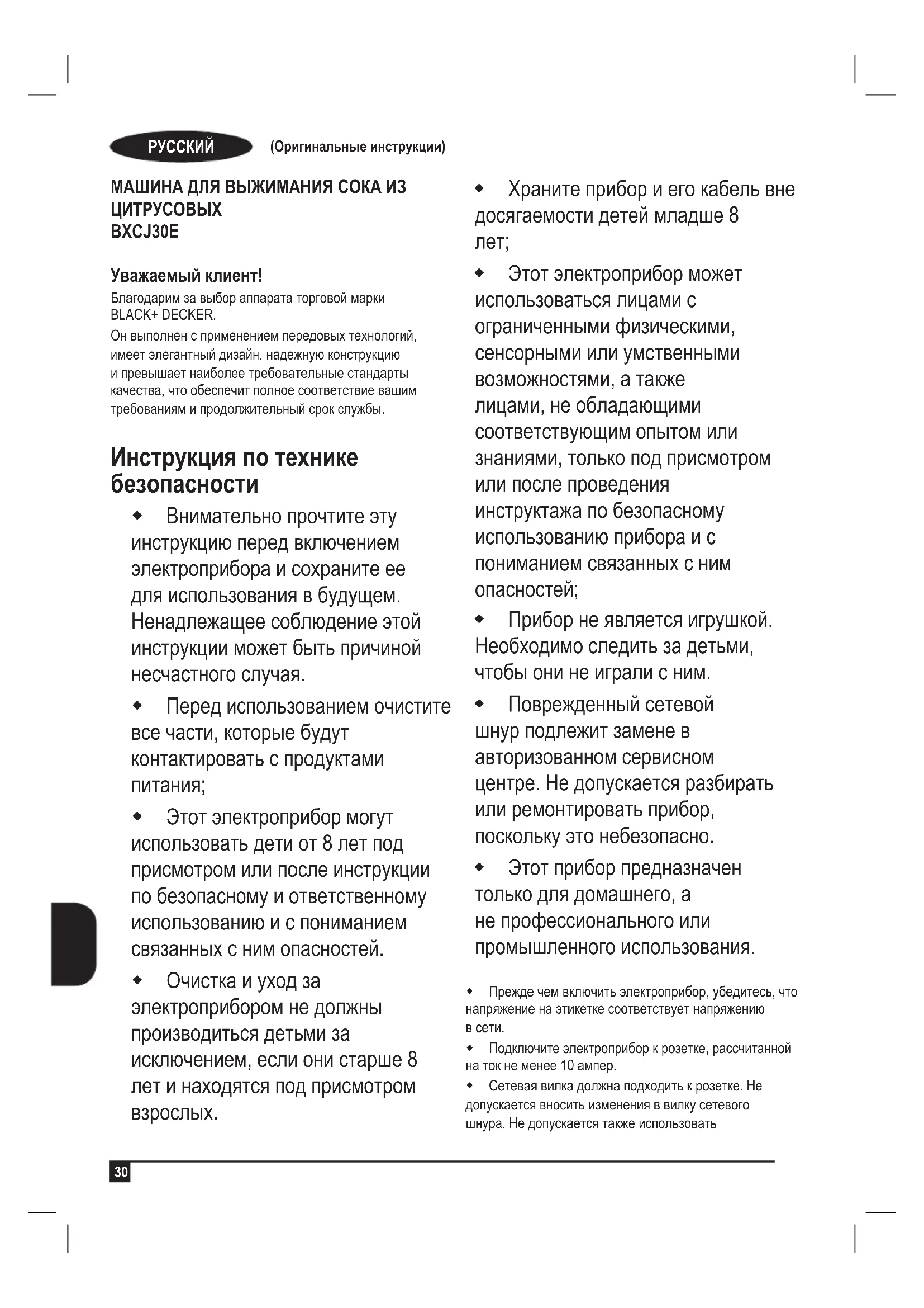 BXCJ30E Уважаемый клиент! Благодарим за выбор аппарата торговой марки BLACK+ DECKER. Он выполнен с применением передовых технологий, имеет элегантный дизайн, надежную конструкцию и превышает наиболее требовательные стандарты качества, что обеспечит полное соответствие вашим требованиям и продолжительный срок службы. Инструкция по технике безопасности Внимательно прочтите эту инструкцию перед включением электроприбора и сохраните ее для использования в будущем. Ненадлежащее соблюдение этой инструкции может быть причиной несчастного случая. Перед использованием очистите все части, которые будут контактировать с продуктами