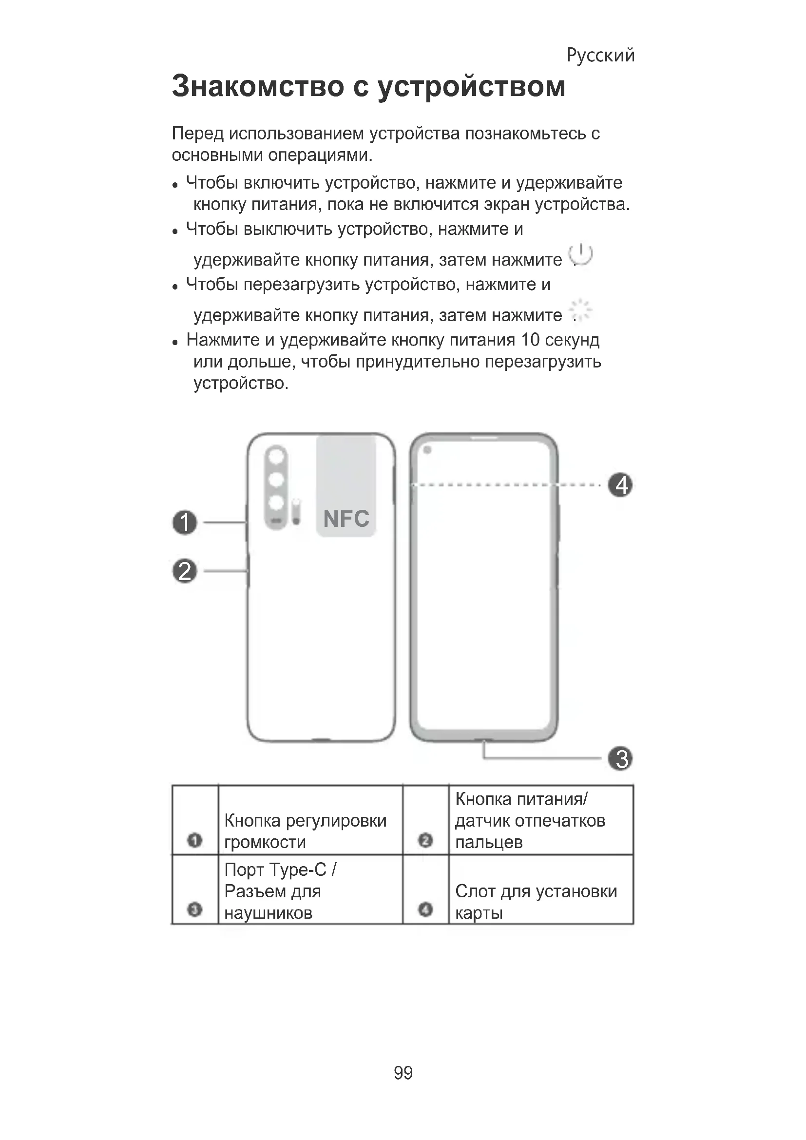 СПРОЩЕНА ДЕКЛАРАЦІЯ про відповідність Справжнім Huawei Technologies Co., Ltd. заявляє, що тип радіообладнання YAL-L41 відповідає Технічному регламенту радіообладнання; повний текст декларації про відповідність доступний на веб-сайті за такою адресою: https://consumer.huawei.com/certification. 98Знакомство с устройством Перед использованием устройства познакомьтесь с основными операциями. l Чтобы включить устройство, нажмите и удерживайте кнопку питания, пока не включится экран устройства. l Чтобы выключить устройство, нажмите и удерживайте кнопку питания, затем нажмите . l Чтобы перезагрузить устройство, нажмите и удерживайте кнопку питания, затем нажмите . l Нажмите и удерживайте кнопку питания 10 секунд или дольше, чтобы принудительно перезагрузить устройство. NFC