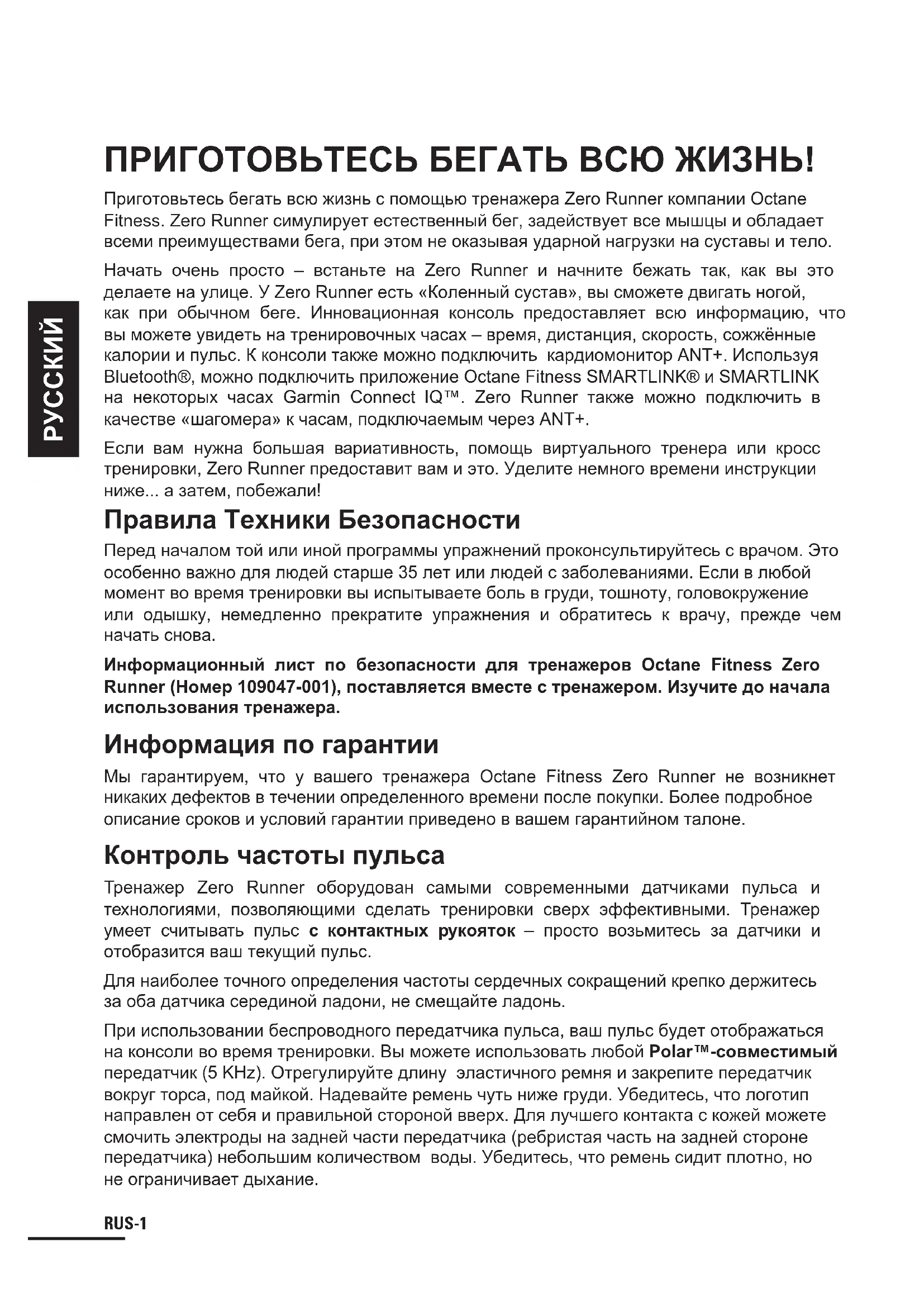 ПРИГОТОВЬТЕСЬ БЕГАТЬ ВСЮ ЖИЗНЬ! Приготовьтесь бегать всю жизнь с помощью тренажера Zero Runner компании Octane Fitness. Zero Runner симулирует естественный бег, задействует все мышцы и обладает всеми преимуществами бега, при этом не оказывая ударной нагрузки на суставы и тело. Начать очень просто – встаньте на Zero Runner и начните бежать так, как вы это делаете на улице. У Zero Runner есть «Коленный сустав», вы сможете двигать ногой, как при обычном беге. Инновационная консоль предоставляет всю информацию, что вы можете увидеть на тренировочных часах – время, дистанция, скорость, сожжённые калории и пульс. К консоли также можно подключить кардиомонитор ANT+. Используя Bluetooth®, можно подключить приложение Octane Fitness SMARTLINK® и SMARTLINK на некоторых часах Garmin Connect IQ™. Zero Runner также можно подключить в качестве «шагомера» к часам, подключаемым через ANT+. Если вам нужна большая вариативность, помощь виртуального тренера или кросс тренировки, Zero Runner предоставит вам и это. Уделите немного времени инструкции ниже... а затем, побежали! Правила Техники Безопасности Перед началом той или иной программы упражнений проконсультируйтесь с врачом. Это особенно важно для людей старше 35 лет или людей с заболеваниями. Если в любой момент во время тренировки вы испытываете боль в груди, тошноту, головокружение или одышку, немедленно прекратите упражнения и обратитесь к врачу, прежде чем начать снова. Информационный лист по безопасности для тренажеров Octane Fitness Zero Runner (Номер 109047-001), поставляется вместе с тренажером. Изучите до начала использования тренажера. Информация по гарантии Мы гарантируем, что у вашего тренажера Octane Fitness Zero Runner не возникнет никаких дефектов в течении определенного времени после покупки. Более подробное описание сроков и условий гарантии приведено в вашем гарантийном талоне. Контроль частоты пульса Тренажер Zero Runner оборудован самыми современными датчиками пульса и технологиями, позволяющими сделать тренировки сверх эффективными. Тренажер умеет считывать пульс с контактных рукояток – просто возьмитесь за датчики и отобразится ваш текущий пульс. Для наиболее точного определения частоты сердечных сокращений крепко держитесь за оба датчика серединой ладони, не смещайте ладонь. При использовании беспроводного передатчика пульса, ваш пульс будет отображаться на консоли во время тренировки. Вы можете использовать любой Polar™-совместимый передатчик (5 KHz). Отрегулируйте длину эластичного ремня и закрепите передатчик вокруг торса, под майкой. Надевайте ремень чуть ниже груди. Убедитесь, что логотип направлен от себя и правильной стороной вверх. Для лучшего контакта с кожей можете смочить электроды на задней части передатчика (ребристая часть на задней стороне передатчика) небольшим количеством воды. Убедитесь, что ремень сидит плотно, но не ограничивает дыхание.RUS-2