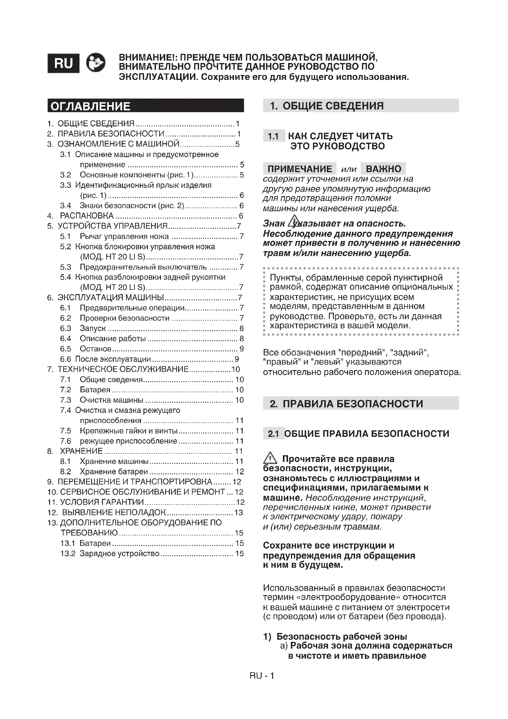 - После завершения срока службы машины не выбрасывайте ее с бытовым мусором, а обратитесь в центр сбора отходов в соответствии с действующим местным законодательством. Не выбрасывайте электрооборудование вместе с бытовыми отходами. В соответствии с Европейской директивой 2012/19/ЕС относительно выведенного из эксплуатации электрического и электронного оборудования и ее применением согласно правилам страны эксплуатации, выведенноеRU - 5 из эксплуатации электрооборудование должно отправляться на переработку в соответствии с требованиями по охране окружающей среды отдельно от других отходов. Если электрооборудование выбрасывается на свалку или закапывается в землю, вредные вещества могут проникнуть в слой подземных вод и попасть в пищевые продукты, что приведет к нанесению ущерба вашему здоровью и хорошему самочувствию. Для получения более подробной информации по переработке этого изделия обращайтесь в учреждение, ответственное за переработку отходов, или к Вашему дистрибьютору. По завершении срока службы батарей обеспечьте их уничтожение, которое не нанесет вреда окружающей среде. Батарея содержит материал, опасный для вас и для окружающей среды. Батарею необходимо извлечь и отдельно сдать в центр переработки отходов, который принимает литий-ионные батареи. Раздельный сбор использованных изделий и упаковочных материалов позволяет перерабатывать и повторно использовать материалы. Повторное использование вторично переработанных материалов помогает уменьшить загрязнение окружающей среды и снизить потребность в первичном сырье.