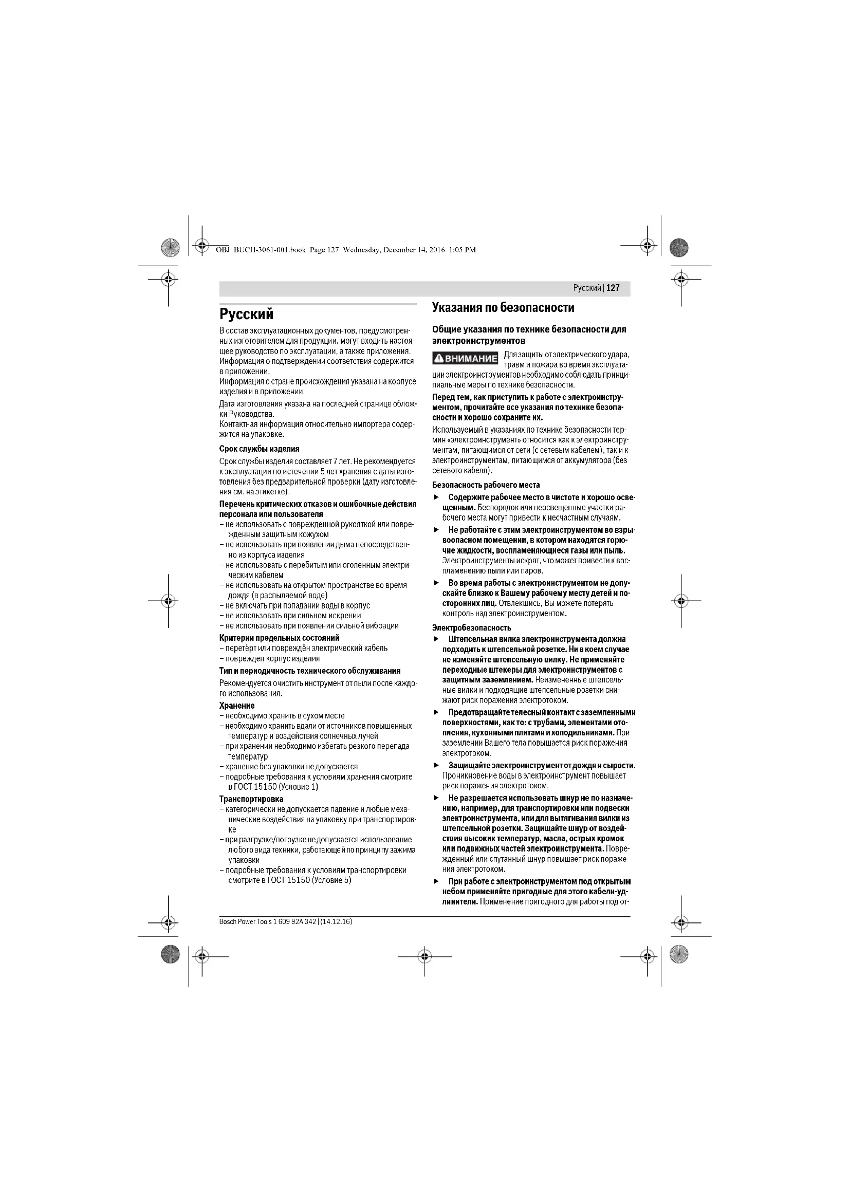 – подробные требования к условиям транспортировки смотрите в ГОСТ 15150 (Условие 5) Указания по безопасности Общие указания по технике безопасности для электроинструментов Для защиты от электрического удара, травм и пожара во время эксплуата- ции электроинструментов необходимо соблюдать принци- пиальные меры по технике безопасности. Перед тем, как приступить к работе с электроинстру- ментом, прочитайте все указания по технике безопа- сности и хорошо сохраните их. Используемый в указаниях по технике безопасности тер- мин «электроинструмент» относится как к электроинстру- ментам, питающимся от сети (с сетевым кабелем), так и к электроинструментам, питающимся от аккумулятора (без сетевого кабеля). Безопасность рабочего места Содержите рабочее место в чистоте и хорошо осве- щенным. Беспорядок или неосвещенные участки ра- бочего места могут привести к несчастным случаям. Не работайте с этим электроинструментом во взры- воопасном помещении, в котором находятся горю- чие жидкости, воспламеняющиеся газы или пыль. Электроинструменты искрят, что может привести к вос- пламенению пыли или паров. Во время работы с электроинструментом не допу- скайте близко к Вашему рабочему месту детей и по- сторонних лиц. Отвлекшись, Вы можете потерять контроль над электроинструментом. Электробезопасность Штепсельная вилка электроинструмента должна подходить к штепсельной розетке. Ни в коем случае не изменяйте штепсельную вилку. Не применяйте переходные штекеры для электроинструментов с защитным заземлением. Неизмененные штепсель- ные вилки и подходящие штепсельные розетки сни- жают риск поражения электротоком. Предотвращайте телесный контакт с заземленными поверхностями, как то: с трубами, элементами ото- пления, кухонными плитами и холодильниками. При заземлении Вашего тела повышается риск поражения электротоком. Защищайте электроинструмент от дождя и сырости. Проникновение воды в электроинструмент повышает риск поражения электротоком. Не разрешается использовать шнур не по назначе- нию, например, для транспортировки или подвески электроинструмента, или для вытягивания вилки из штепсельной розетки. Защищайте шнур от воздей- ствия высоких температур, масла, острых кромок или подвижных частей электроинструмента. Повре- жденный или спутанный шнур повышает риск пораже- ния электротоком. При работе с электроинструментом под открытым небом применяйте пригодные для этого кабели-уд- линители. Применение пригодного для работы под от- OBJ_BUCH-3061-001.book Page 127 Wednesday, December 14, 2016 1:05 PM128 | Русский 1 609 92A 342 | (14.12.16) Bosch Power Tools крытым небом кабеля-удлинителя снижает риск пора- жения электротоком. Если невозможно избежать применения электроин- струмента в сыром помещении, подключайте элек- троинструмент через устройство защитного отклю- чения. Применение устройства защитного отключения снижает риск электрического поражения. Безопасность людей Будьте внимательными, следите за тем, что Вы де- лаете, и продуманно начинайте работу с электро- инструментом. Не пользуйтесь электроинстру- ментом в усталом состоянии или если Вы нахо- дитесь в состоянии наркотического или алкогольно- го опьянения или под воздействием лекарств. Один момент невнимательности при работе с электроинстру- ментом может привести к серьезным травмам. Применяйте средства индивидуальной защит