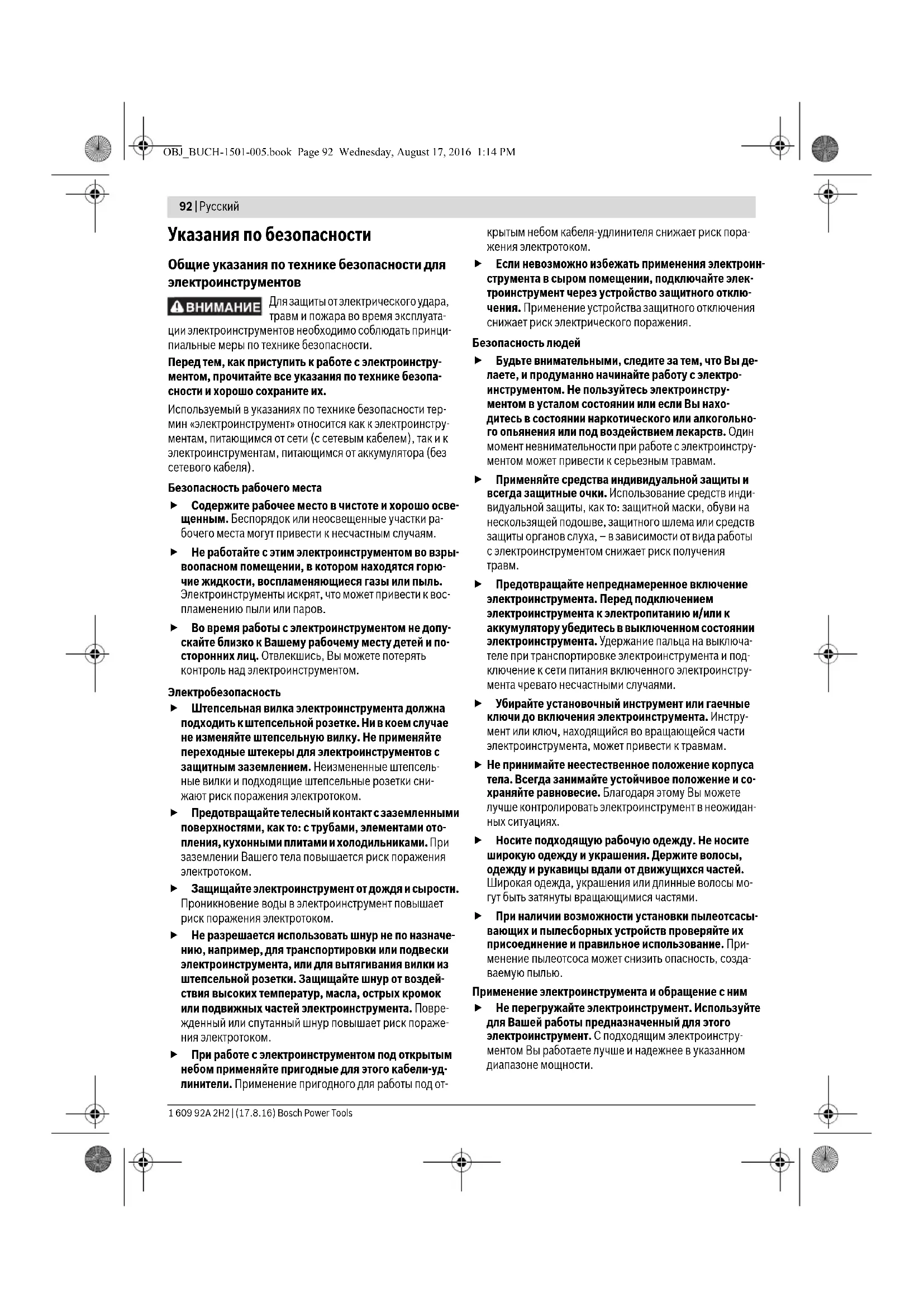– подробные требования к условиям транспортировки смотрите в ГОСТ 15150 (Условие 5) OBJ_BUCH-1501-005.book Page 91 Wednesday, August 17, 2016 1:14 PM92 | Русский 1 609 92A 2H2 | (17.8.16) Bosch Power Tools Указания по безопасности Общие указания по технике безопасности для электроинструментов Для защиты от электрического удара, травм и пожара во время эксплуата- ции электроинструментов необходимо соблюдать принци- пиальные меры по технике безопасности. Перед тем, как приступить к работе с электроинстру- ментом, прочитайте все указания по технике безопа- сности и хорошо сохраните их. Используемый в указаниях по технике безопасности тер- мин «электроинструмент» относится как к электроинстру- ментам, питающимся от сети (с сетевым кабелем), так и к электроинструментам, питающимся от аккумулятора (без сетевого кабеля). Безопасность рабочего места Содержите рабочее место в чистоте и хорошо осве- щенным. Беспорядок или неосвещенные участки ра- бочего места могут привести к несчастным случаям. Не работайте с этим электроинструментом во взры- воопасном помещении, в котором находятся горю- чие жидкости, воспламеняющиеся газы или пыль. Электроинструменты искрят, что может привести к вос- пламенению пыли или паров. Во время работы с электроинструментом не допу- скайте близко к Вашему рабочему месту детей и по- сторонних лиц. Отвлекшись, Вы можете потерять контроль над электроинструментом. Электробезопасность Штепсельная вилка электроинструмента должна подходить к штепсельной розетке. Ни в коем случае не изменяйте штепсельную вилку. Не применяйте переходные штекеры для электроинструментов с защитным заземлением. Неизмененные штепсель- ные вилки и подходящие штепсельные розетки сни- жают риск поражения электротоком. Предотвращайте телесный контакт с заземленными поверхностями, как то: с трубами, элементами ото- пления, кухонными плитами и холодильниками. При заземлении Вашего тела повышается риск поражения электротоком. Защищайте электроинструмент от дождя и сырости. Проникновение воды в электроинструмент повышает риск поражения электротоком. Не разрешается использовать шнур не по назначе- нию, например, для транспортировки или подвески электроинструмента, или для вытягивания вилки из штепсельной розетки. Защищайте шнур от воздей- ствия высоких температур, масла, острых кромок или подвижных частей электроинструмента. Повре- жденный или спутанный шнур повышает риск пораже- ния электротоком. При работе с электроинструментом под открытым небом применяйте пригодные для этого кабели-уд- линители. Применение пригодного для работы под от- крытым небом кабеля-удлинителя снижает риск пора- жения электротоком. Если невозможно избежать применения электроин- струмента в сыром помещении, подключайте элек- троинструмент через устройство защитного отклю- чения. Применение устройства защитного отключения снижает риск электрического поражения. Безопасность людей Будьте внимательными, следите за тем, что Вы де- лаете, и продуманно начинайте работу с электро- инструментом. Не пользуйтесь электроинстру- ментом в усталом состоянии или если Вы нахо- дитесь в состоянии наркотического или алкогольно- го опьянения или под воздействием лекарств. Один момент невнимательности при работе с электроинстру- ментом может привести к серьезным травмам. Применяйте средства индивидуальной защиты и 