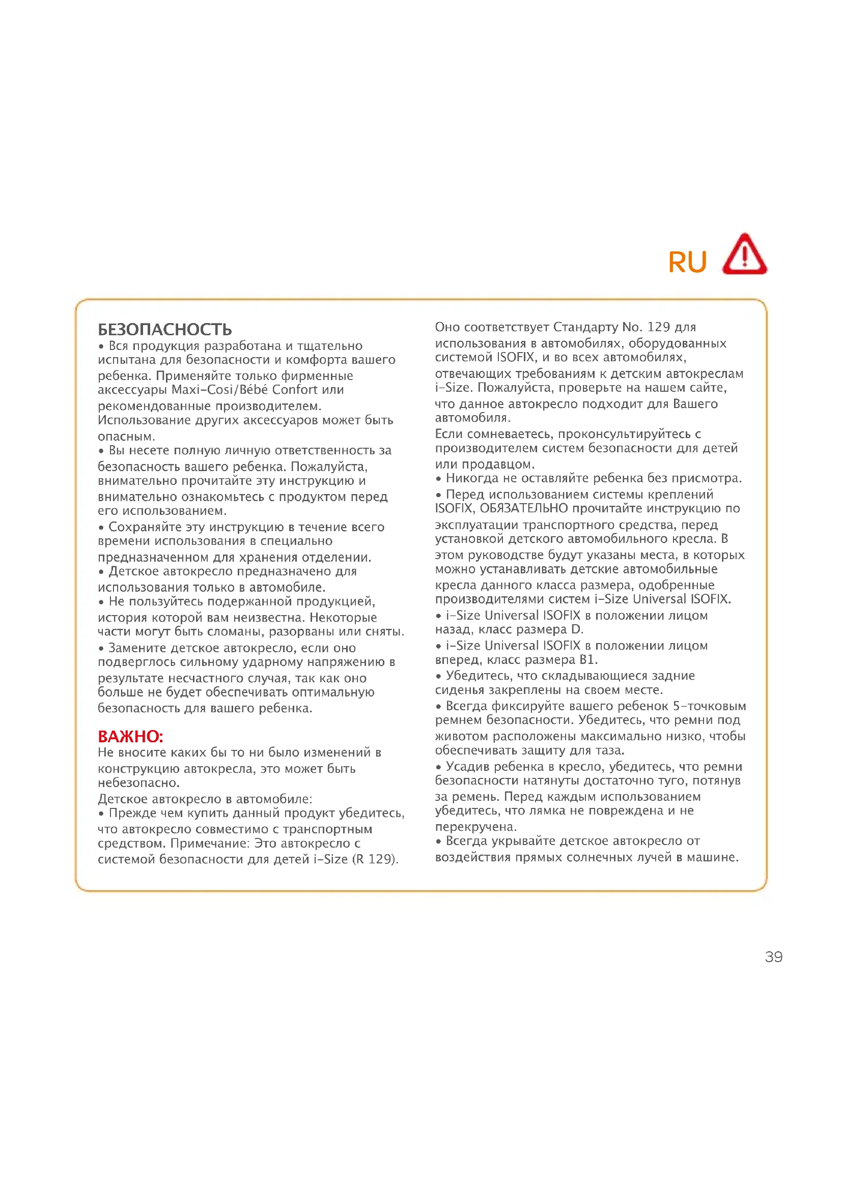 - Это детское кресло является эффективным только при условии соблюдения всех инструкций по использованию. RU41