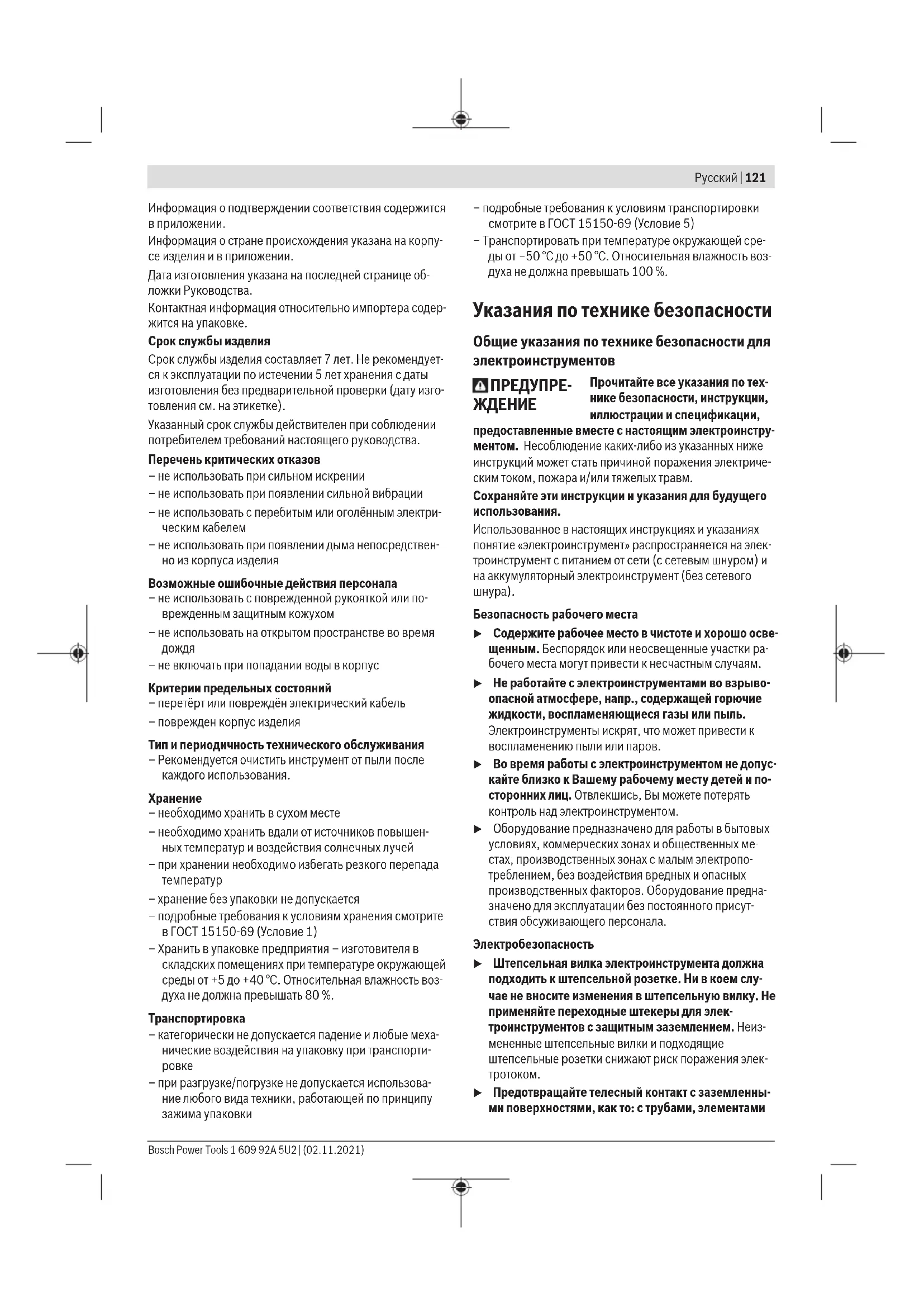 Toлько для стран Евразийского экономического союза (Таможенного союза) В состав эксплуатационных документов, предусмотрен- ных изготовителем для продукции, могут входить настоя- щее руководство по эксплуатации, а также приложения. 1 609 92A 5U2 | (02.11.2021) Bosch Power ToolsРусский | 121 Информация о подтверждении соответствия содержится в приложении. Информация о стране происхождения указана на корпу- се изделия и в приложении. Дата изготовления указана на последней странице об- ложки Руководства. Контактная информация относительно импортера содер- жится на упаковке. Срок службы изделия Срок службы изделия составляет 7 лет. Не рекомендует- ся к эксплуатации по истечении 5 лет хранения с даты изготовления без предварительной проверки (дату изго- товления см. на этикетке). Указанный срок службы действителен при соблюдении потребителем требований настоящего руководства. Перечень критических отказов – не использовать при сильном искрении – не использовать при появлении сильной вибрации – не использовать с перебитым или оголённым электри- ческим кабелем – не использовать при появлении дыма непосредствен- но из корпуса изделия Возможные ошибочные действия персонала – не использовать с поврежденной рукояткой или по- врежденным защитным кожухом – не использовать на открытом пространстве во время