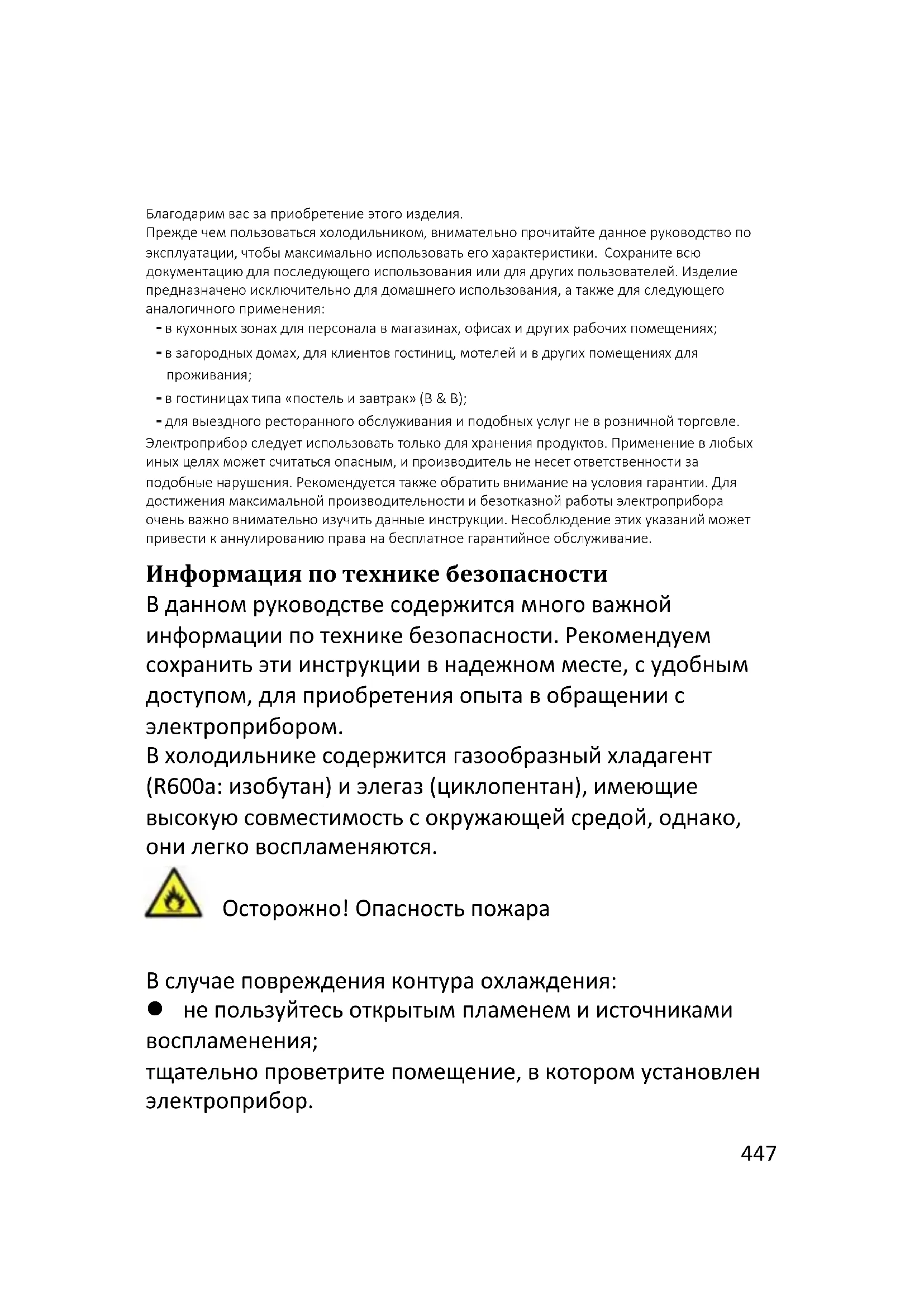 Благодарим вас за приобретение этого изделия. Прежде чем пользоваться холодильником, внимательно прочитайте данное руководство по эксплуатации, чтобы максимально использовать его характеристики. Сохраните всю документацию для последующего использования или для других пользователей. Изделие предназначено исключительно для домашнего использования, а также для следующего аналогичного применения: - в кухонных зонах для персонала в магазинах, офисах и других рабочих помещениях; - в загородных домах, для клиентов гостиниц, мотелей и в других помещениях для проживания; - в гостиницах типа «постель и завтрак» (B & B); - для выездного ресторанного обслуживания и подобных услуг не в розничной торговле. Электроприбор следует использовать только для хранения продуктов. Применение в любых иных целях может считаться опасным, и производитель не несет ответственности за подобные нарушения. Рекомендуется также обратить внимание на условия гарантии. Для достижения максимальной производительности и безотказной работы электроприбора очень важно внимательно изучить данные инструкции. Несоблюдение этих указаний может привести к аннулированию права на бесплатное гарантийное обслуживание. Информация по технике безопасности В данном руководстве содержится много важной информации по технике безопасности. Рекомендуем сохранить эти инструкции в надежном месте, с удобным доступом, для приобретения опыта в обращении с электроприбором. В холодильнике содержится газообразный хладагент (R600a: изобутан) и элегаз (циклопентан), имеющие высокую совместимость с окружающей средой, однако, они легко воспламеняются. Осторожно! Опасность пожара В случае повреждения контура охлаждения: не пользуйтесь открытым пламенем и источниками воспламенения; тщательно проветрите помещение, в котором установлен электроприбор.448 Процент времени работы:8℃: