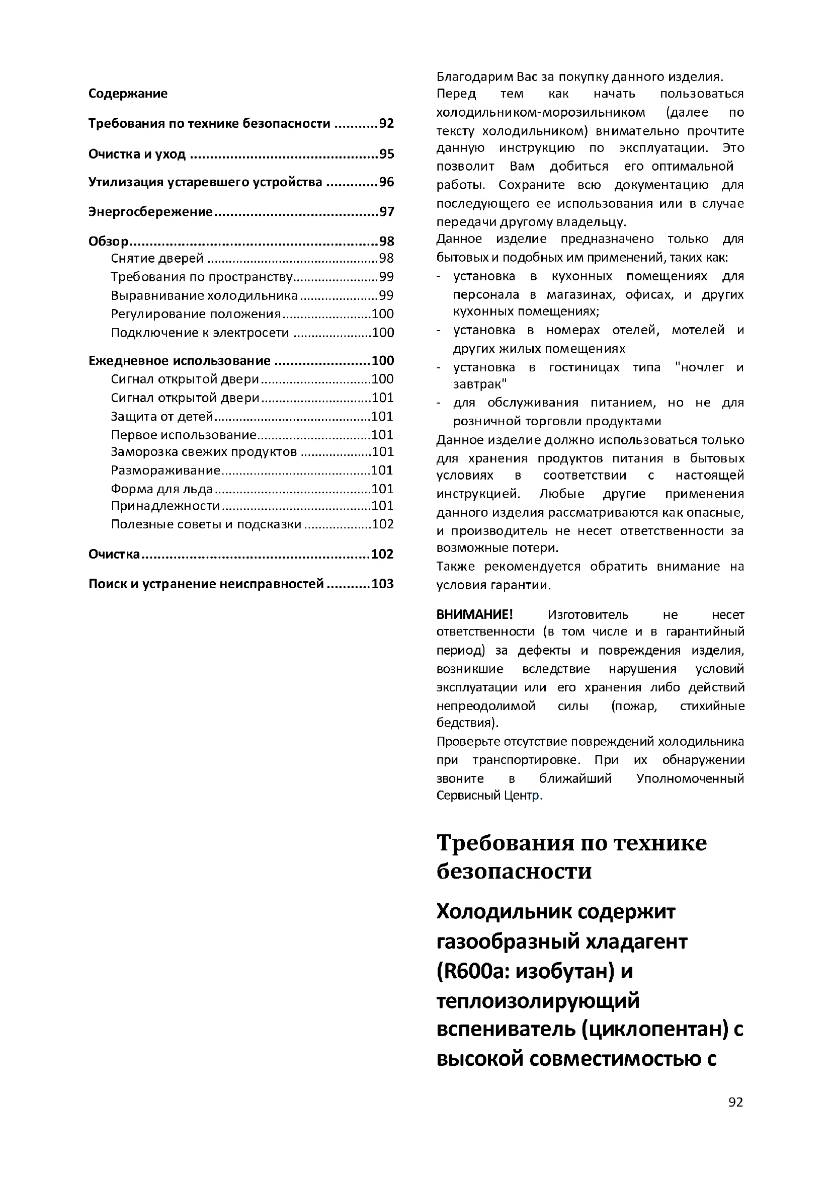 Проверьте отсутствие повреждений холодильника при транспортировке. При их обнаружении звоните в ближайший Уполномоченный Сервисный Центр. Требования по технике безопасности Холодильник содержит газообразный хладагент (R600a: изобутан) и теплоизолирующий вспениватель (циклопентан) с высокой совместимостью с93 окружающей средой, которые однако, являются горючими. Для предотвращения возникновения опасных ситуаций рекомендуется соблюдать следующие