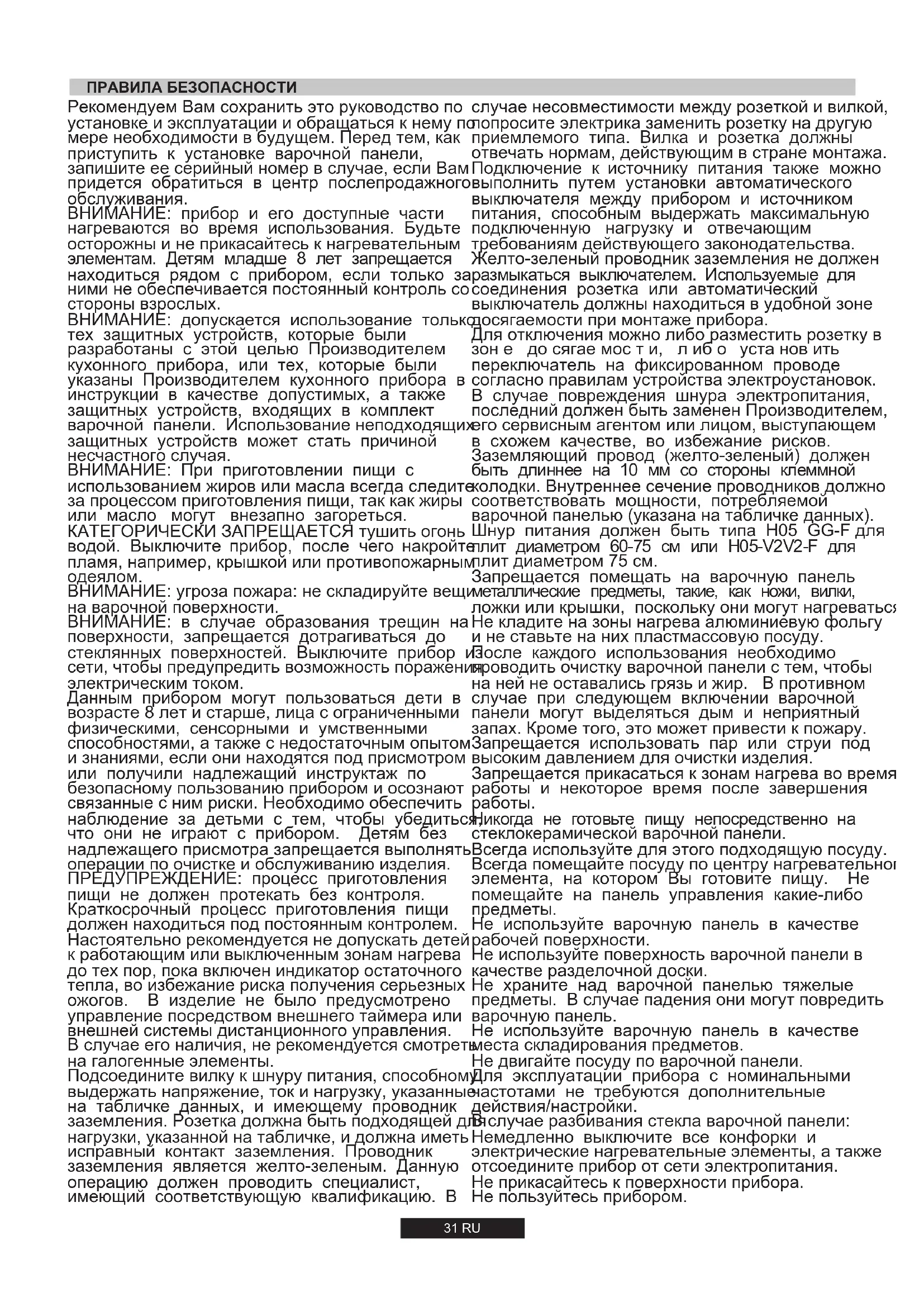 Не пользуйтесь прибором. Никогда не готовьте пищу непосредственно на стеклокерамической варочной панели. Запрещается помещать на варочную панель металлические предметы, такие, как ножи, вилки, ложки или крышки, поскольку они могут нагреваться. случае несовместимости между розеткой и вилкой, попросите электрика заменить розетку на другую приемлемого типа. Вилка и розетка должны отвечать нормам, действующим в стране монтажа. Подключение к источнику питания также можно выполнить путем установки автоматического выключателя между прибором и источником питания, способным выдержать максимальную подключенную нагрузку и отвечающим требованиям действующего законодательства. Всегда используйте для этого подходящую посуду. Не кладите на зоны нагрева алюминиевую фольгу и не ставьте на них пластмассовую посуду. Не двигайте посуду по варочной панели. Для эксплуатации прибора с номинальными частотами не требуются дополнительные действия/настройки.1.2. ВЫБОР МЕСТА ДЛЯ УСТАНОВКИ ВАРОЧНОЙ ПОВЕРХНОСТИ Вытяжной вентилятор должен иметь мощность, достаточную для того, чтобы воздух в кухне полностью заменялся 3-5 раз в час. Установка должна выполняться в соответствии с требованиями национальных правил и норм. В местах, где установлены газовые плиты, выделяется тепло и влага. Поэтому вы должны обеспечить хорошую вентиляцию в помещении либо с помощью отверстий для естественной вентиляции, либо с помощью электрической вытяжки. При интенсивной и продолжительной эксплуатации плиты может потребоваться дополнительная вентиляция, обеспечиваемая, например, с помощью открывания окна, и проветривания помещения или с помощью увеличения скорости вращения электрического вентилятора системы принудительной вентиляции (если он установлен). Если нет возможности установить вытяжной колпак, то в стене или в оконном проеме нужно установить электрический втяжной вентилятор. Данный бытовой прибор должен устанавливаться в соответствии с действующими правилами, и только в хорошо проветриваемых помещениях. Перед установкой или использованием бытового прибора прочтите инструкцию. Данный электроприбор должен подключаться к ответвлению электросети с достаточной нагрузочной способностью. 3- штырьковая вилка/розетка на 13 А не подходит для данного подключения. В линии электропитания должен быть установлен двухполюсный выключатель, и цепь должна быть защищена с помощью плавкого предохранителя соответствующего номинала. Более подробная информация относительно требований, предъявляемых к электропитанию для конкретного изделия, представлена в инструкции по эксплуатации и в паспортной табличке, закрепленной на изделии. Если длина кабеля питания, поставляемого в комплекте с варочной поверхностью, является Внимание данный электроприбор должен быть заземлен Данный электроприбор предназначен только для бытовых применений. Подключение к электросети должно выполняться только опытным электриком с соблюдением всех действующих привил и норм электробезопасности.