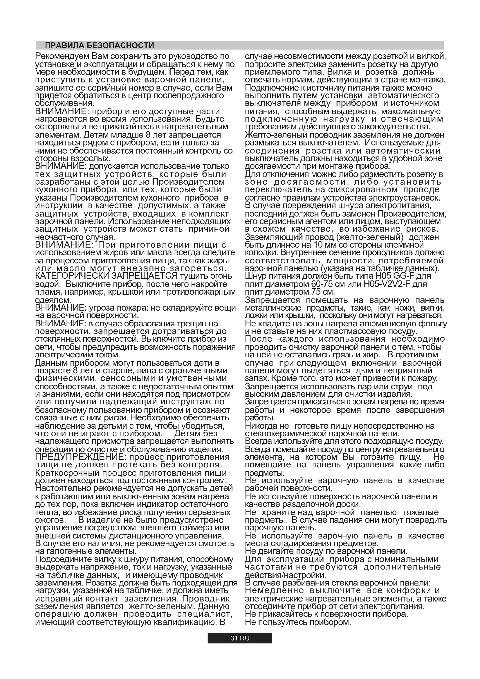 ВНИМАНИЕ: допускается использование только тех защитных устройств, которые были разработаны с этой целью Производителем кухонного прибора, или тех, которые были указаны Производителем кухонного прибора в инструкции в качестве допустимых, а также защитных устройств, входящих в комплект варочной панели. Использование неподходящих защитных устройств может стать причиной несчастного случая. Настоятельно рекомендуется не допускать детей к работающим или выключенным зонам нагрева до тех пор, пока включен индикатор остаточного тепла, во избежание риска получения серьезных ожогов. В изделие не было предусмотрено управление посредством внешнего таймера или внешней системы дистанционного управления. Подсоедините вилку к шнуру питания, способному выдержать напряжение, ток и нагрузку, указанные на табличке данных, и имеющему проводник заземления. Розетка должна быть подходящей для нагрузки, указанной на табличке, и должна иметь исправный контакт заземления. Проводник заземления является желто-зеленым. Данную операцию должен проводить специалист, имеющий соответствующую квалификацию. В ПРАВИЛА БЕЗОПАСНОСТИ После каждого использования необходимо проводить очистку варочной панели с тем, чтобы на ней не оставались грязь и жир. В противном случае при следующем включении варочной панели могут выделяться дым и неприятный запах. Кроме того, это может привести к пожару. Не используйте поверхность варочной панели в качестве разделочной доски. Запрещается прикасаться к зонам нагрева во время работы и некоторое время после завершения