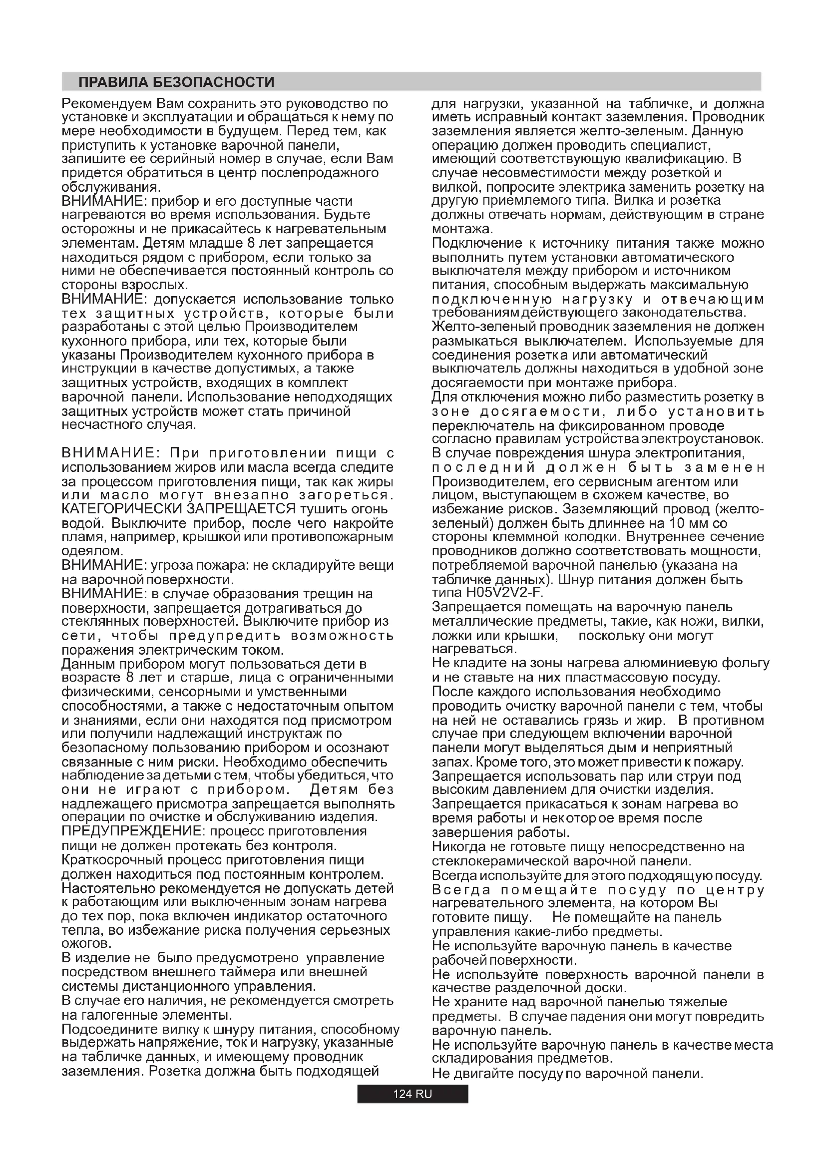 ПРЕДУПРЕЖДЕНИЕ: процесс приготовления пищи не должен протекать без контроля. Краткосрочный процесс приготовления пищи должен находиться под постоянным контролем. Рекомендуем Вам сохранить это руководство по установке и эксплуатации и обращаться к нему по мере необходимости в будущем. Перед тем, как приступить к установке варочной панели, запишите ее серийный номер в случае, если Вам придется обратиться в центр послепродажного обслуживания. ВНИМАНИЕ: допускается использование только тех защитных устройств, которые были разработаны с этой целью Производителем кухонного прибора, или тех, которые были указаны Производителем кухонного прибора в инструкции в качестве допустимых, а также защитных устройств, входящих в комплект варочной панели. Использование неподходящих защитных устройств может стать причиной несчастного случая. ВНИМАНИЕ: При приготовлении пищи с использованием жиров или масла всегда следите за процессом приготовления пищи, так как жиры или масл о м о г у т в н ез а пно заго р ет ь с я . КАТЕГОРИЧЕСКИ ЗАПРЕЩАЕТСЯ тушить огонь водой. Выключите прибор, после чего накройте пламя, например, крышкой или противопожарным
